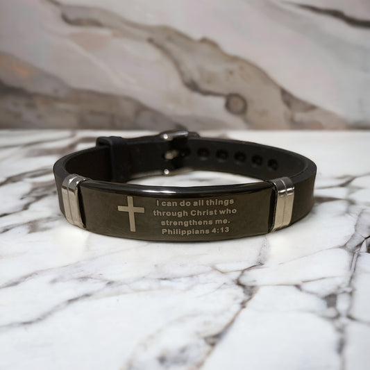 I Can Do All Things Through Christ Who Strengthens Me (Silver) Stainless Steel Black Bracelet Philippians 4:13