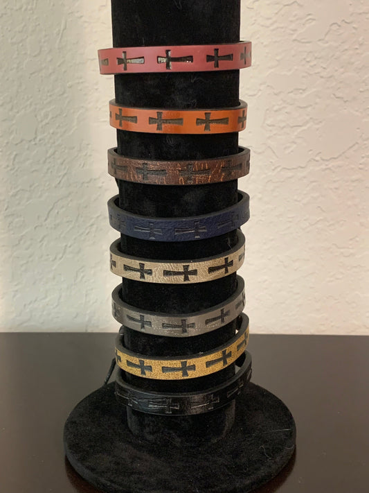 Leather Cross Bracelet, Adjustable 7 to 8.5 inches Navy Red Brown Sand Wine Black