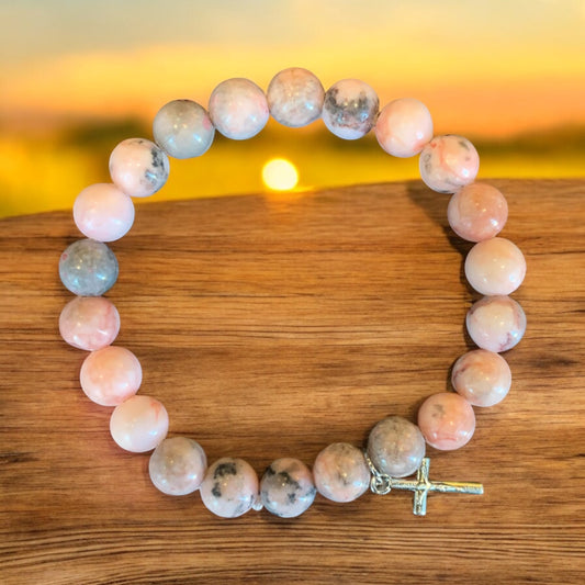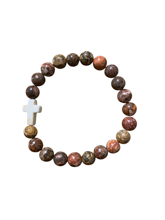 Leopard Skin Jasper Handmade Stretch Bracelet with Cross