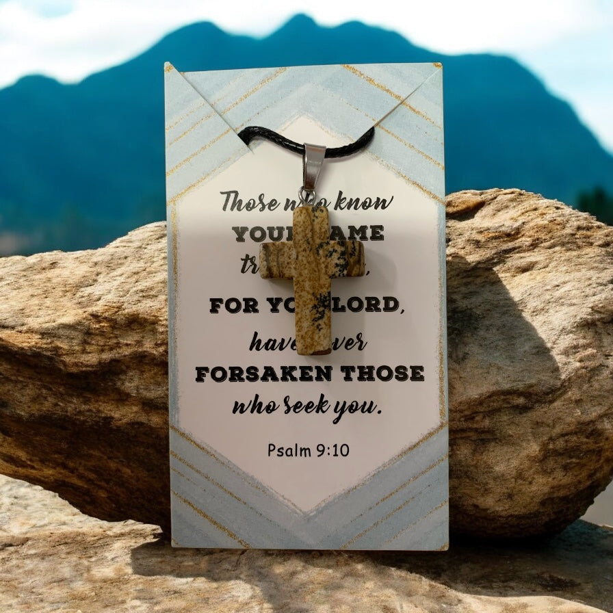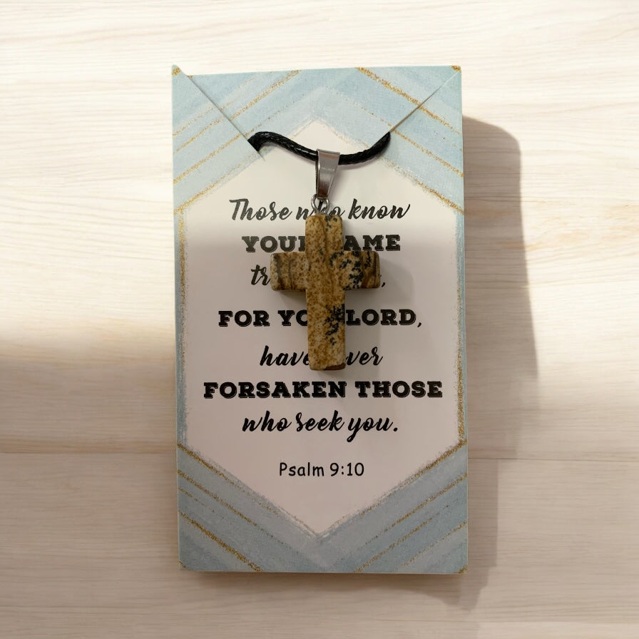 Picture Stone Handmade natural stone cross pendant with black cord in stainless steel. Chose from: amethyst, malaquite, turquoise, tiger’s eye, blue agate, obsidian, grey agate, green aventurine, rose quartz, picture stone (brown). Each cross is about 1.25 inches in length and 1.00 inches in width. Natural stone varies in color and texture. Each cross is unique
