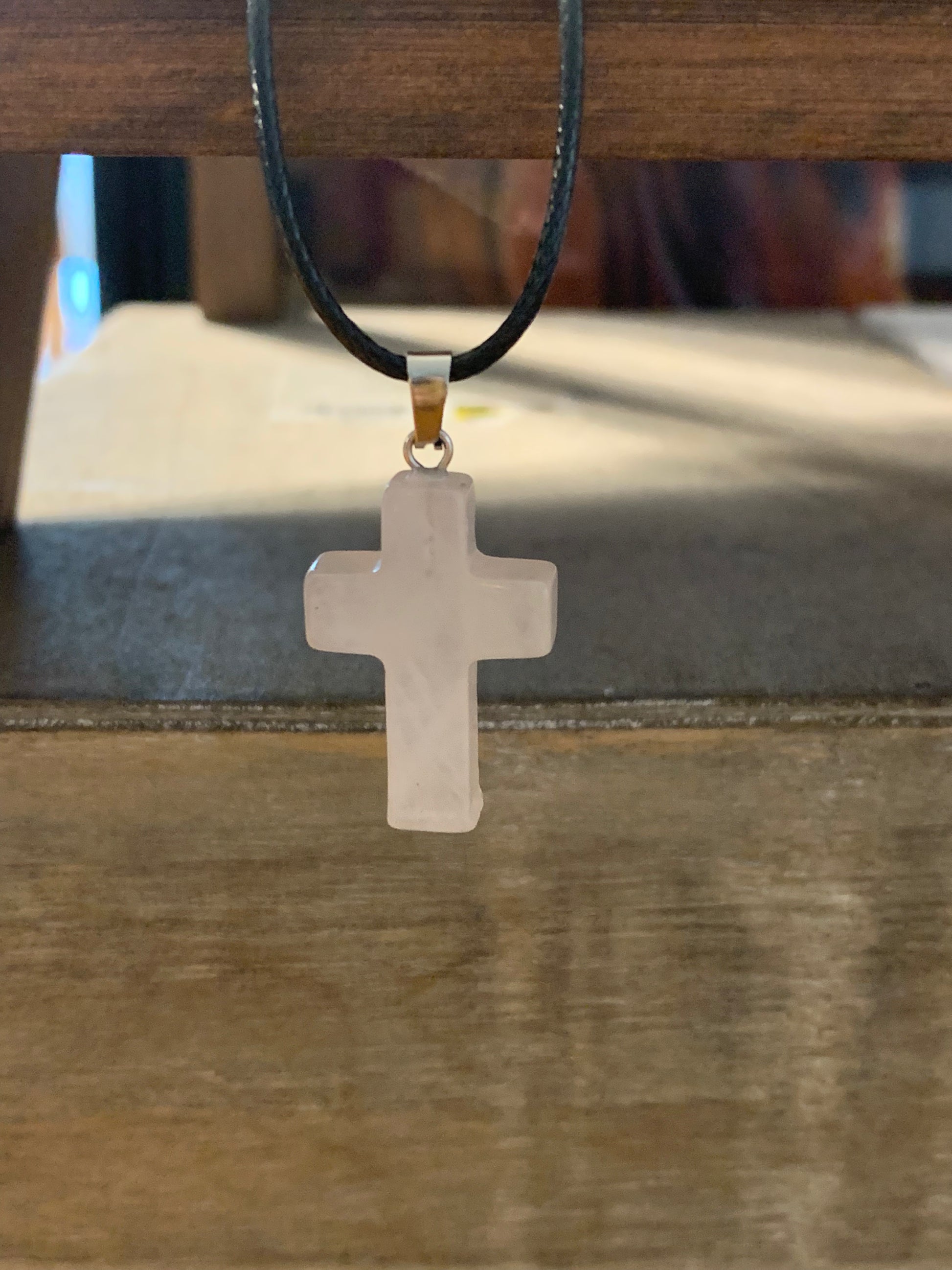 Rose Quartz Handmade natural stone cross pendant with black cord in stainless steel. Chose from: amethyst, malaquite, turquoise, tiger’s eye, blue agate, obsidian, grey agate, green aventurine, rose quartz, picture stone (brown). Each cross is about 1.25 inches in length and 1.00 inches in width. Natural stone varies in color and texture. Each cross is unique