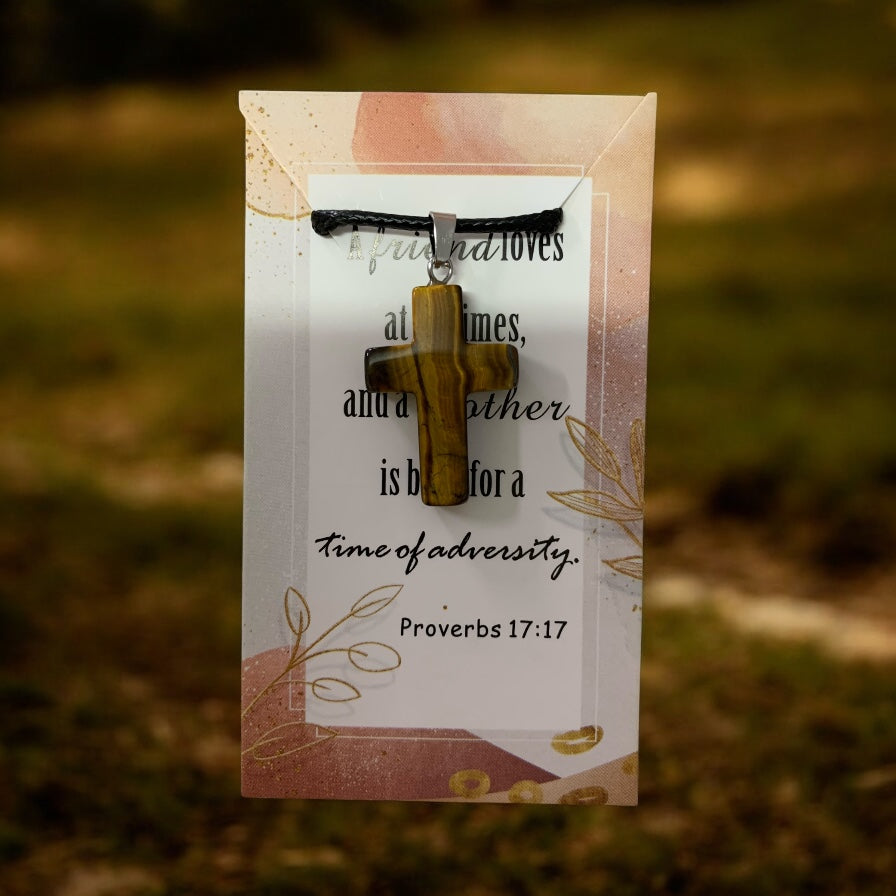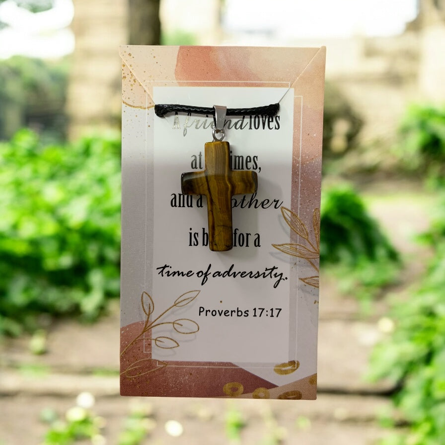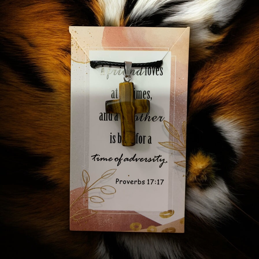 Natural Stone Cross Tiger’s Eye (Gold and Brown Color) with Black Cord in Stainless Steel