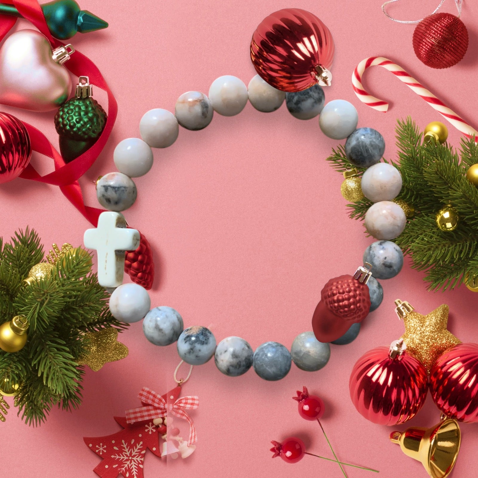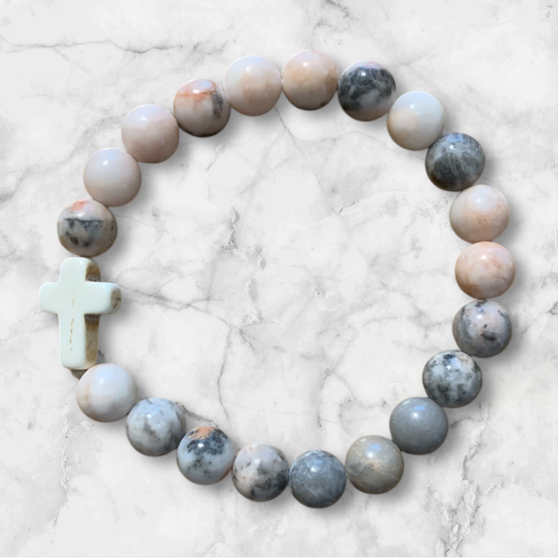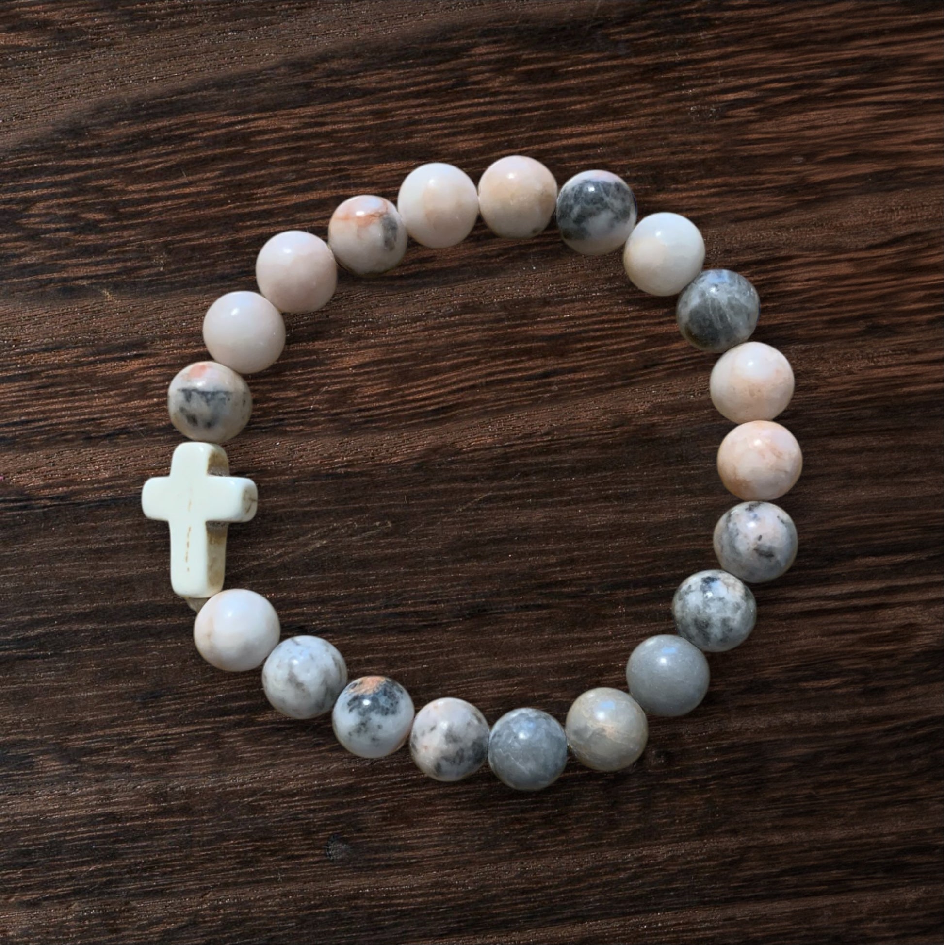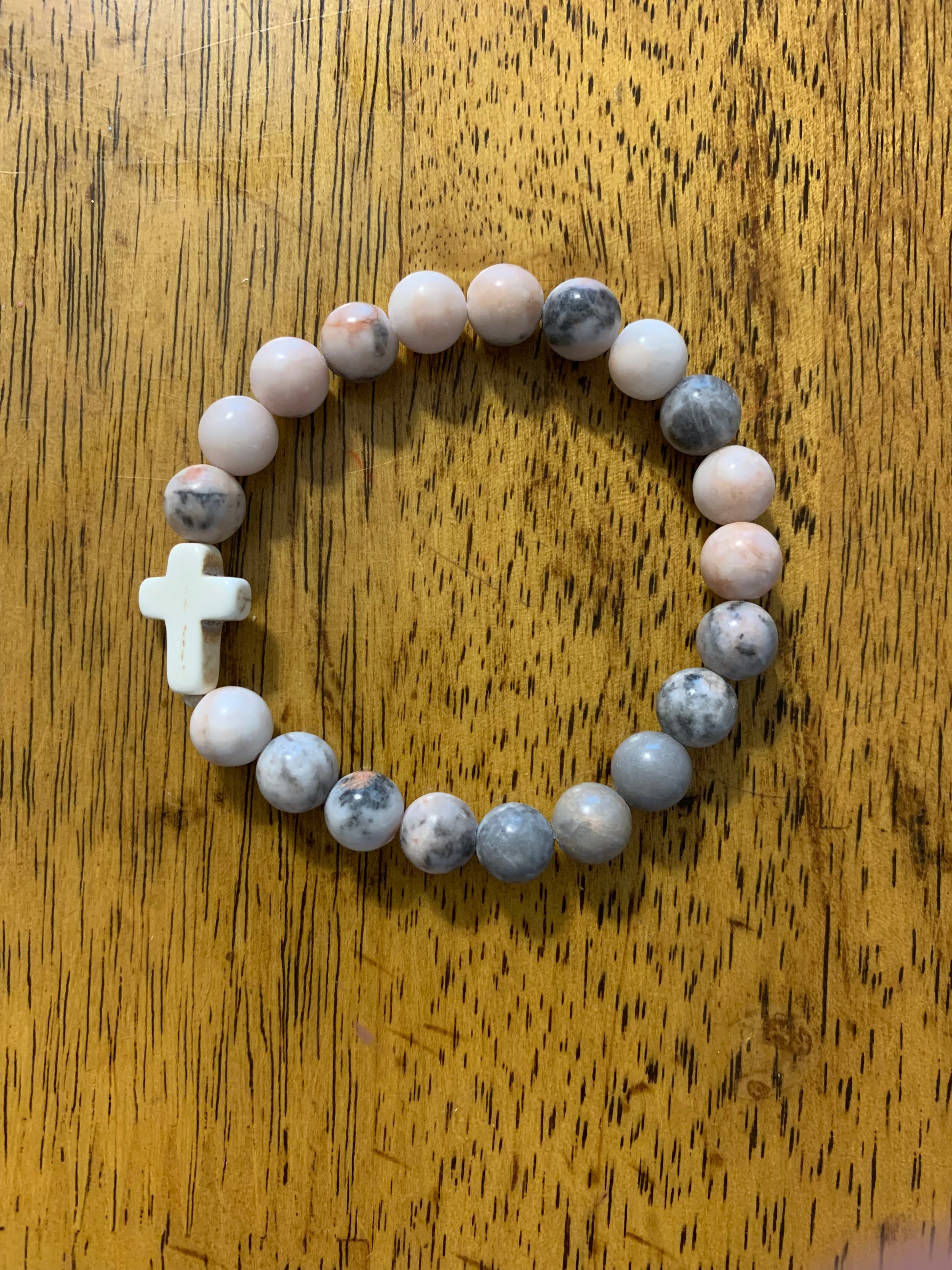 Handmade Picasso Stone Bracelet with Stone Cross. These beautiful natural stone bracelets include a faith message to remind us to always be thankful, even in difficult times. Length varies from 6 to 7 inches.