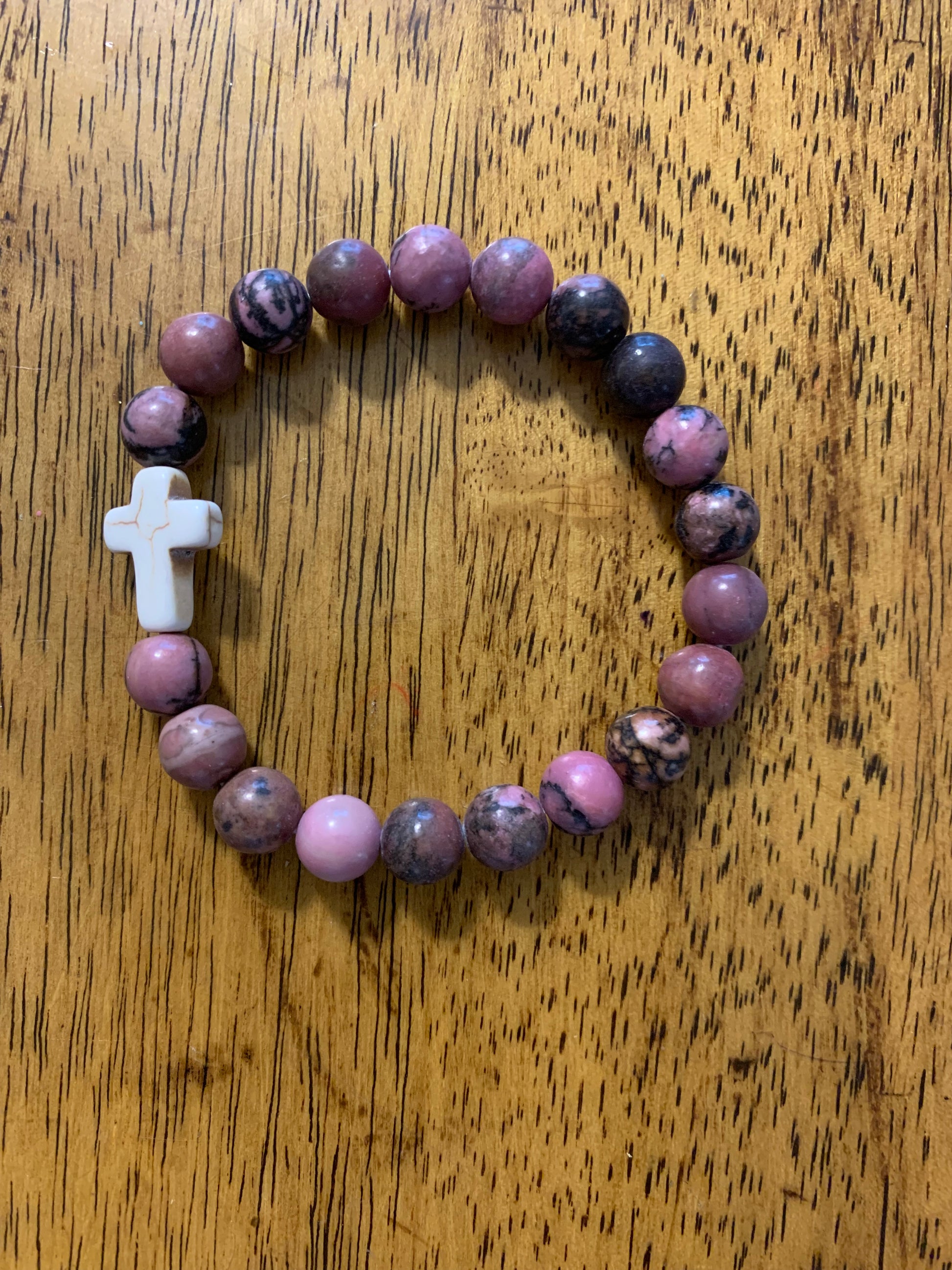 Handmade Rhodonite with Cross Natural Stone. These beautiful natural stone bracelets include a message of faith. Length varies from 6 to 7 inches.