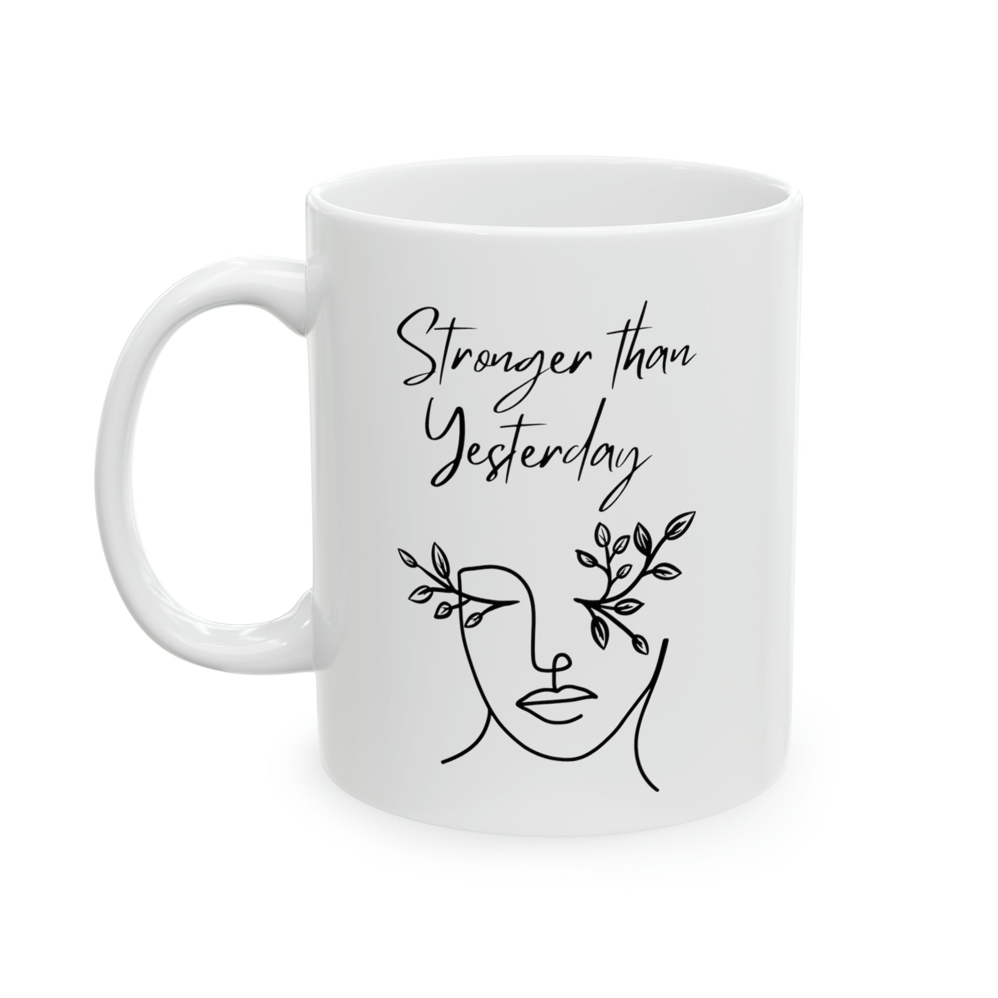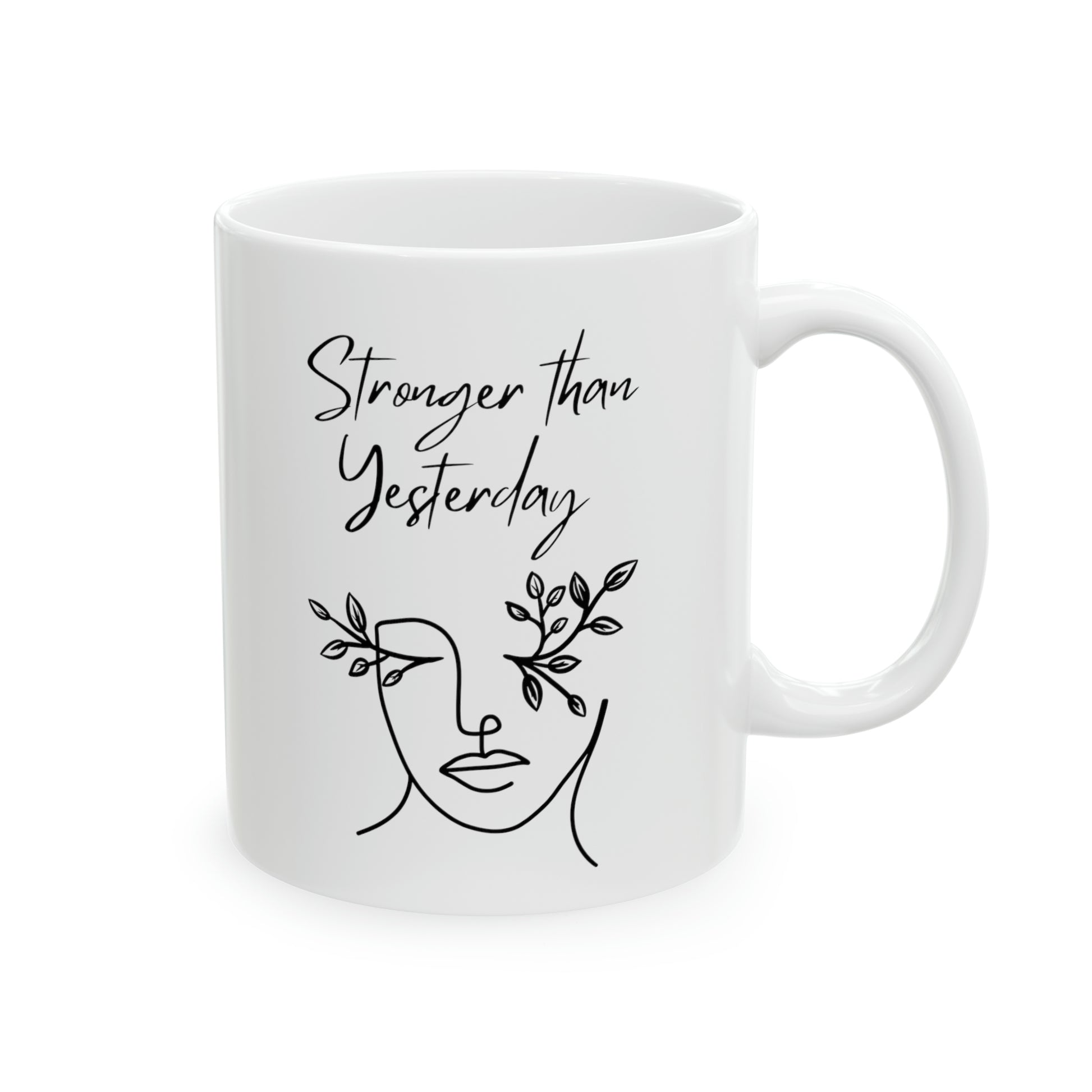 Stronger Than Yesterday Mug. It’s BPA and Lead-free, microwave & dishwasher-safe, and made of white, durable ceramic in 11-ounce size. Thanks to the advanced printing tech, your designs come to life with incredibly vivid colors – the perfect gift for coffee, tea, and chocolate lovers.