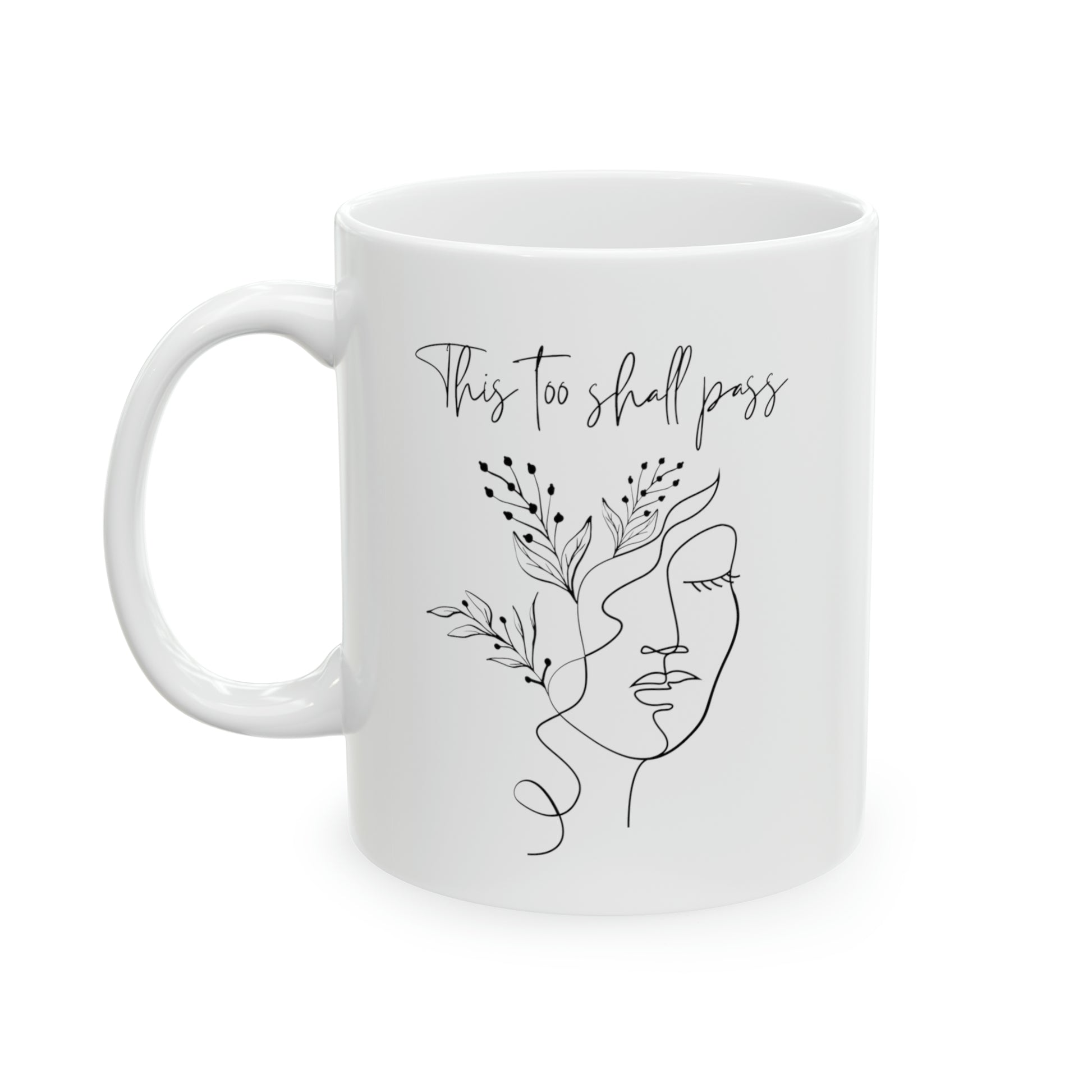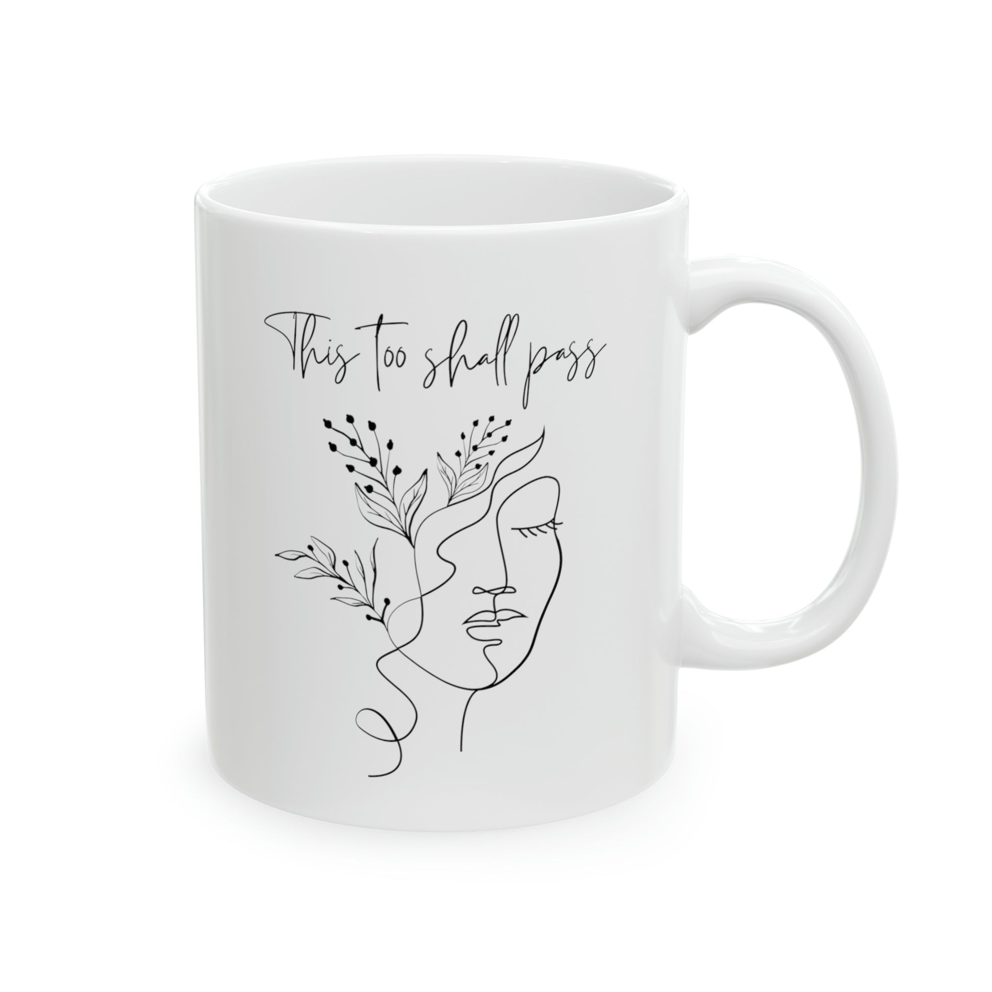 This Too Shall Pass Mug. It’s BPA and Lead-free, microwave & dishwasher-safe, and made of white, durable ceramic in 11-ounce size. Thanks to the advanced printing tech, your designs come to life with incredibly vivid colors – the perfect gift for coffee, tea, and chocolate lovers.