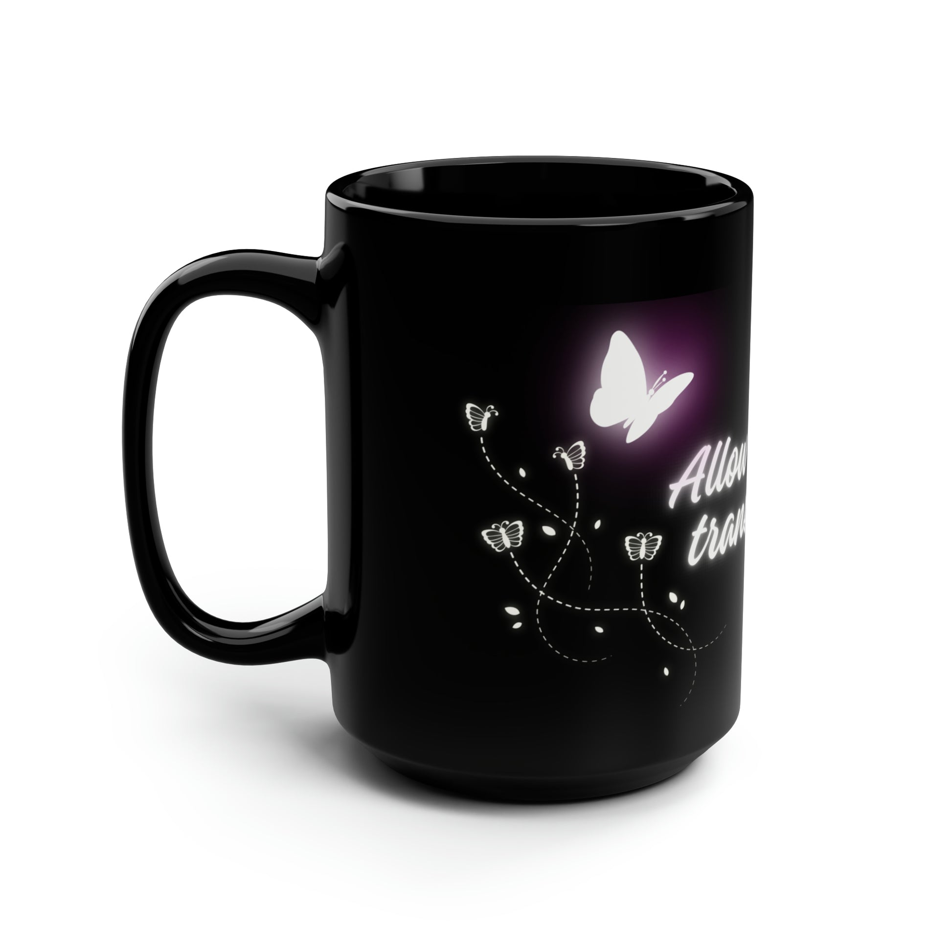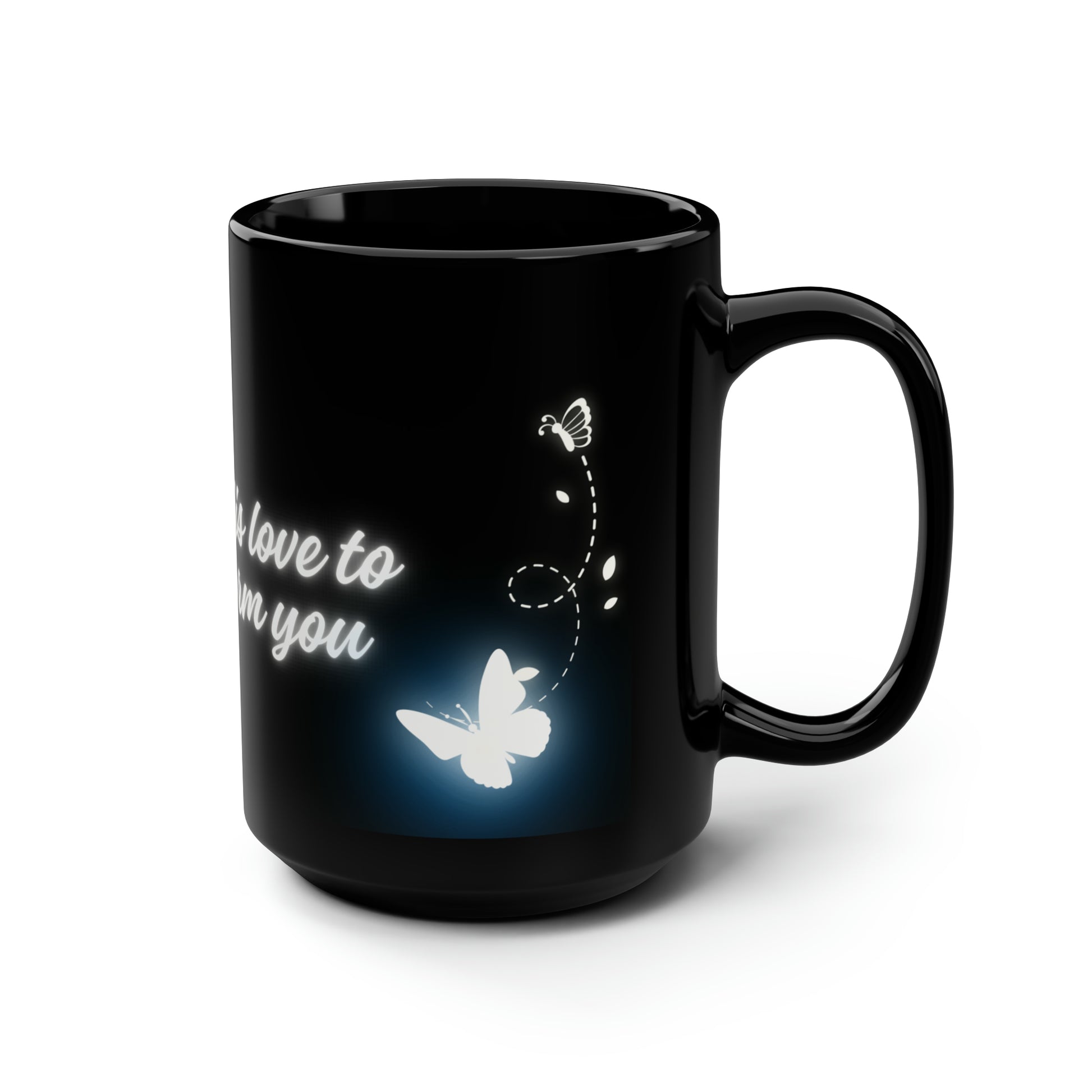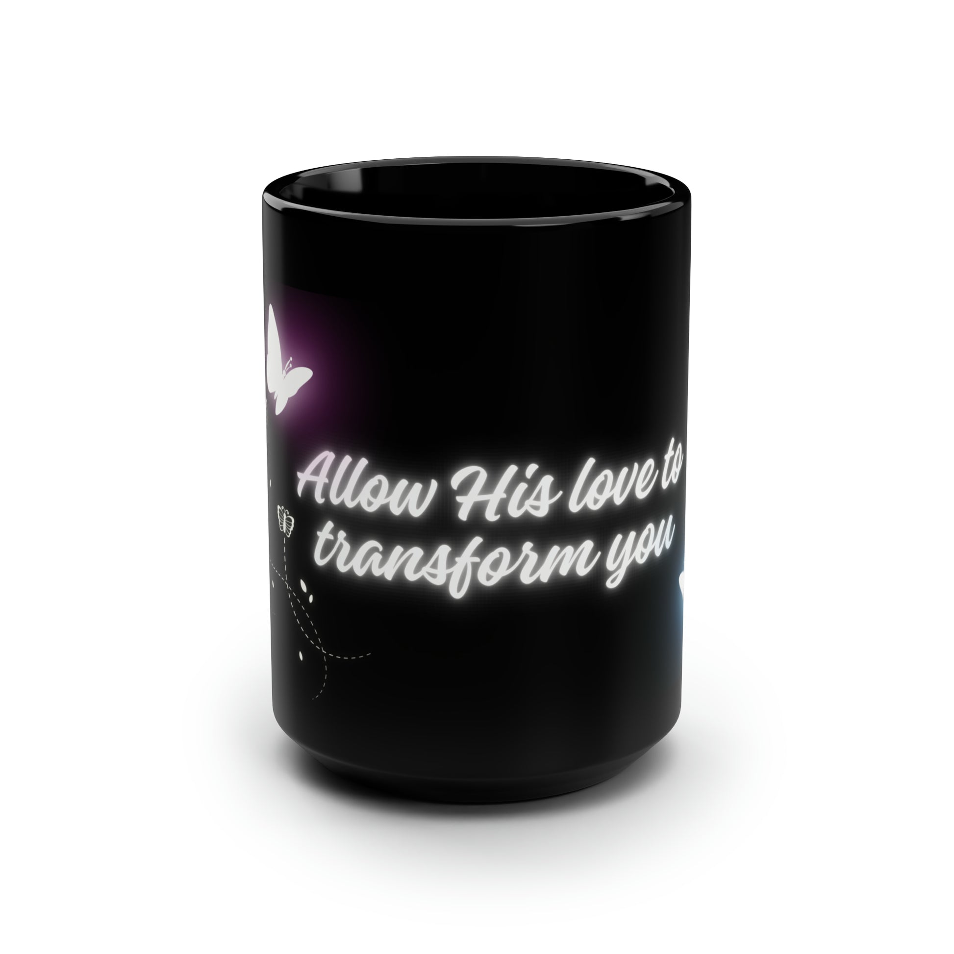 Allow His Love to Transform You Glow Butterflies Mug. These black mugs come in one size – 15oz (0.44l) – plenty for morning caffeine boosts and hot cups of tea on a rainy day. They're easy to grip and feel sturdy thanks to the C-shaped handle. Add more personality by decorating them with your original designs. They'll be printed on the black ceramic material in picture-perfect quality with a glossy finish.