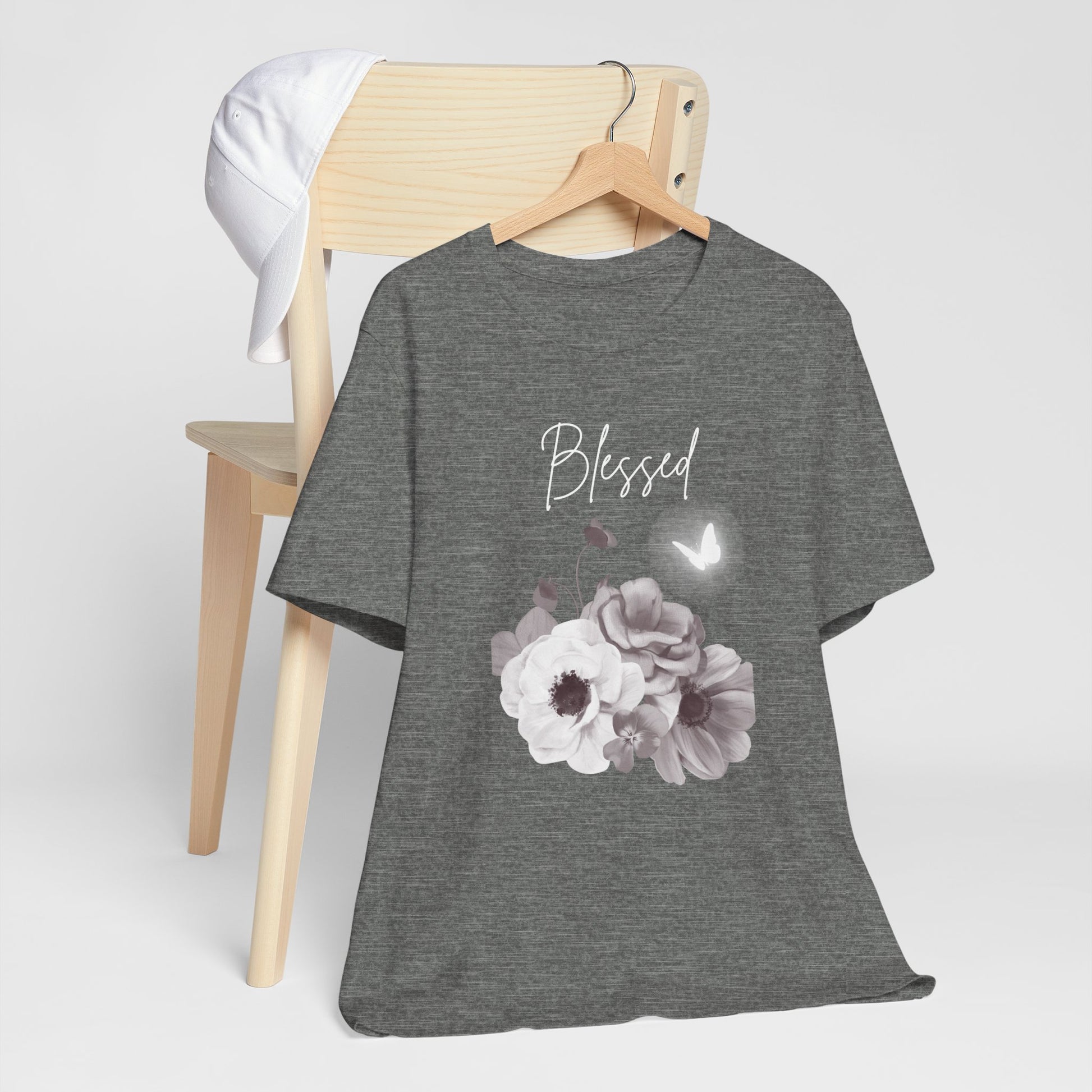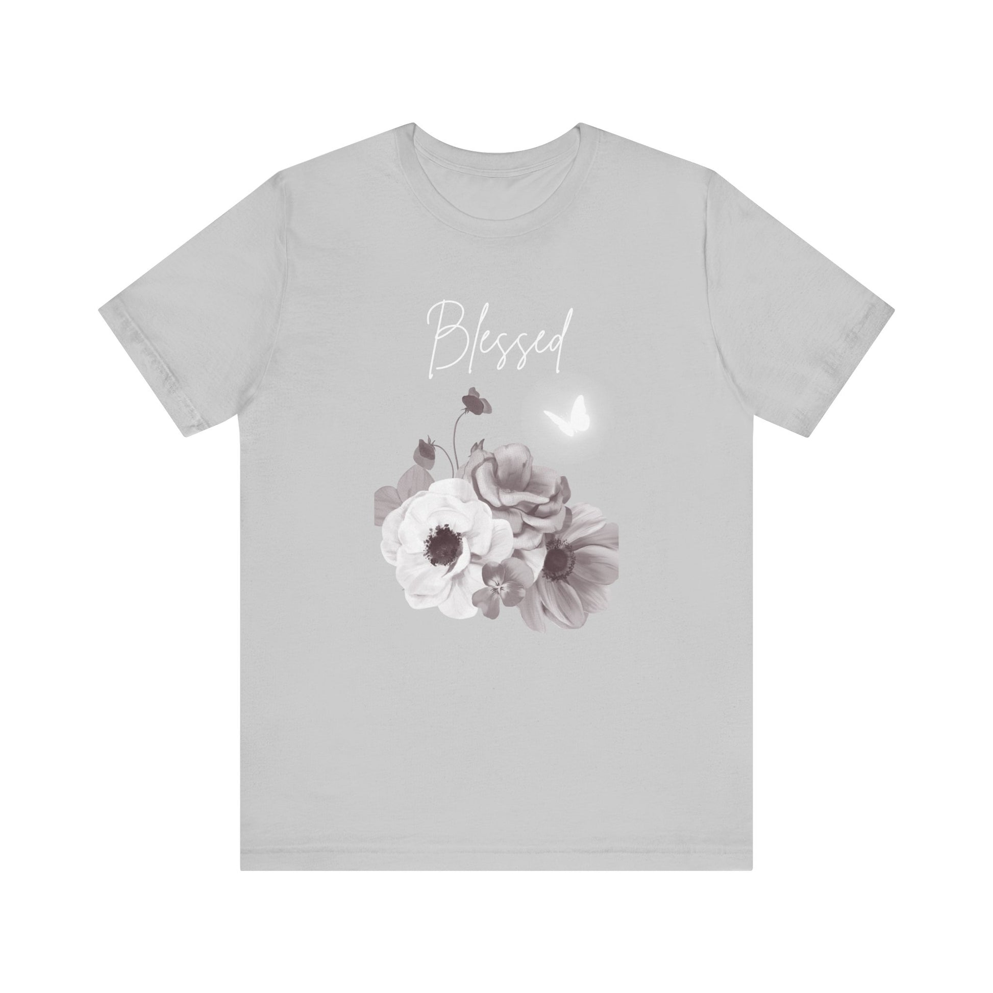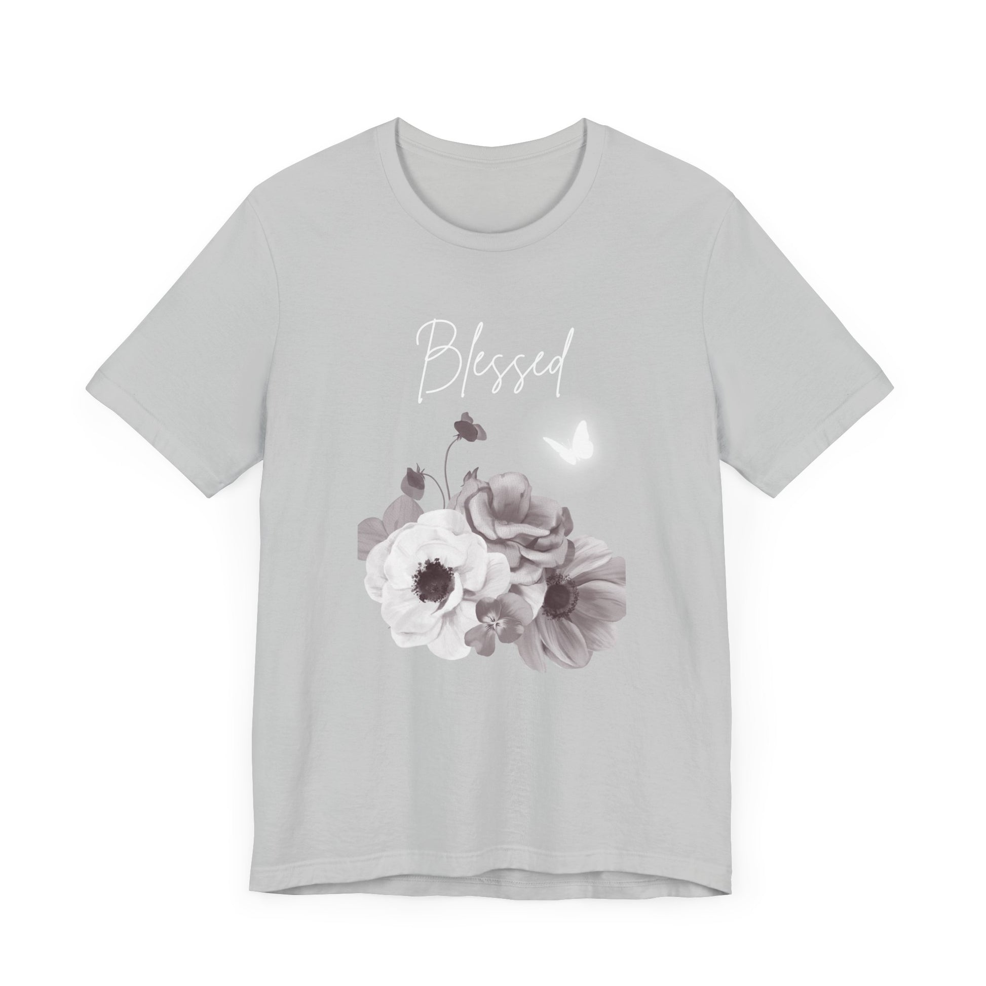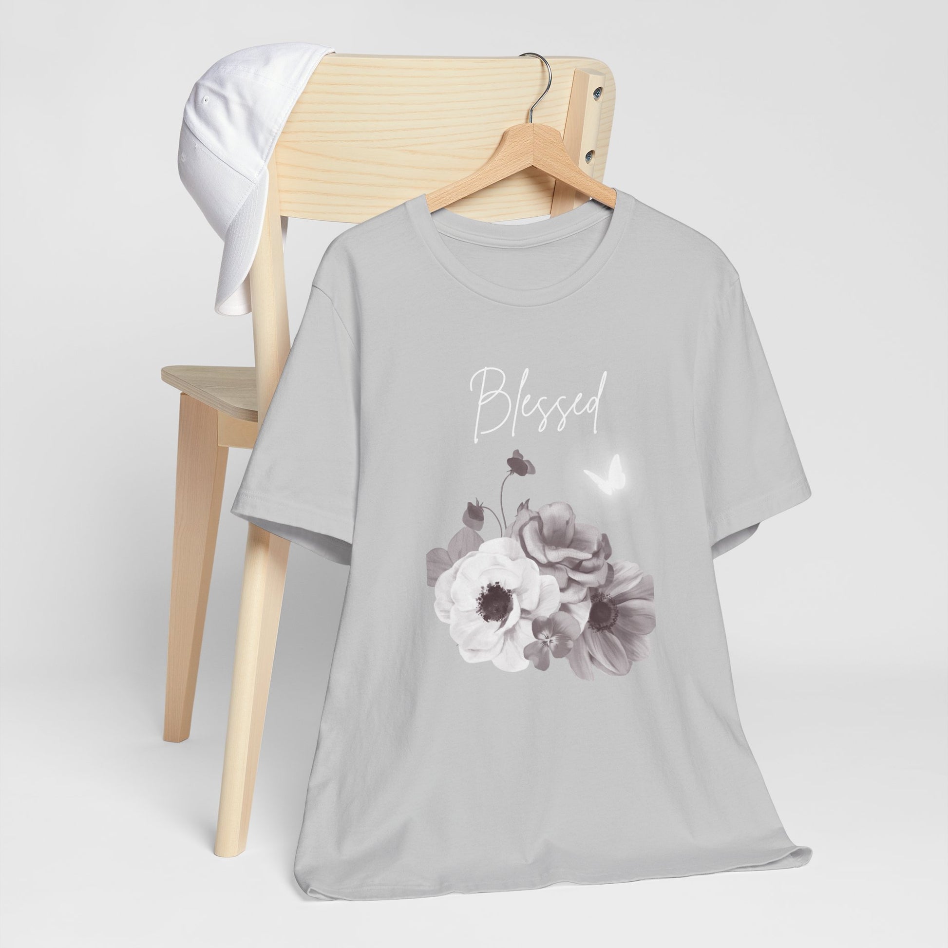 Blessed Black White Flowers with Butterfly T-shirt. This classic unisex jersey short sleeve tee fits like a well-loved favorite. Soft cotton and quality print make users fall in love with it over and over again. These t-shirts have-ribbed knit collars to bolster shaping. The shoulders are tapered for a better fit over time. Dual side seams hold the garment's shape for longer. .: Made with 100% Airlume combed and ring-spun cotton, a lightweight fabric (4.2 oz/yd² (142 g/m²)) that is easy to layer, breathable. Perfect for active and leisure wear. .: The retail fit that is perfect for casual and semi-formal settings. The crew neckline adds a classic, neat style that's perfect for accessorizing. .: Bella+Canvas manufactures all its products in the US and internationally in humane, no-sweat-shop, sustainable way and is part of the Fair Labor Association as well as Platinum WRAP certified. .: The tear-away label minimizes skin irritations. .: Fabric blends: Ash and Heather Prism colors - 99% Airlume combed and ring-spun cotton, 1% polyester; Heather colors - 52% cotton, 48% polyester; Athletic Heather and Black Heather - 90% cotton, 10% polyester.