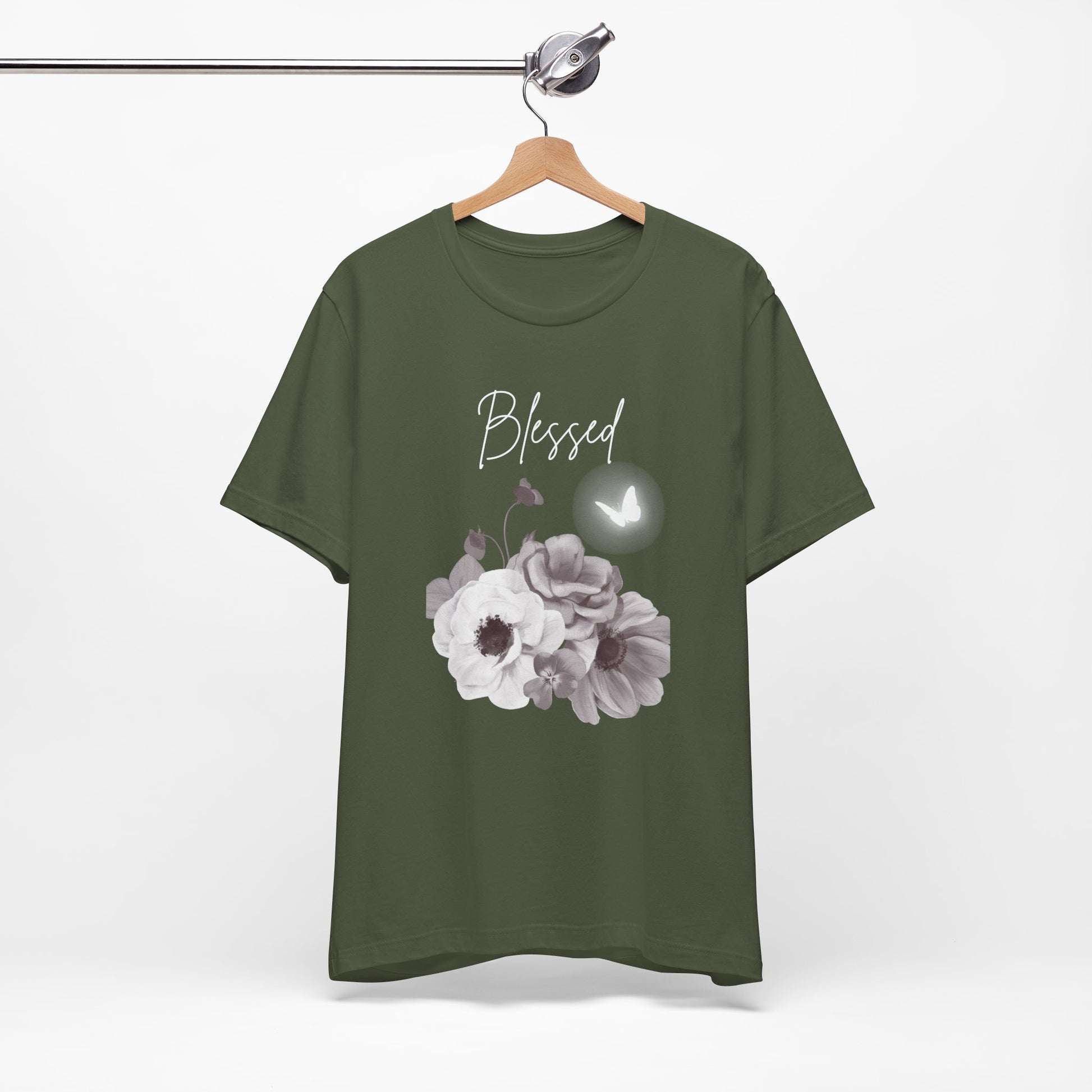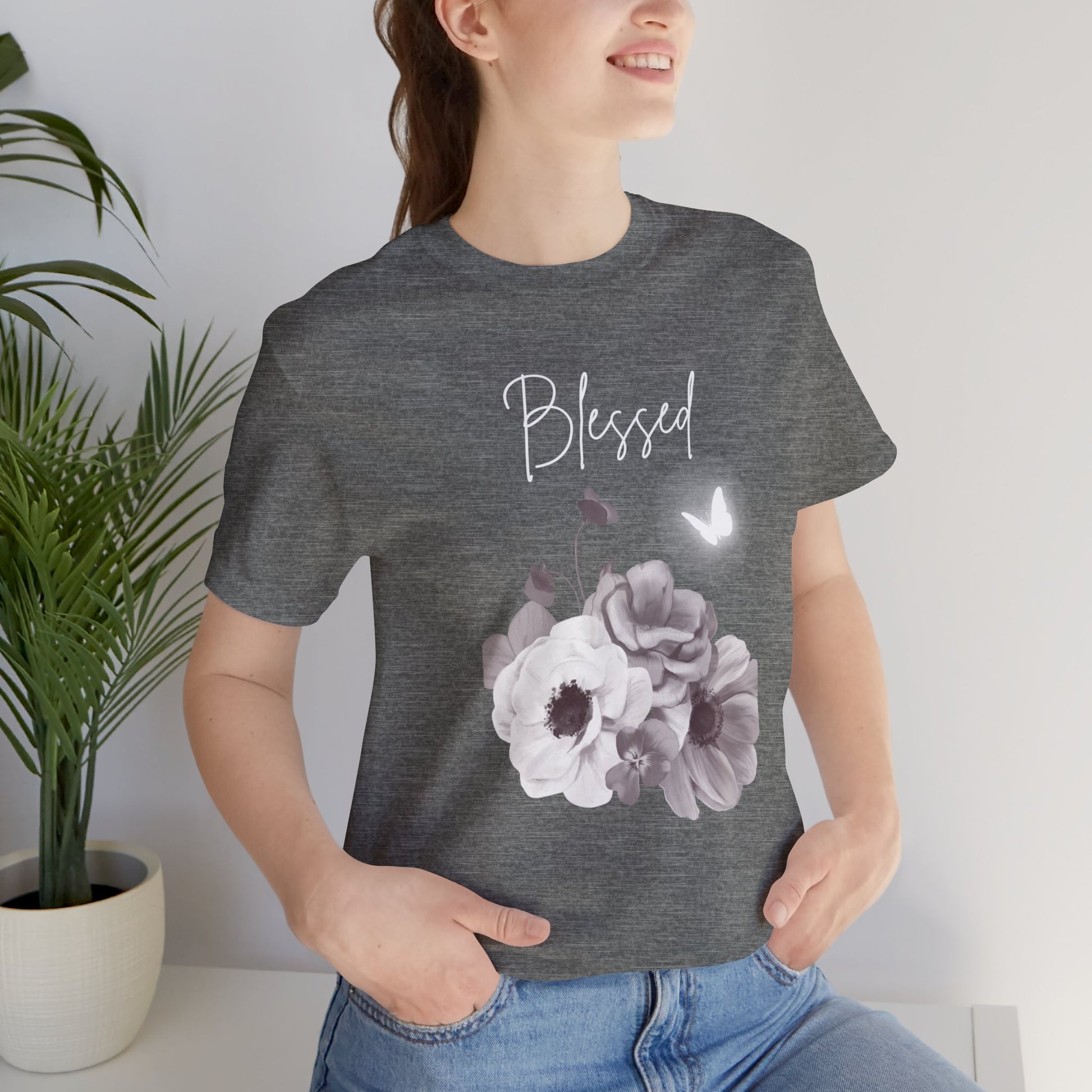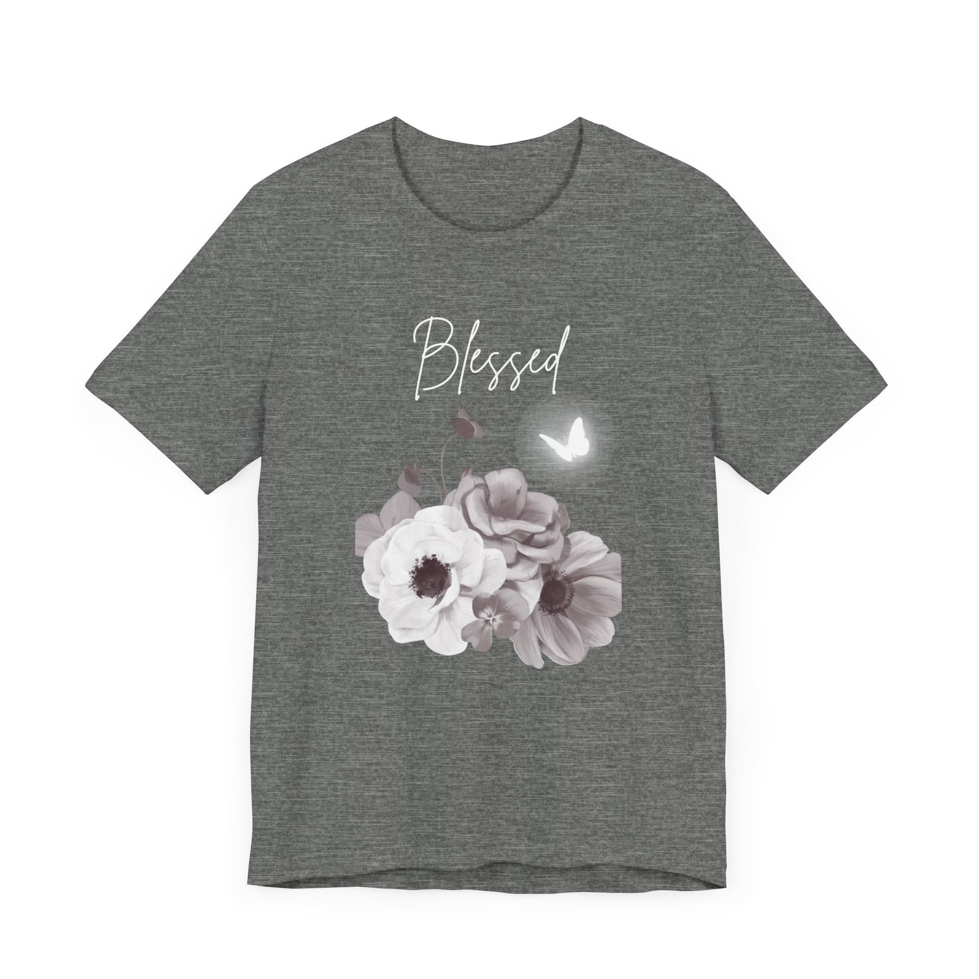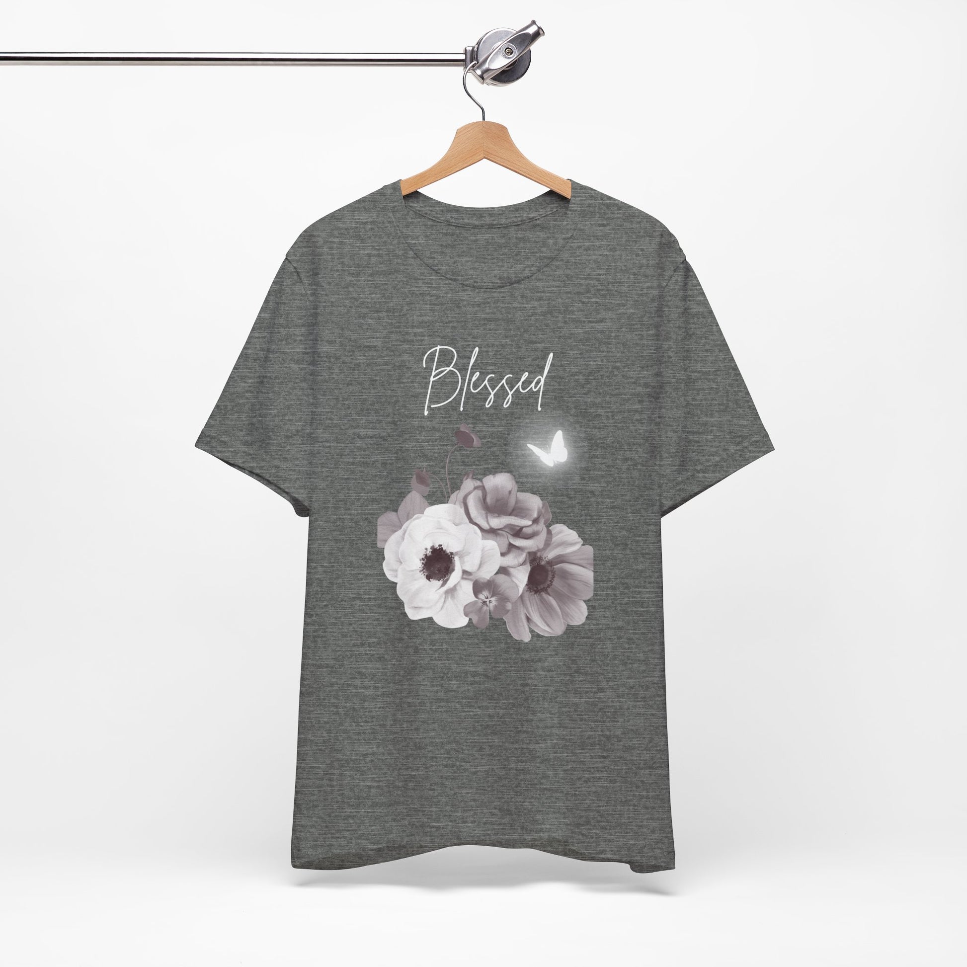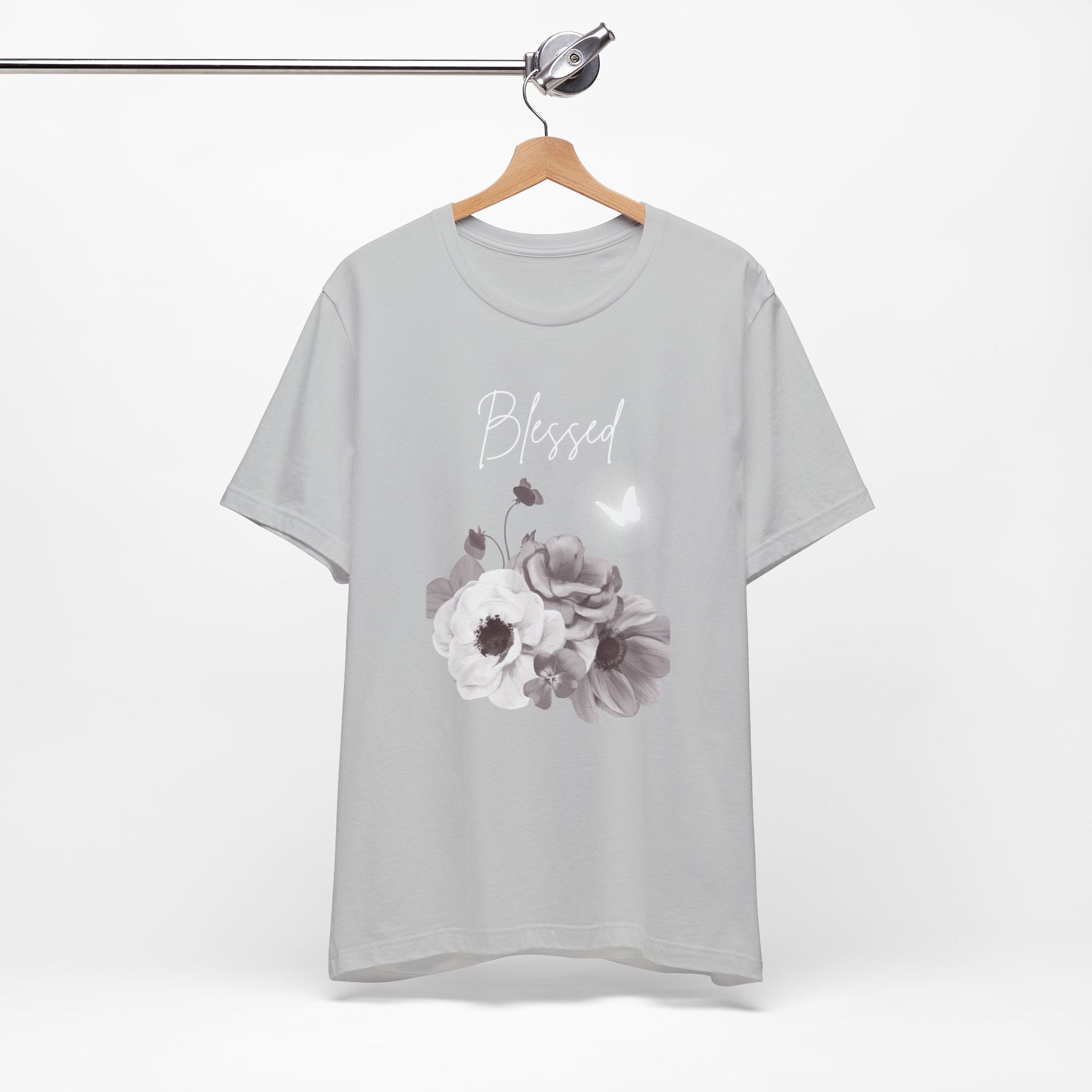 Blessed Black White Flowers with Butterfly T-shirt. This classic unisex jersey short sleeve tee fits like a well-loved favorite. Soft cotton and quality print make users fall in love with it over and over again. These t-shirts have-ribbed knit collars to bolster shaping. The shoulders are tapered for a better fit over time. Dual side seams hold the garment's shape for longer. .: Made with 100% Airlume combed and ring-spun cotton, a lightweight fabric (4.2 oz/yd² (142 g/m²)) that is easy to layer, breathable. Perfect for active and leisure wear. .: The retail fit that is perfect for casual and semi-formal settings. The crew neckline adds a classic, neat style that's perfect for accessorizing. .: Bella+Canvas manufactures all its products in the US and internationally in humane, no-sweat-shop, sustainable way and is part of the Fair Labor Association as well as Platinum WRAP certified. .: The tear-away label minimizes skin irritations. .: Fabric blends: Ash and Heather Prism colors - 99% Airlume combed and ring-spun cotton, 1% polyester; Heather colors - 52% cotton, 48% polyester; Athletic Heather and Black Heather - 90% cotton, 10% polyester.