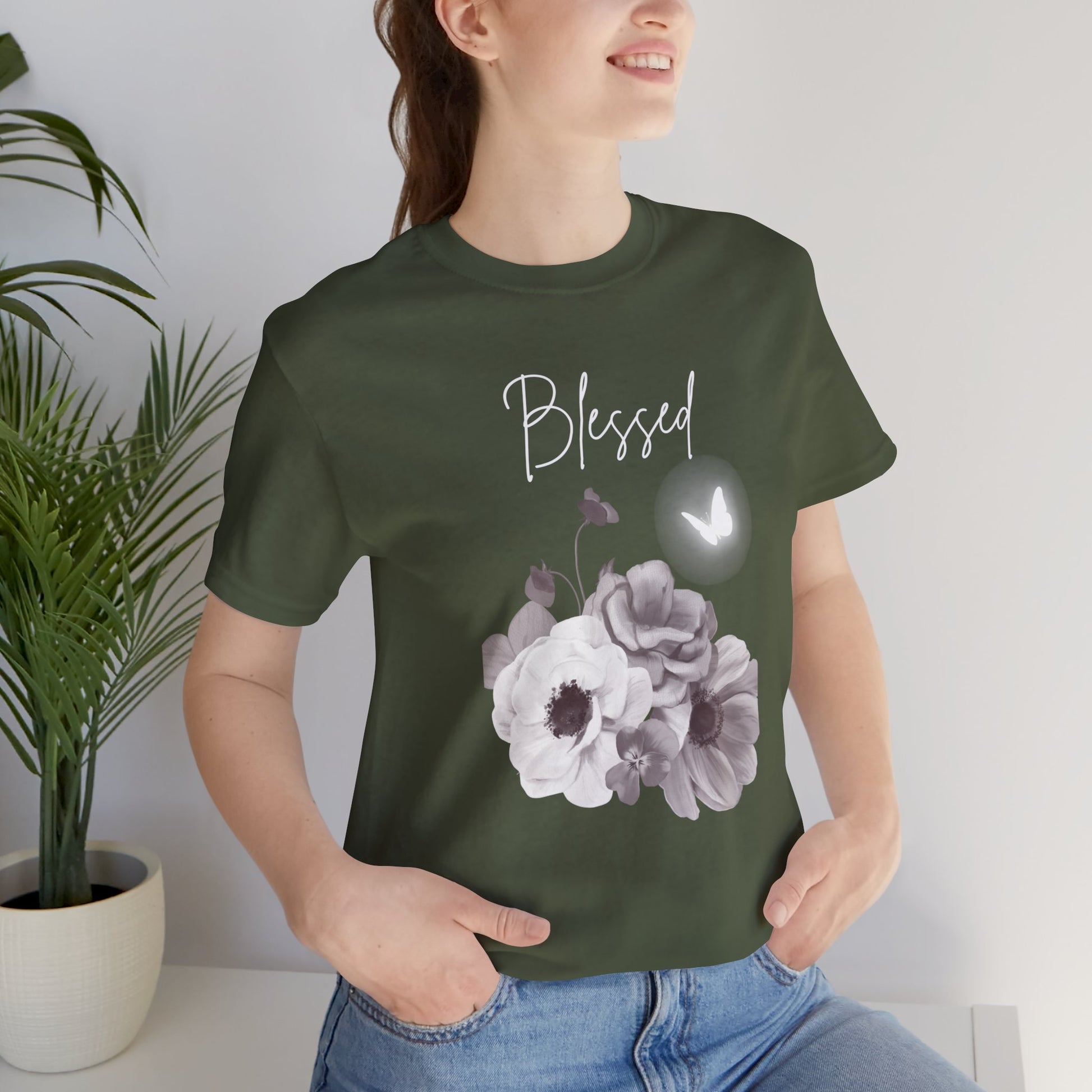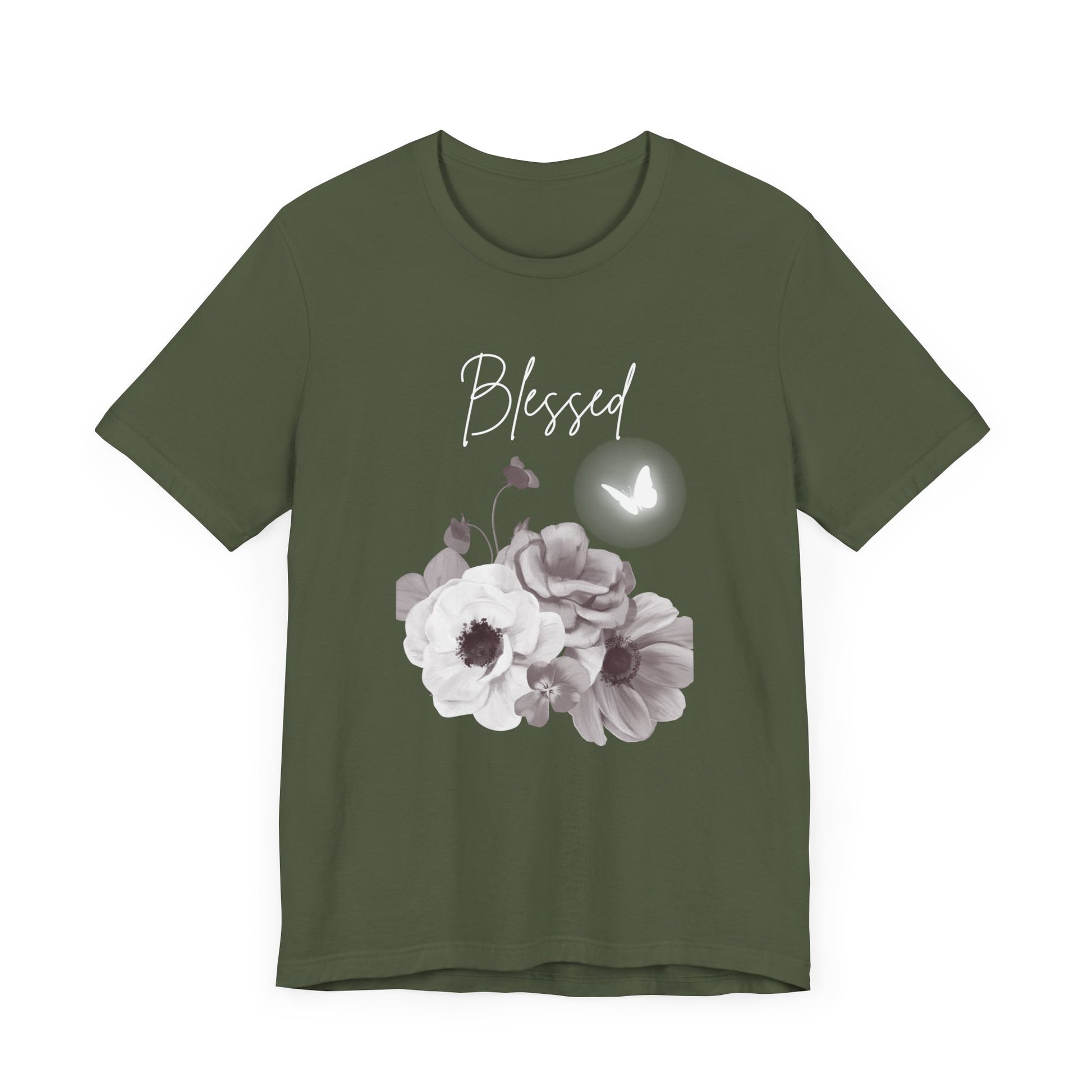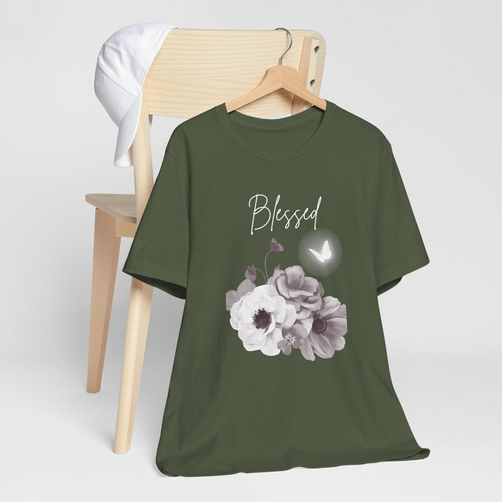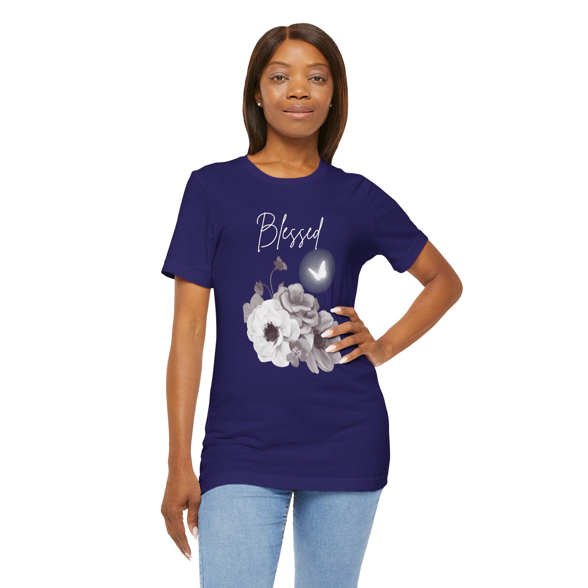 Blessed Black White Flowers with Butterfly T-shirt. This classic unisex jersey short sleeve tee fits like a well-loved favorite. Soft cotton and quality print make users fall in love with it over and over again. These t-shirts have-ribbed knit collars to bolster shaping. The shoulders are tapered for a better fit over time. Dual side seams hold the garment's shape for longer. .: Made with 100% Airlume combed and ring-spun cotton, a lightweight fabric (4.2 oz/yd² (142 g/m²)) that is easy to layer, breathable. Perfect for active and leisure wear. .: The retail fit that is perfect for casual and semi-formal settings. The crew neckline adds a classic, neat style that's perfect for accessorizing. .: Bella+Canvas manufactures all its products in the US and internationally in humane, no-sweat-shop, sustainable way and is part of the Fair Labor Association as well as Platinum WRAP certified. .: The tear-away label minimizes skin irritations. .: Fabric blends: Ash and Heather Prism colors - 99% Airlume combed and ring-spun cotton, 1% polyester; Heather colors - 52% cotton, 48% polyester; Athletic Heather and Black Heather - 90% cotton, 10% polyester.