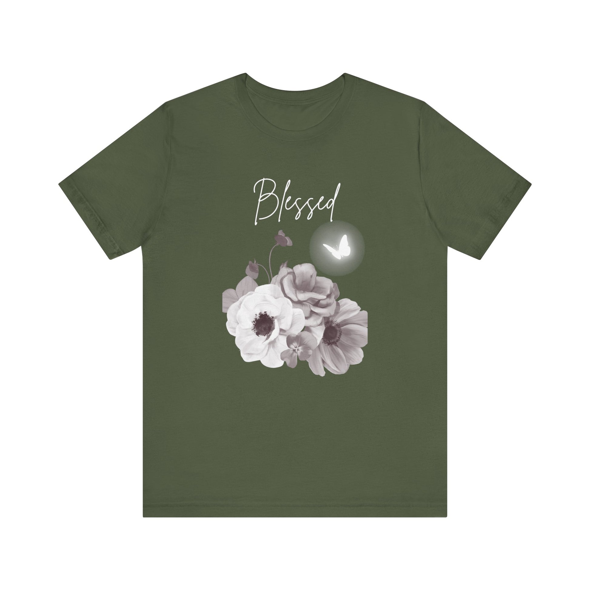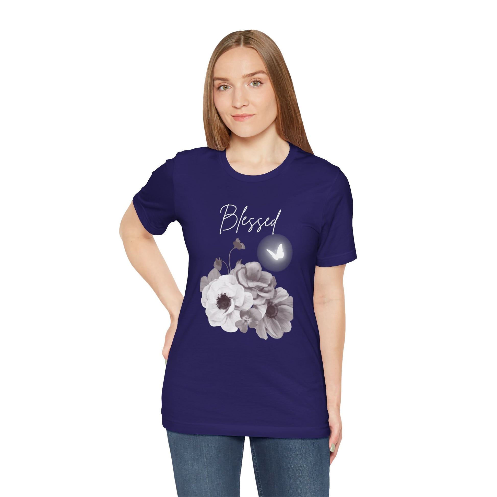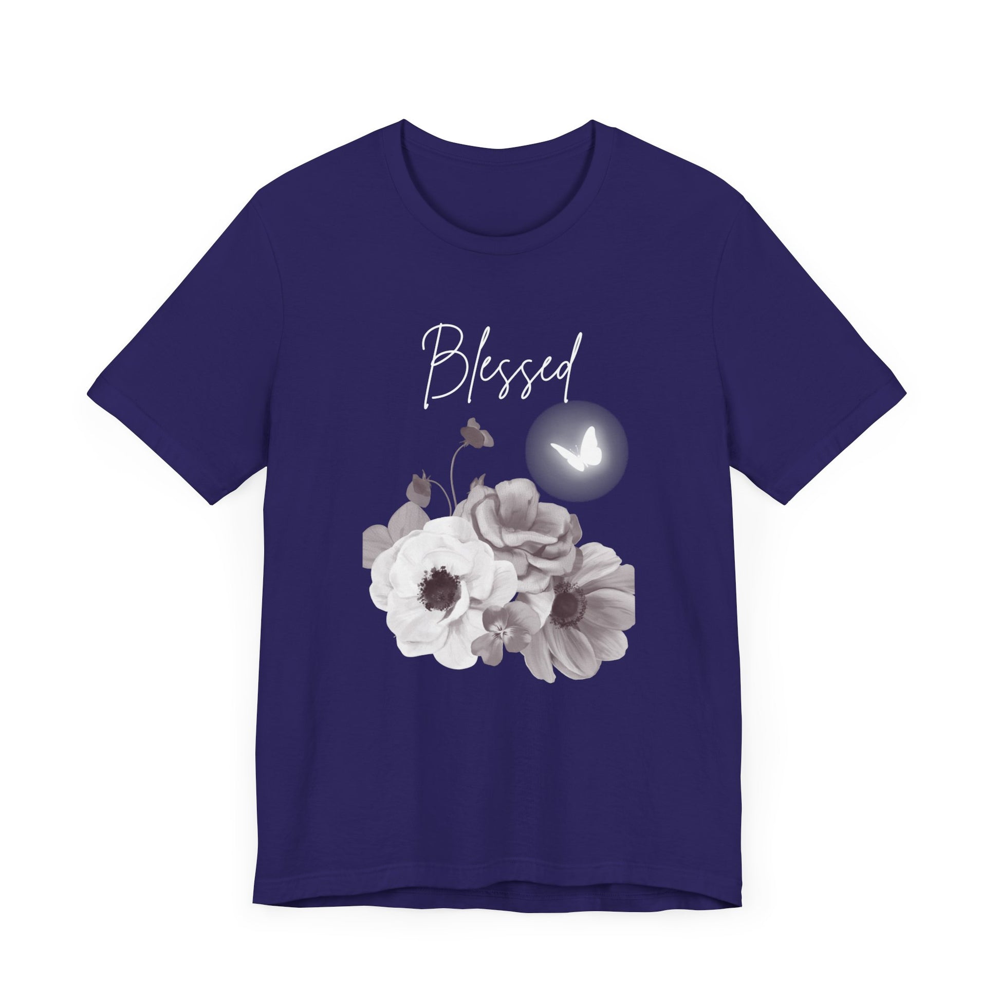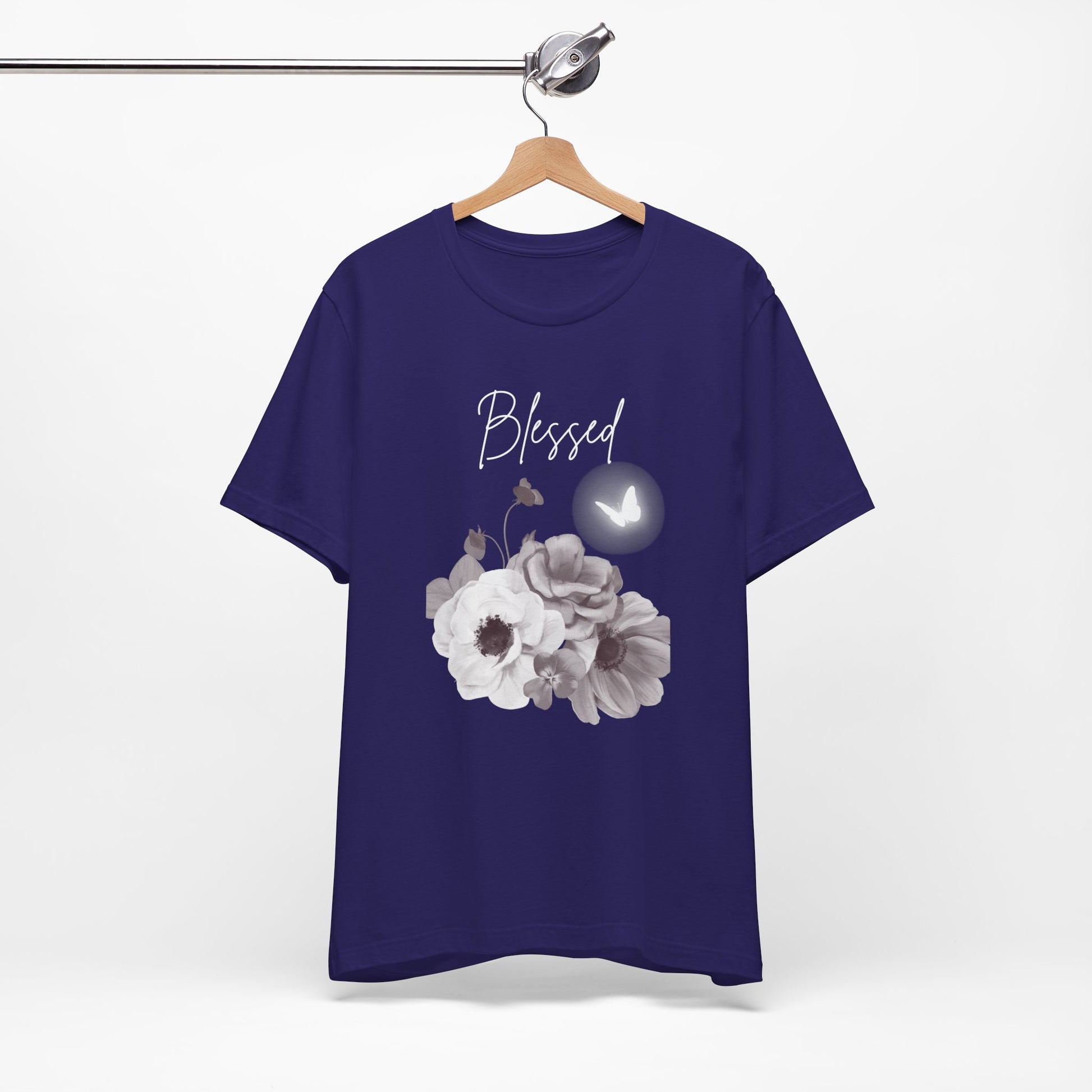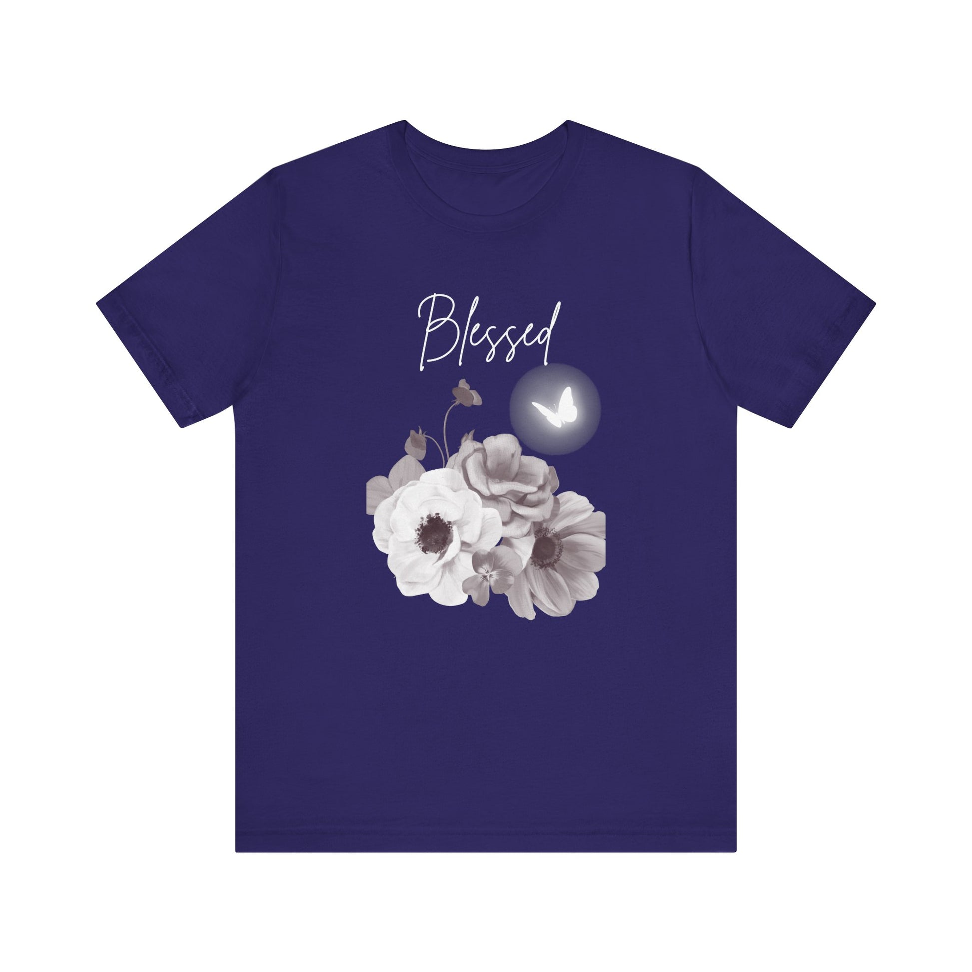 Blessed Black White Flowers with Butterfly T-shirt. This classic unisex jersey short sleeve tee fits like a well-loved favorite. Soft cotton and quality print make users fall in love with it over and over again. These t-shirts have-ribbed knit collars to bolster shaping. The shoulders are tapered for a better fit over time. Dual side seams hold the garment's shape for longer. .: Made with 100% Airlume combed and ring-spun cotton, a lightweight fabric (4.2 oz/yd² (142 g/m²)) that is easy to layer, breathable. Perfect for active and leisure wear. .: The retail fit that is perfect for casual and semi-formal settings. The crew neckline adds a classic, neat style that's perfect for accessorizing. .: Bella+Canvas manufactures all its products in the US and internationally in humane, no-sweat-shop, sustainable way and is part of the Fair Labor Association as well as Platinum WRAP certified. .: The tear-away label minimizes skin irritations. .: Fabric blends: Ash and Heather Prism colors - 99% Airlume combed and ring-spun cotton, 1% polyester; Heather colors - 52% cotton, 48% polyester; Athletic Heather and Black Heather - 90% cotton, 10% polyester.