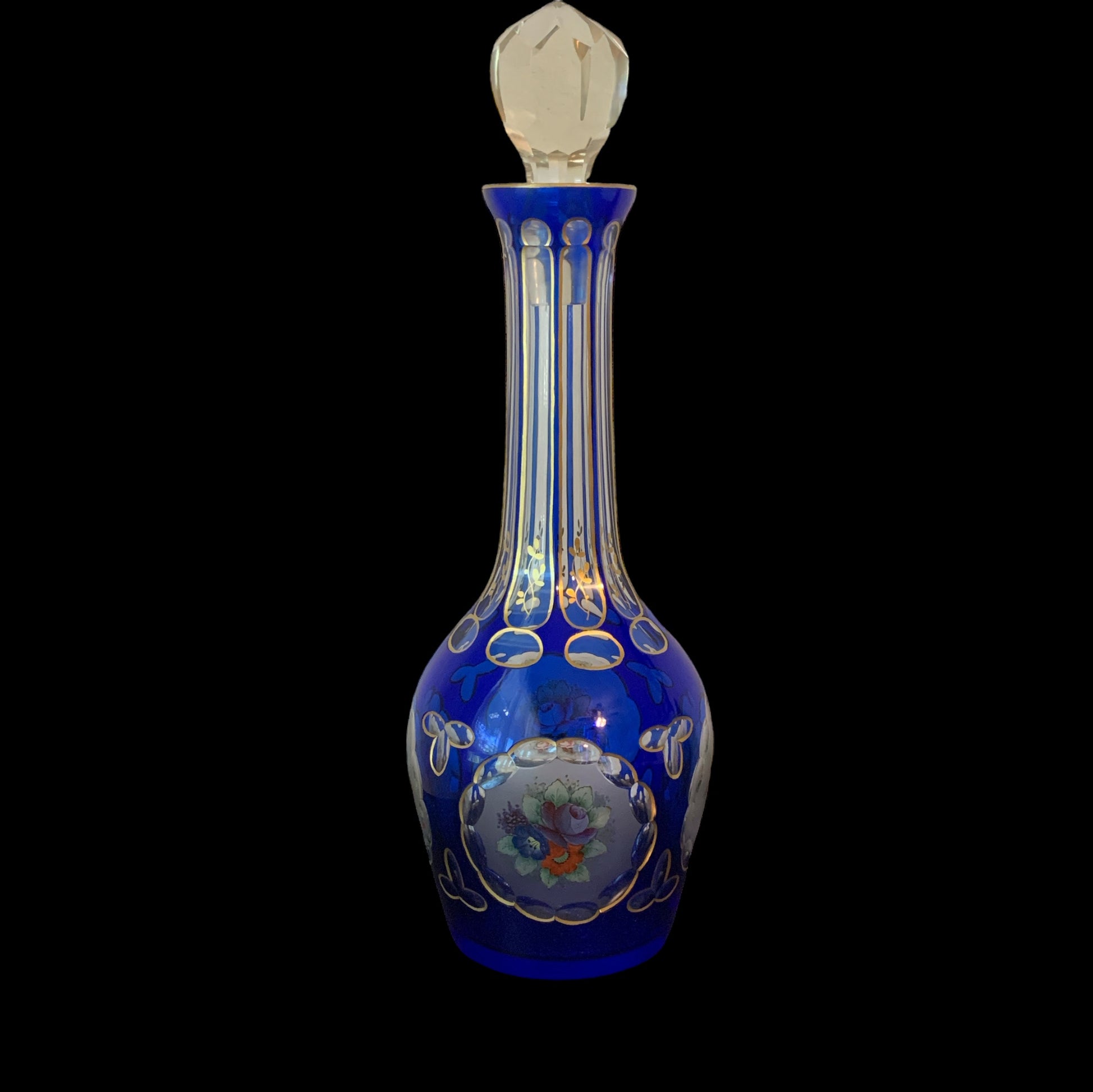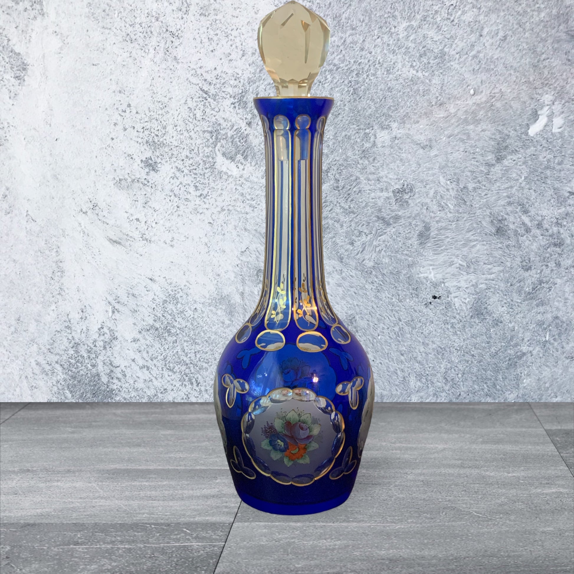 Vintage Bohemian Hand Painted Cut Glass Decanter, Cobalt with Floral Decoration, Antique Collection (Set of 2)