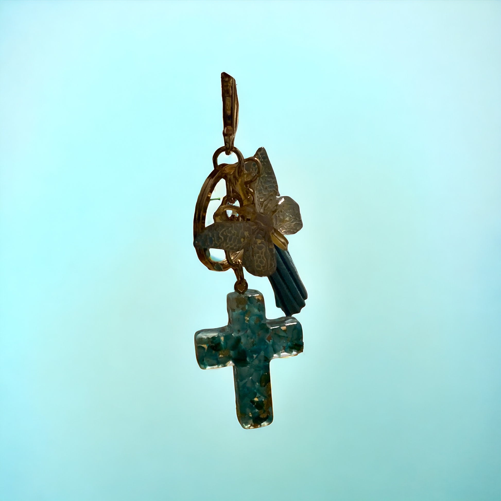 Acrylic Cross and Butterfly, Blue Keychain . Gold tone.
