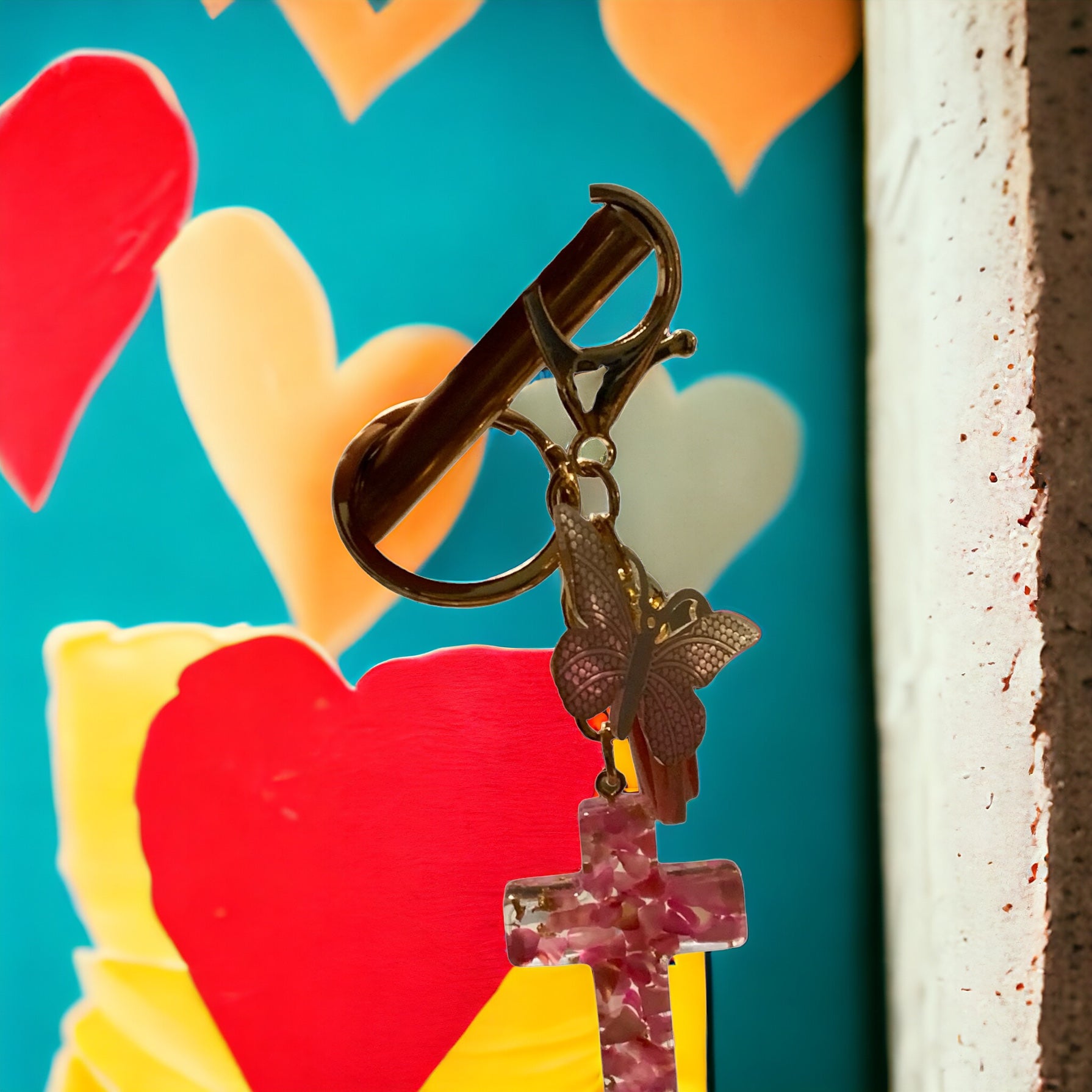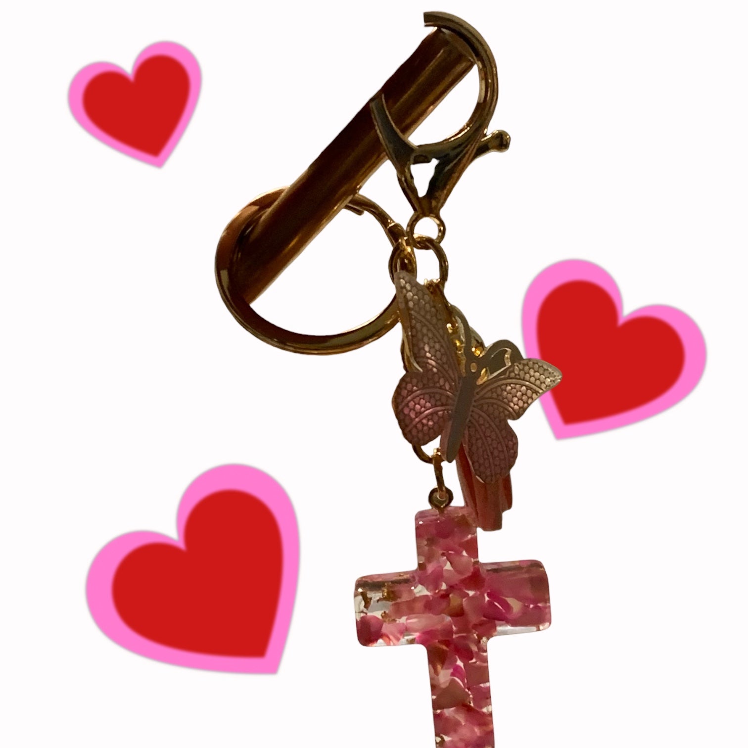 Acrylic Cross and Butterfly, Pink Keychain . Gold tone.