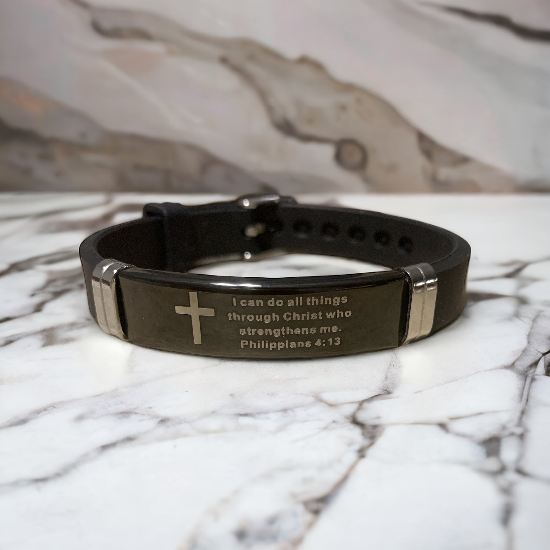 I Can Do All Things Through Christ Stainless Steel Black Bracelet. This biblical message from Philippians 4:13will bless you and your family. This bracelet makes a great gift for adults, teens and older children. The adjustable bracelet can measure 6.5-8 inches.