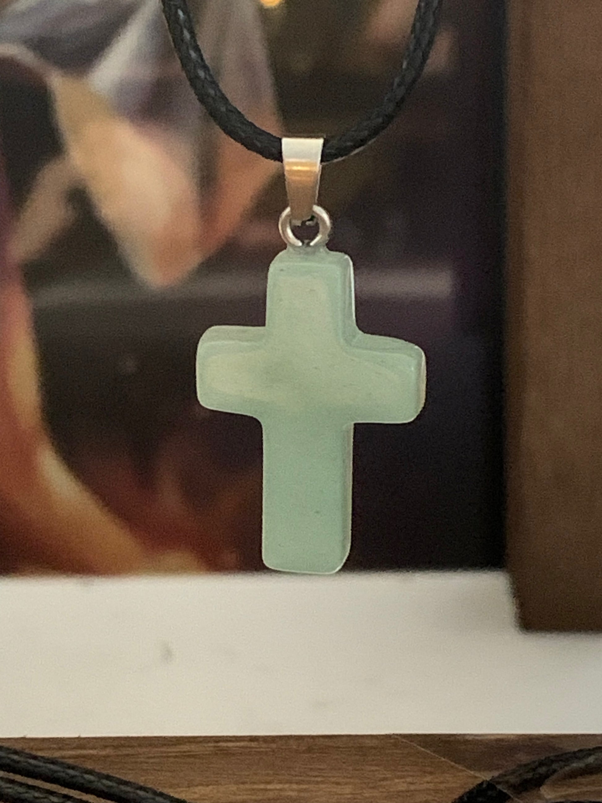 Green Adventurine Handmade natural stone cross pendant with black cord in stainless steel. Chose from: amethyst, malaquite, turquoise, tiger’s eye, blue agate, obsidian, grey agate, green aventurine, rose quartz, picture stone (brown). Each cross is about 1.25 inches in length and 1.00 inches in width. Natural stone varies in color and texture. Each cross is unique