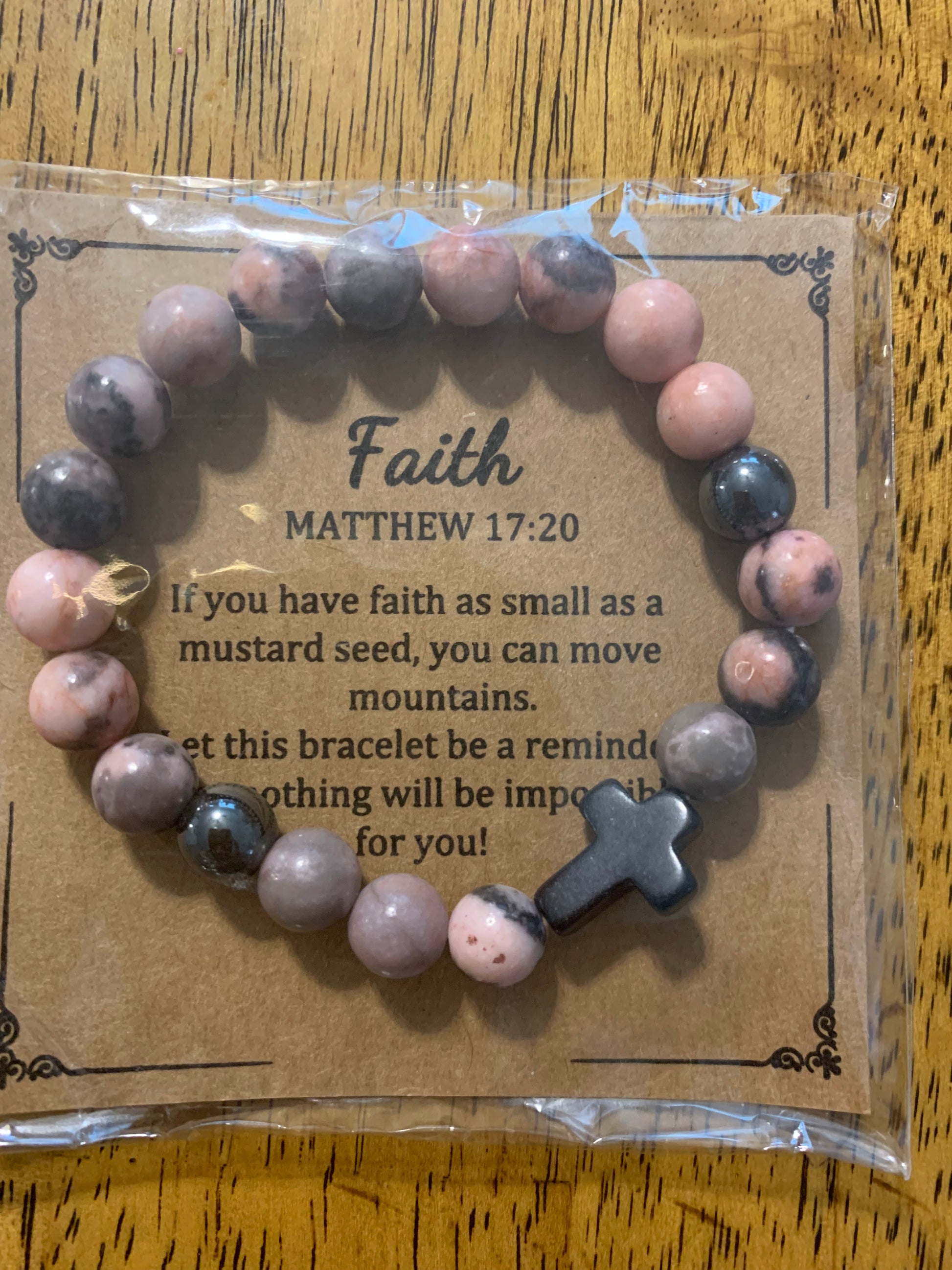 Faith Natural Stone Bracelet. These beautiful natural stone bracelets include the Bible verse Matthew 17:20. “If you have faith as small as a mustard seed…” vary from 6 to 7 inches.