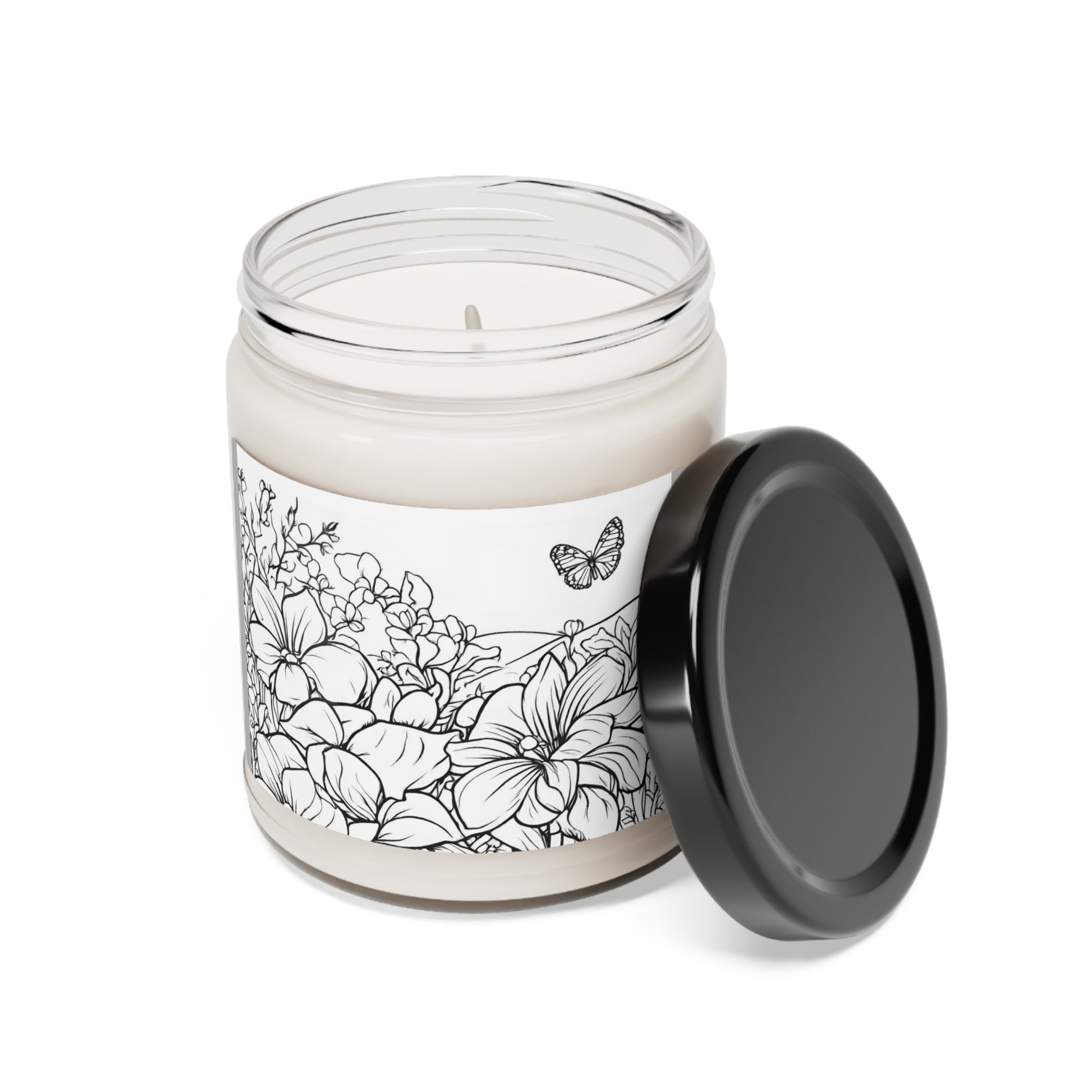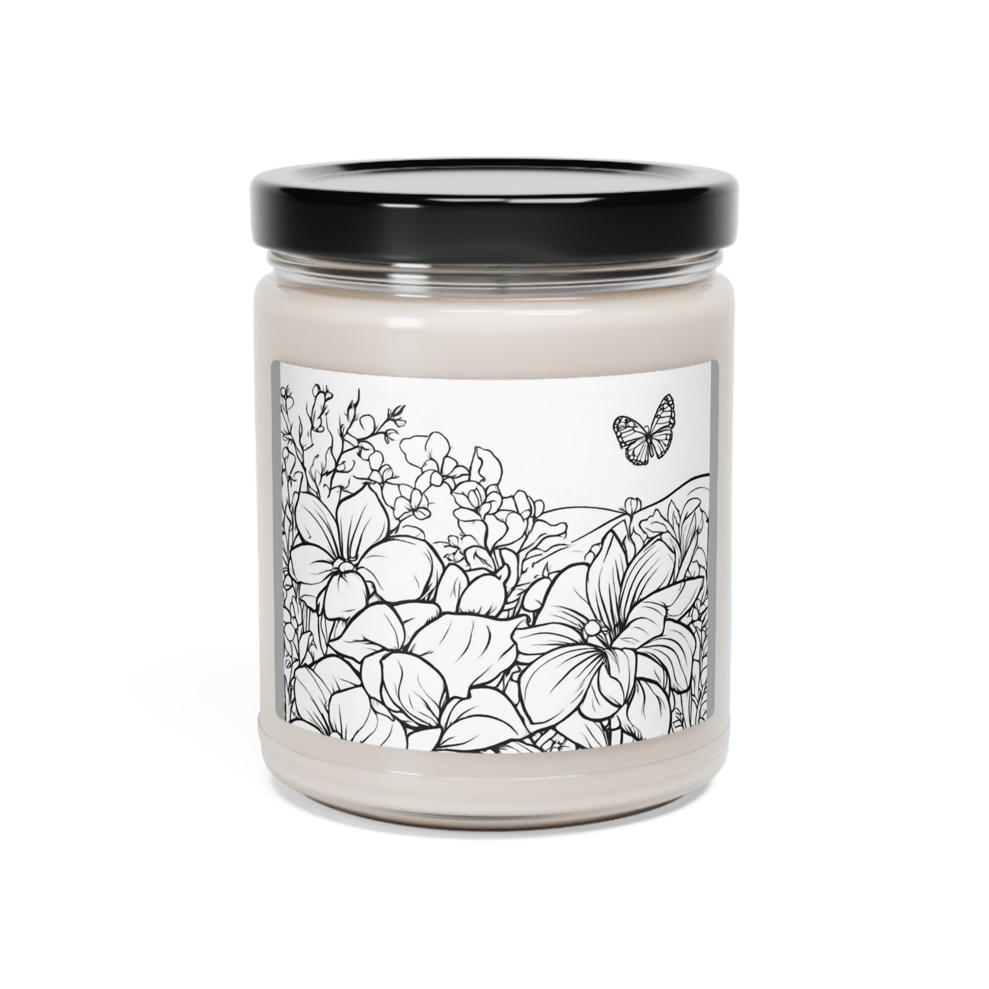 Flowers and Butterflies YOU Color Handmade Scented Soy Candle, Color your candle flower design soy candle. Packed with immersive aromas, these scented candles come in 9oz glass jars and are one size (2.8″ × 3.5") (7.1cm × 8.8cm). Made with 100% natural soy wax blend, each candle features a 100% cotton wick and a permanent adhesive label where your custom designs can come alive.