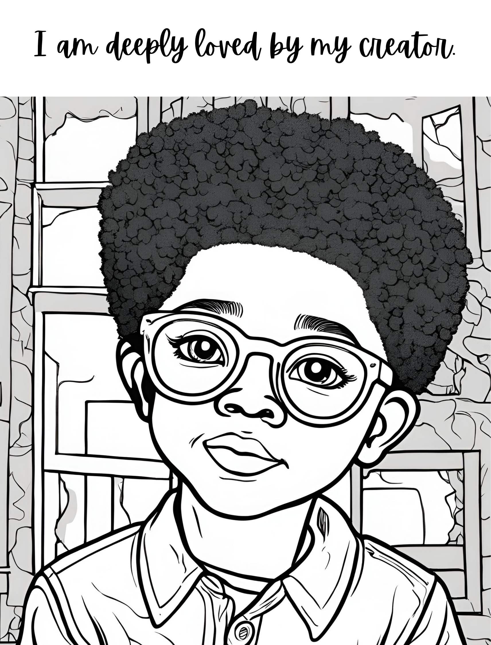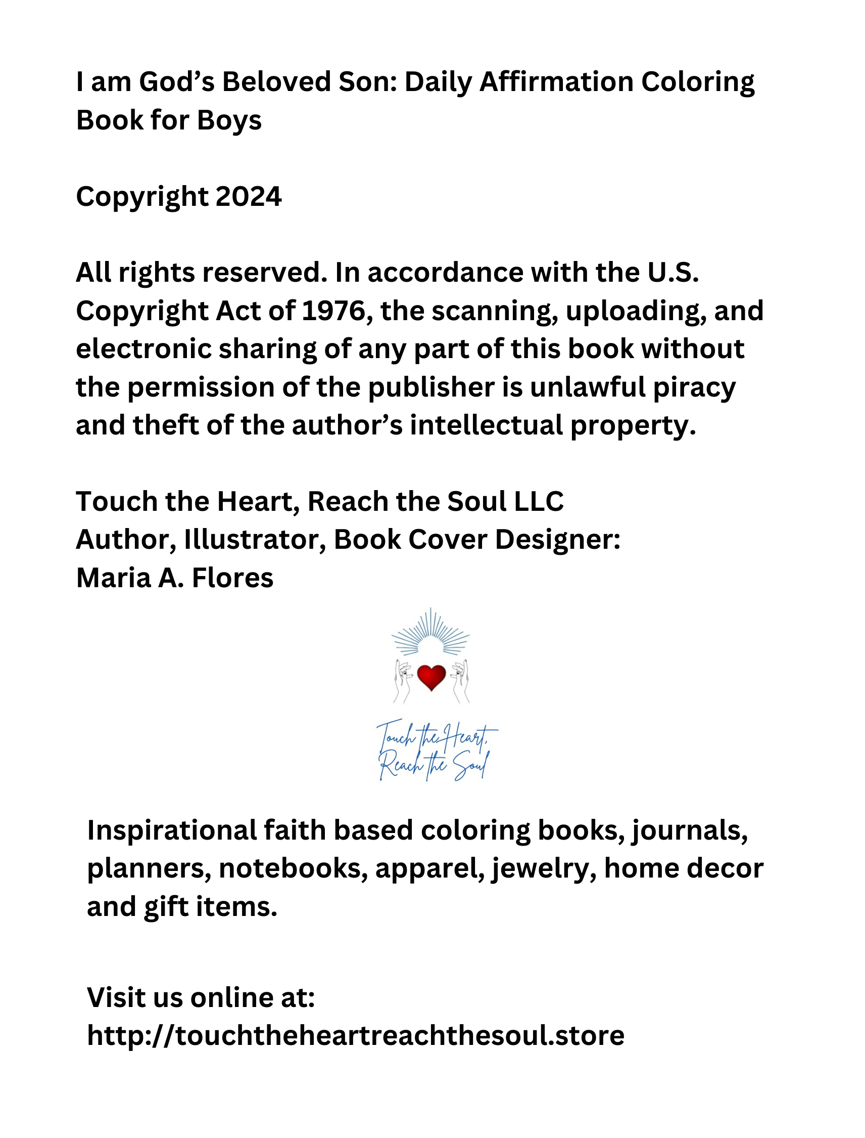 I AM GOD'S BELOVED SON: DAILY AFFIRMATION COLORING BOOK FOR BOYS was created in dedication to boys ages 3-10. From a young age, it is important that they realized how valuable and loved they are by God and those around them. This coloring book illustrates the story of a boy waking up, getting read for school, going on the bus, spending the day at school, playing sports, coming home, spending time with his family and sleeping. The drawings are of boys from various ethnic backgrounds. There is one affirmation on each coloring page.