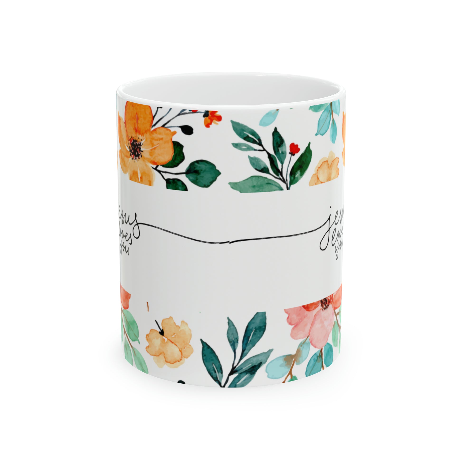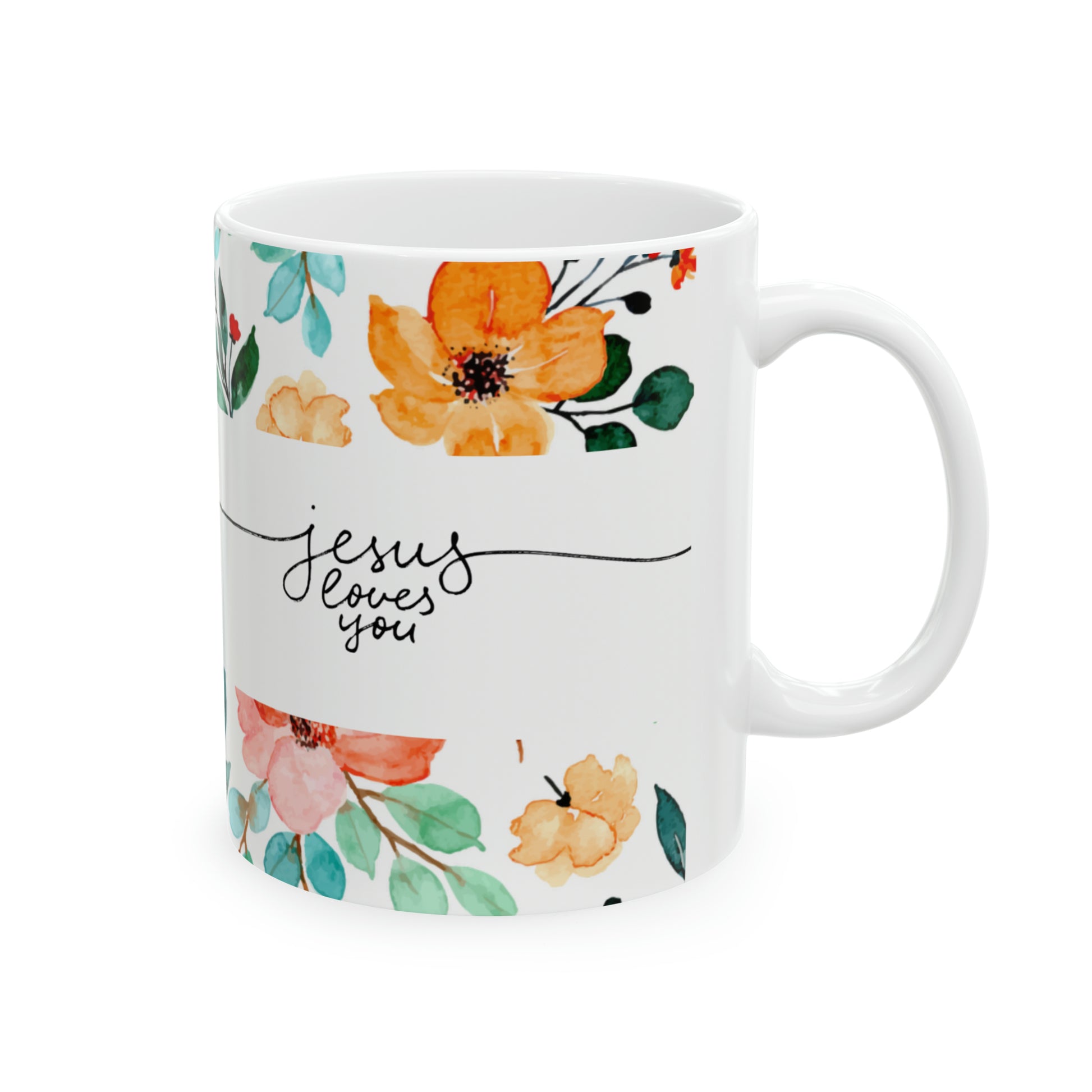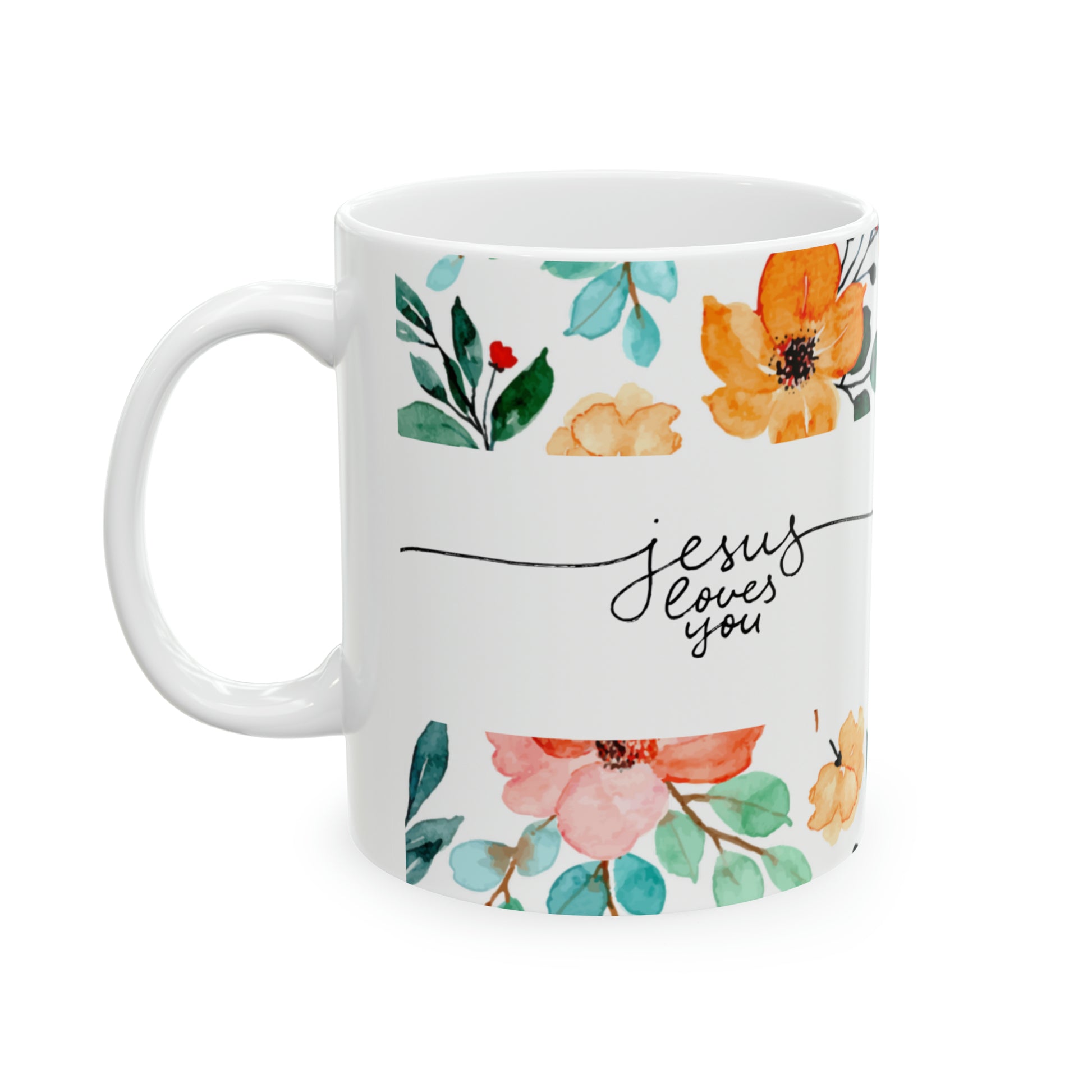 Jesús Loves You Floral Mug makes a wonderful gift for any occasion. (Free Shipping). Warm-up with a nice cup out of this customized ceramic coffee mug. It’s BPA and Lead-free, microwave & dishwasher-safe, and made of white, durable ceramic in 11-ounce size. Thanks to the advanced printing tech, your designs come to life with incredibly vivid colors – the perfect gift for coffee, tea, and chocolate lovers.