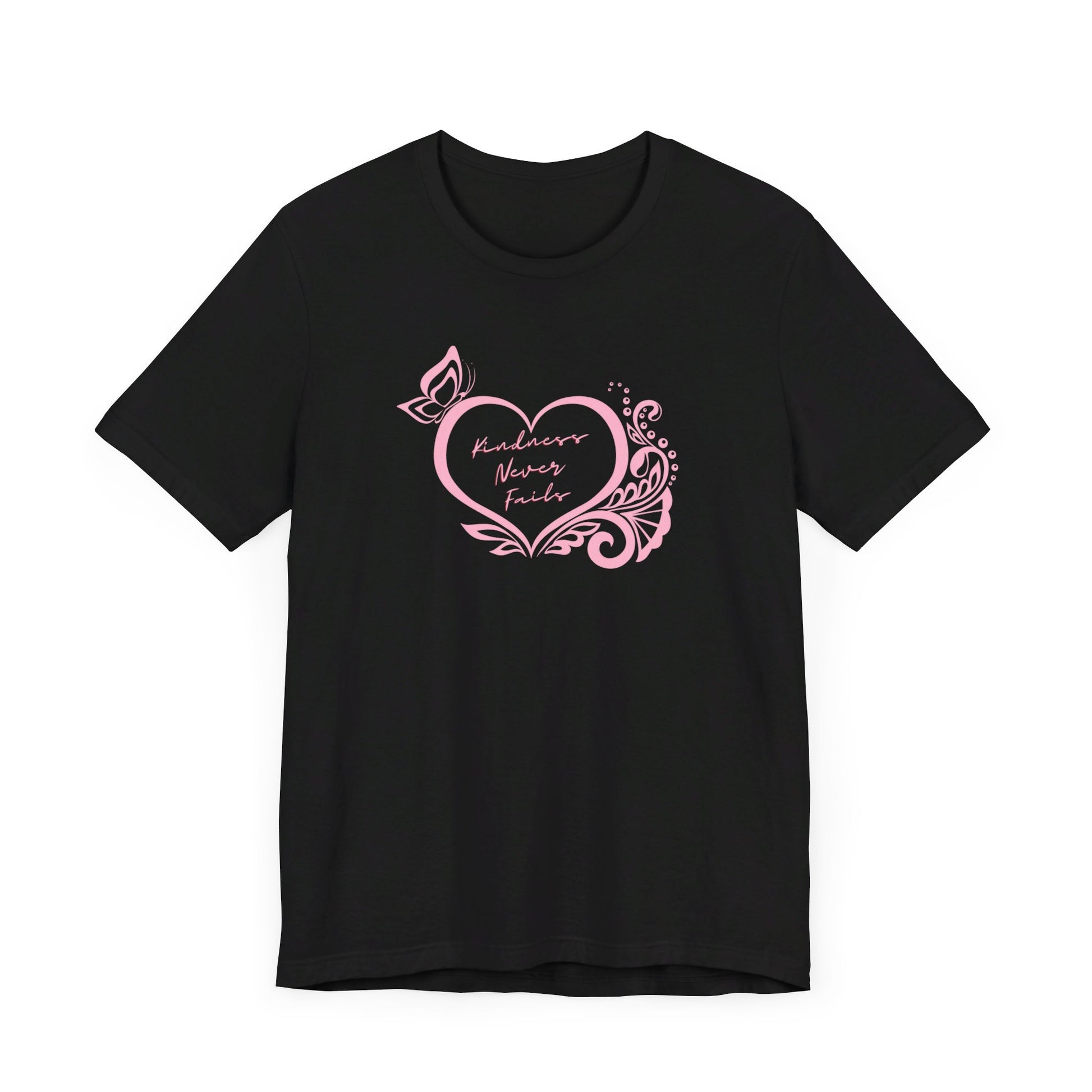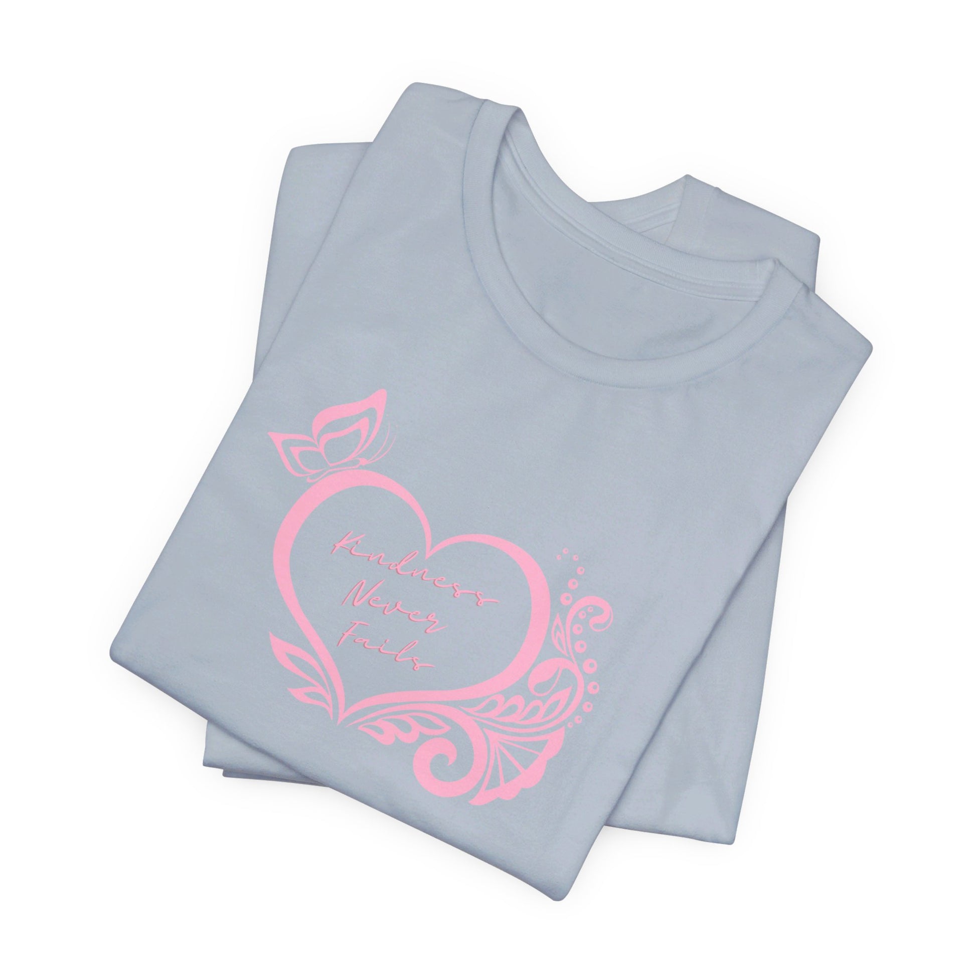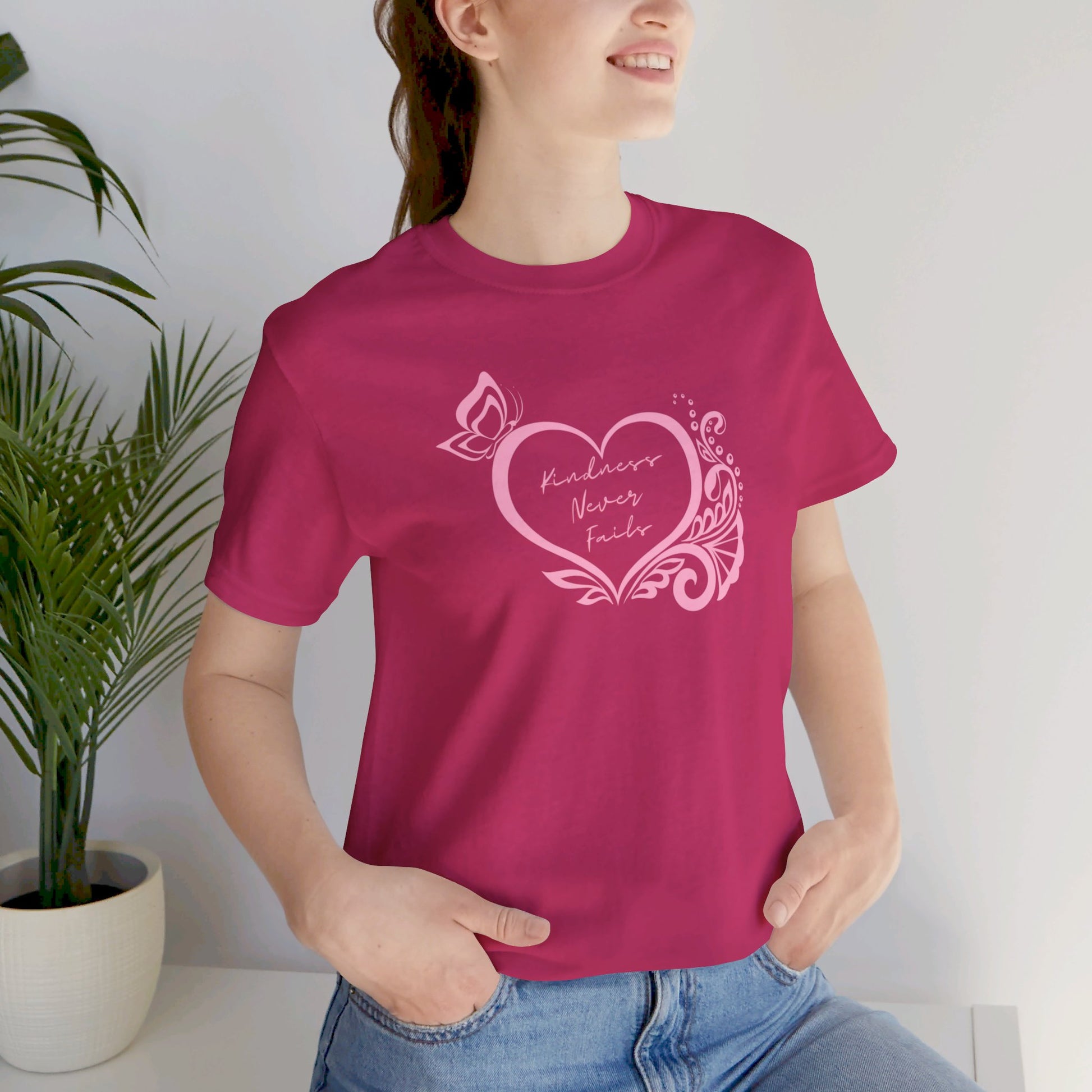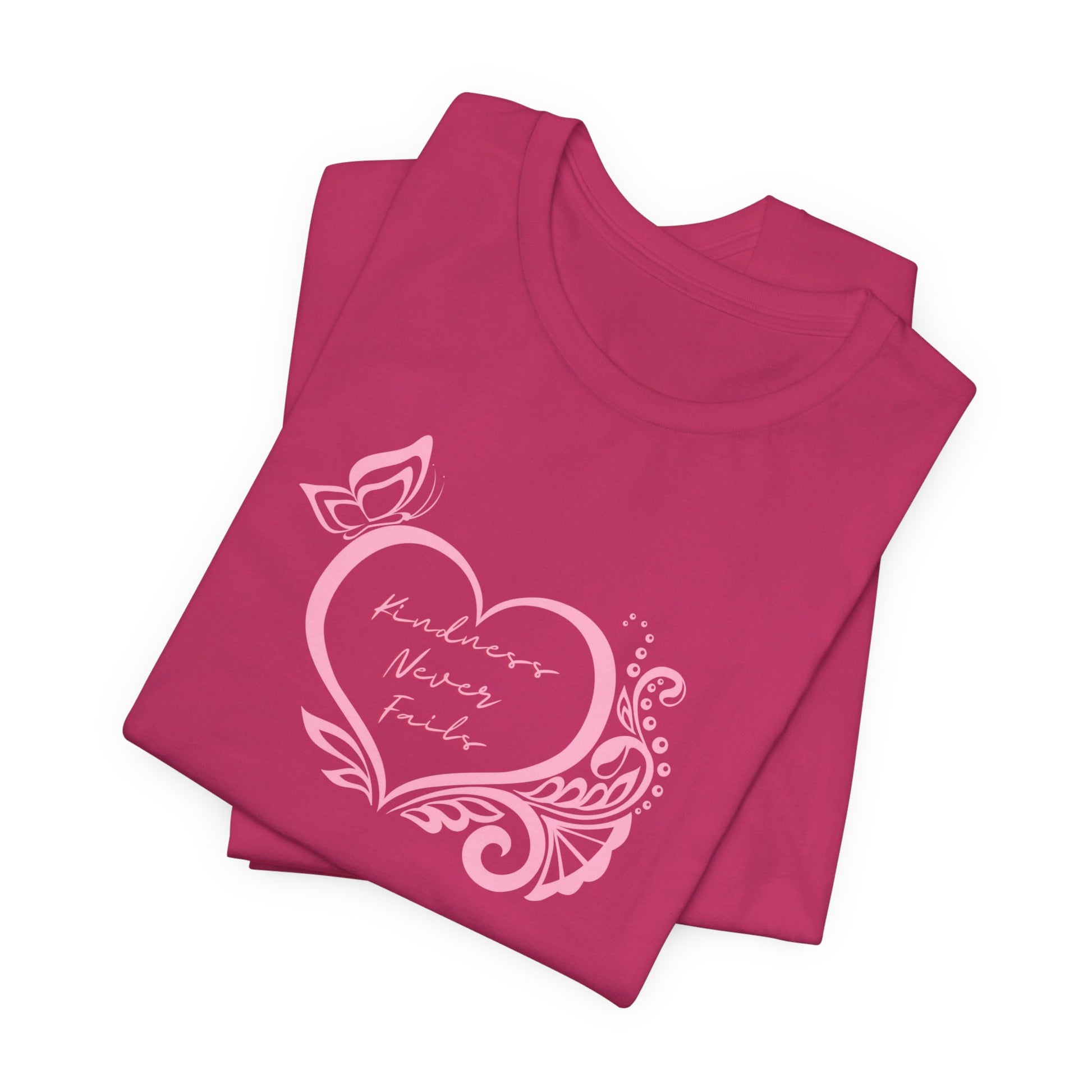 Show your commitment to kindness with this Pink Heart Tee. Spread positivity and inspire others with the message "Kindness Never Fails". Wear this comfortable short sleeve shirt to make a statement and remind everyone that kindness is a powerful force.