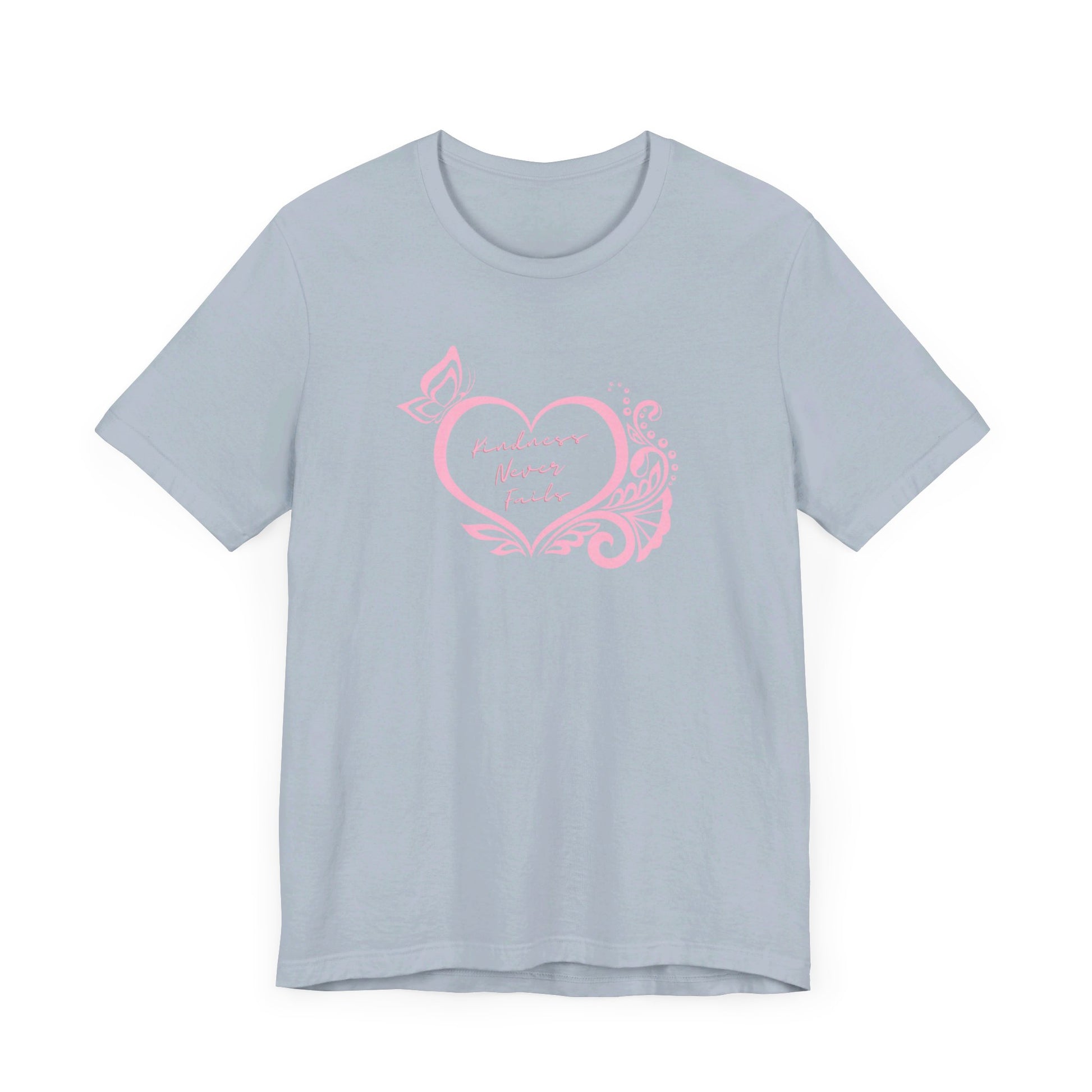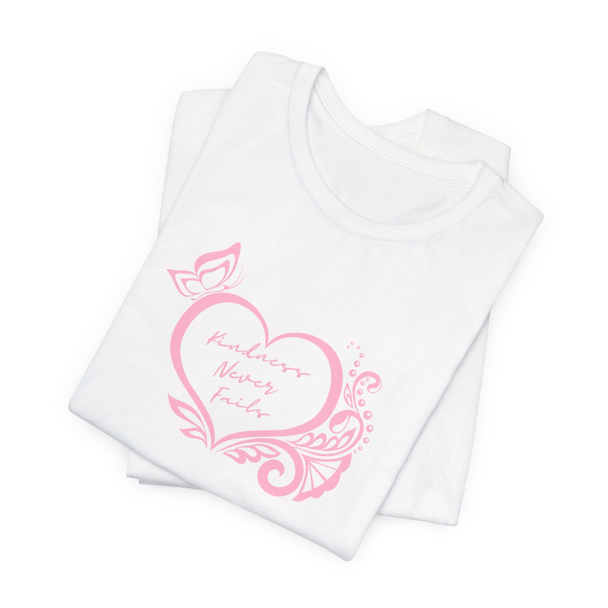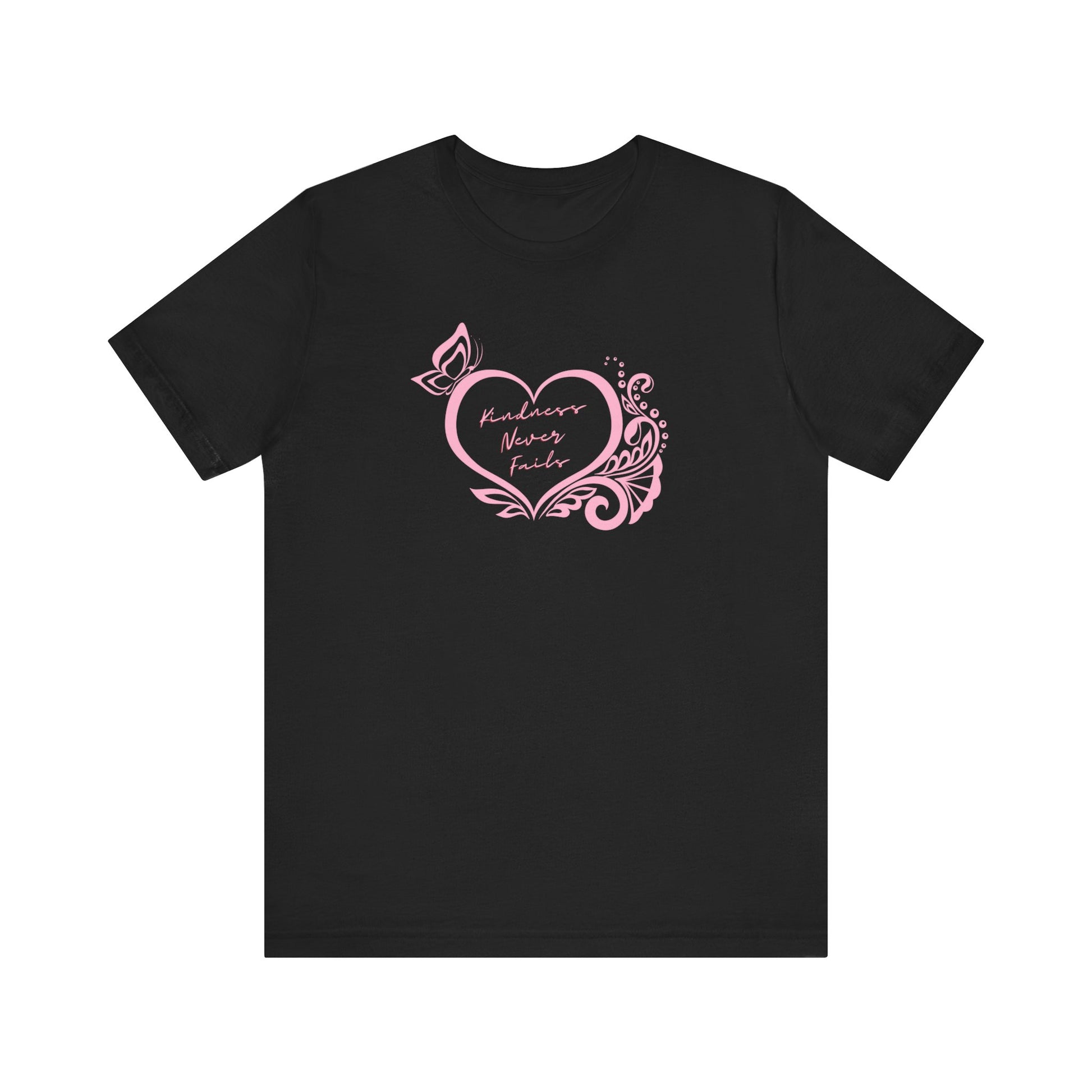 Show your commitment to kindness with this Pink Heart Tee. Spread positivity and inspire others with the message "Kindness Never Fails". Wear this comfortable short sleeve shirt to make a statement and remind everyone that kindness is a powerful force.