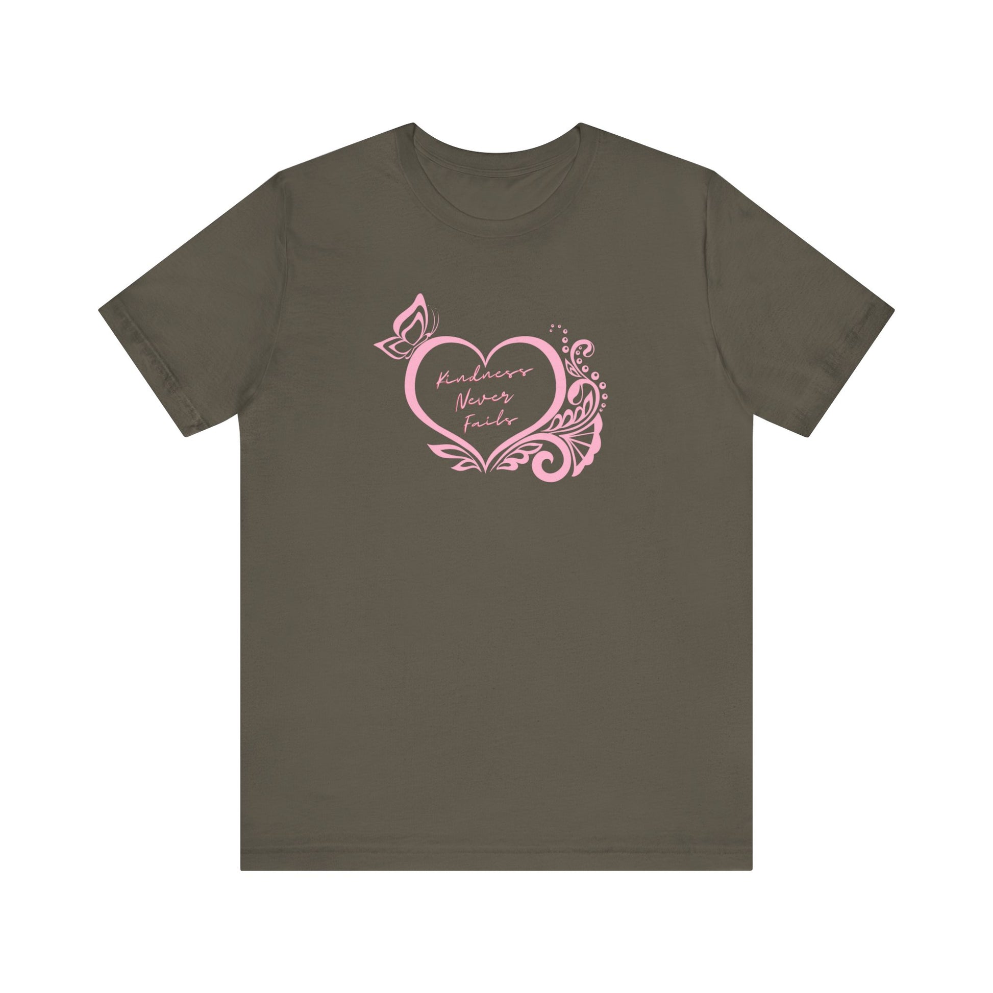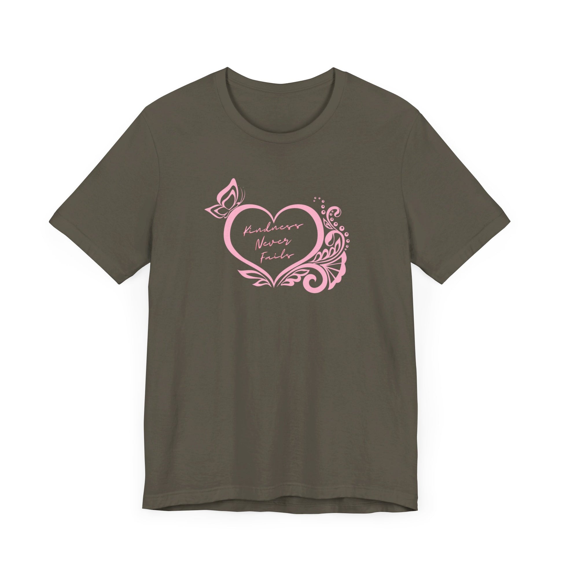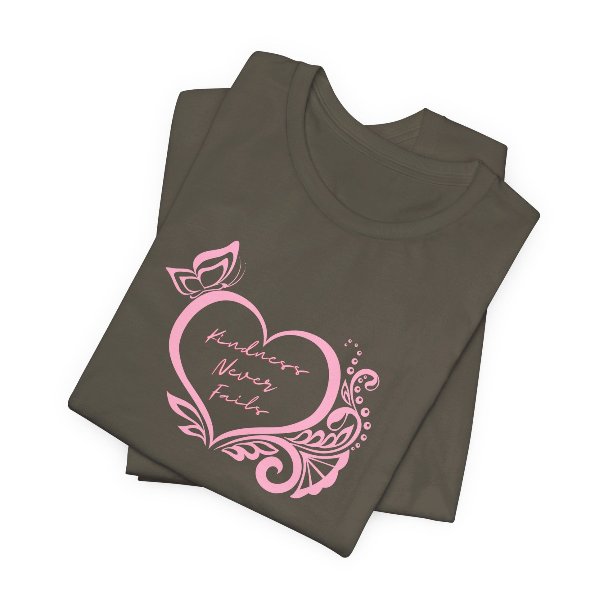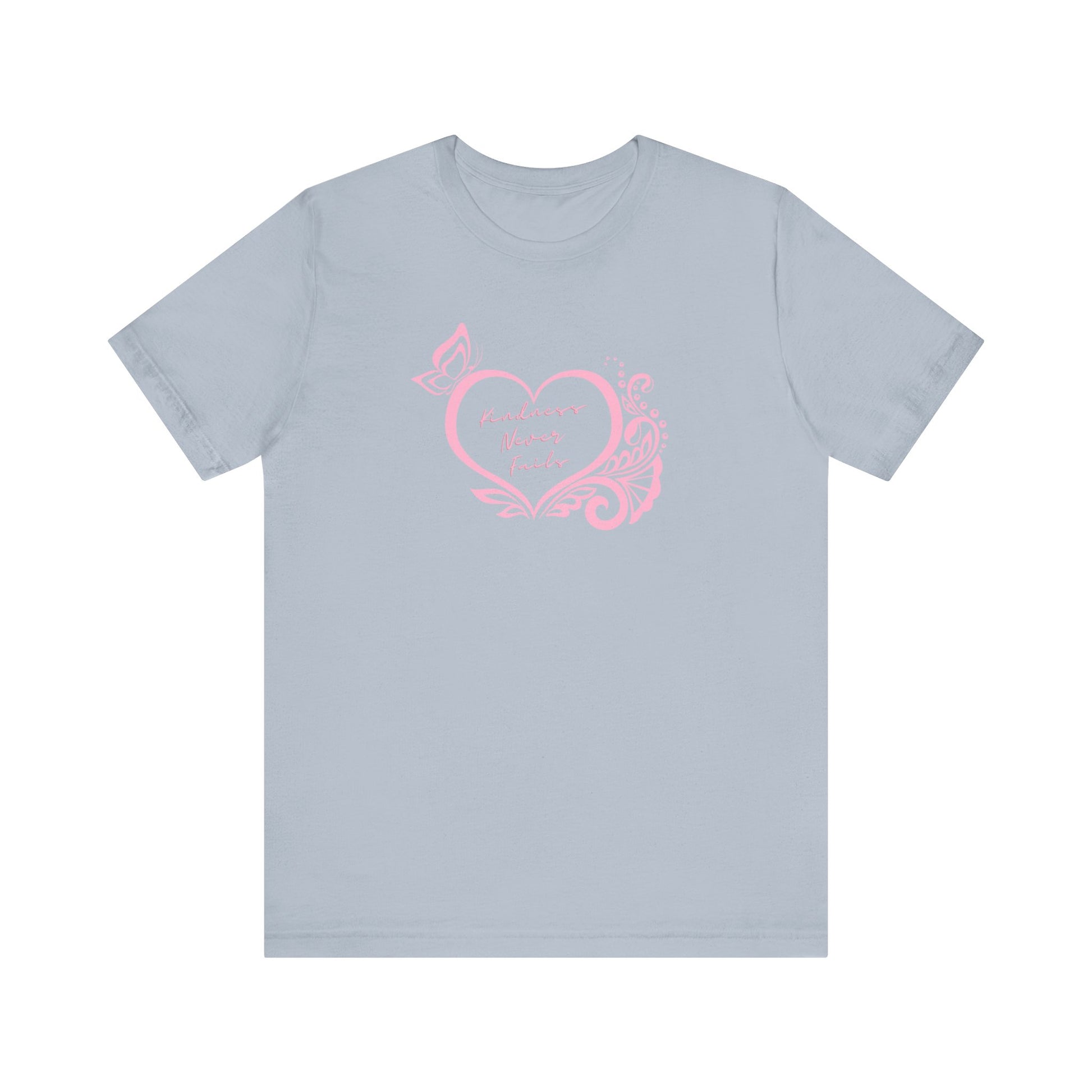 Show your commitment to kindness with this Pink Heart Tee. Spread positivity and inspire others with the message "Kindness Never Fails". Wear this comfortable short sleeve shirt to make a statement and remind everyone that kindness is a powerful force.
