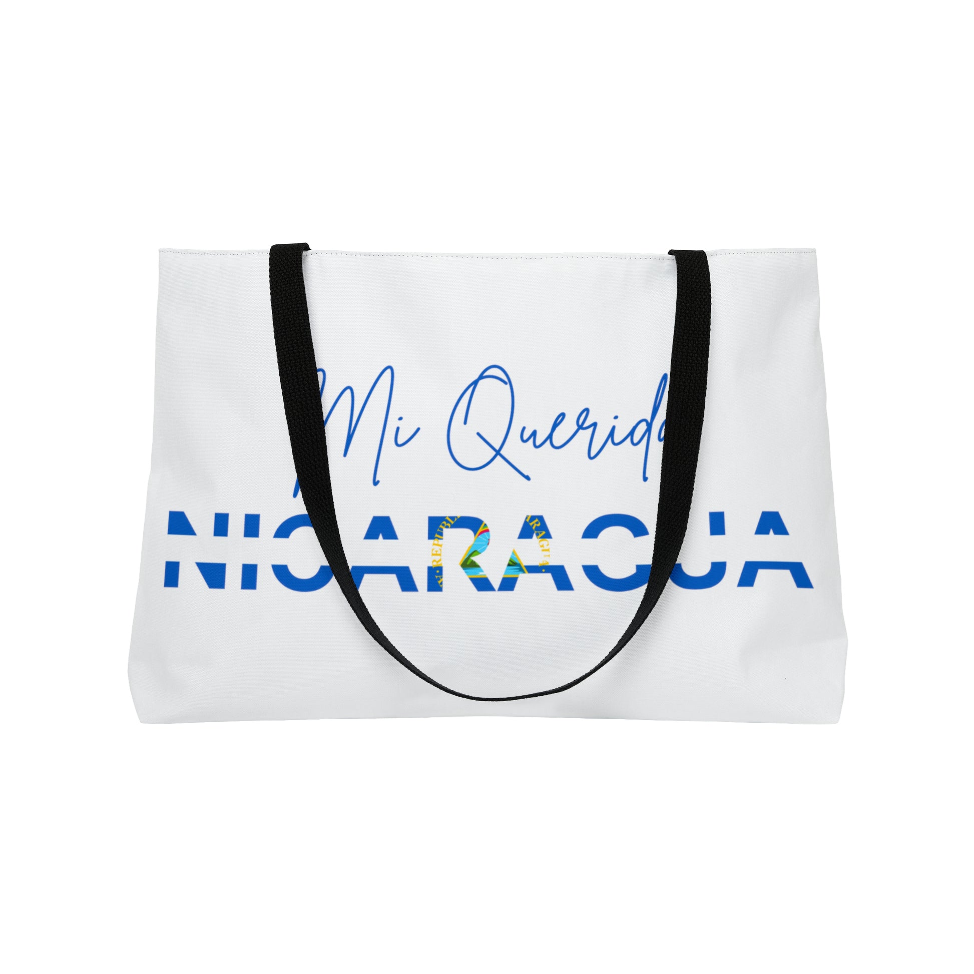 Mi Querida Nicaragua Weekender Tote Bag. This personalized weekender bag comes in one size – 24" x 13" (60.9 cm x 33 cm) – perfect for those who love to travel light. Its t-bottom construction and black handles give it a sleek, classic look. Start designing, and we'll print your art on the 100% spun polyester in vibrant colors.