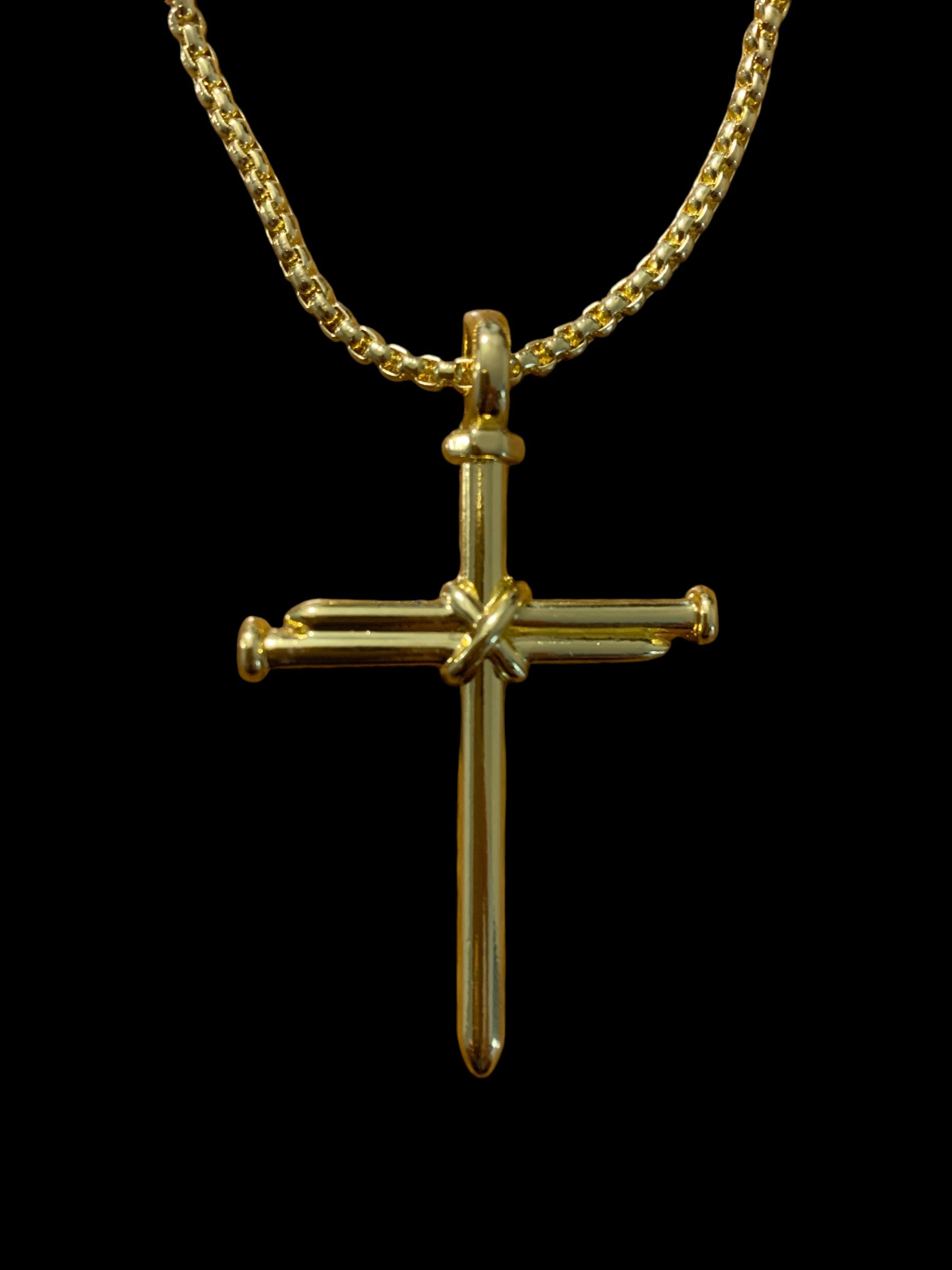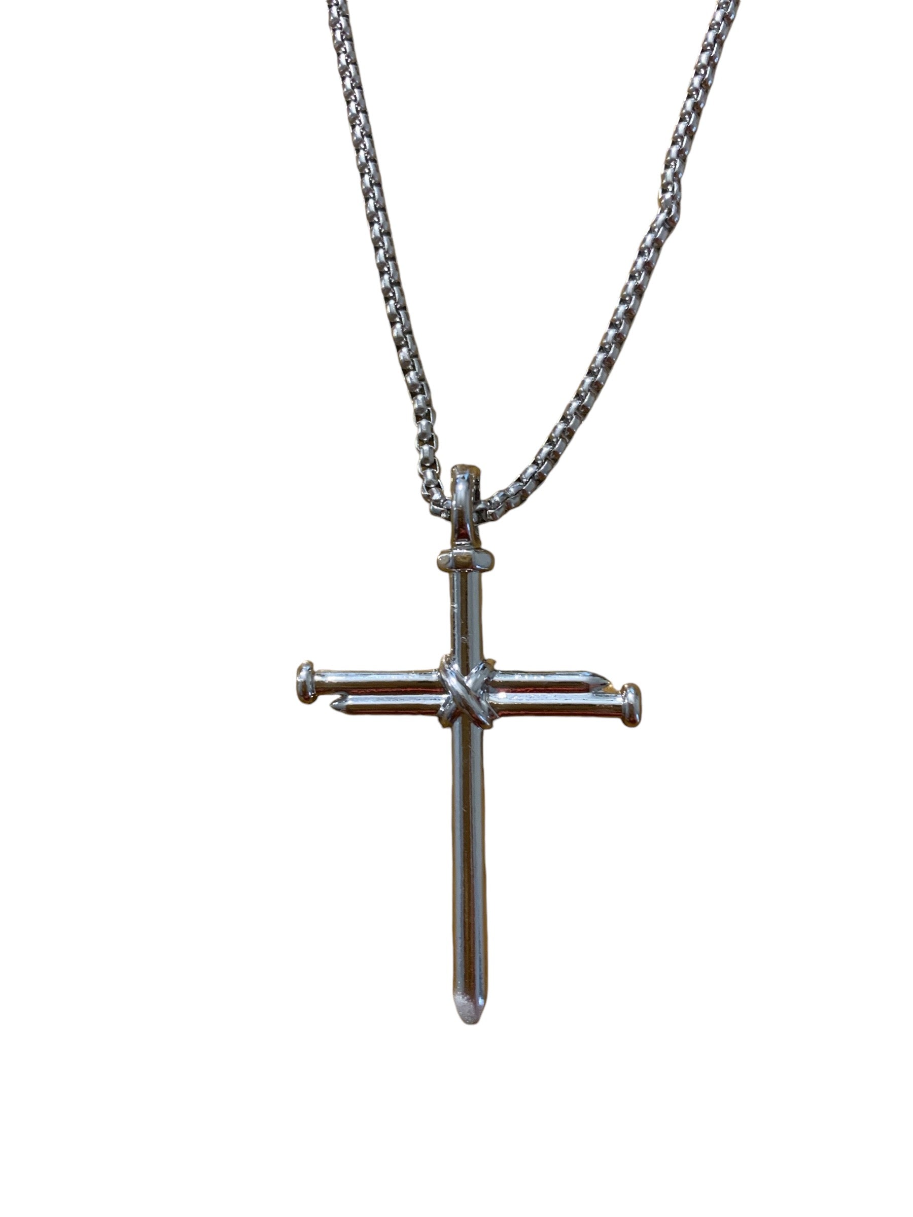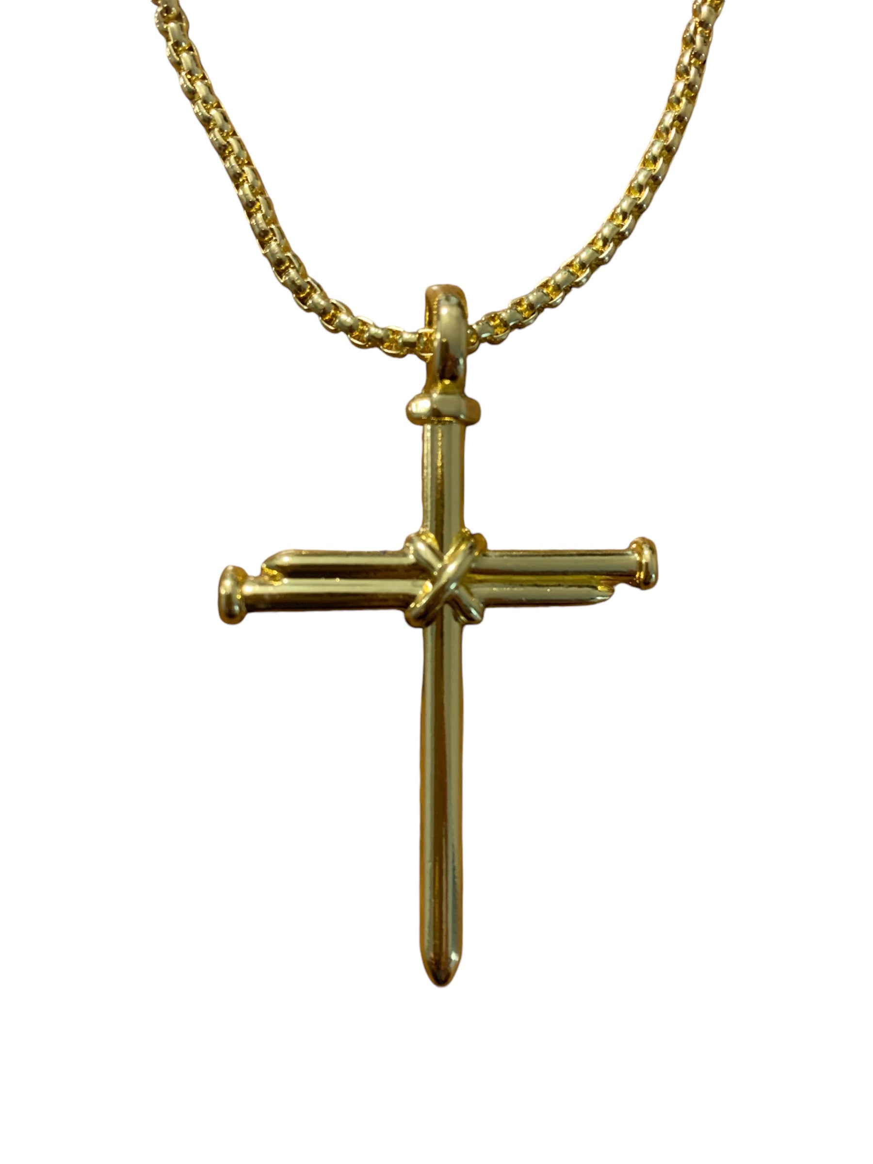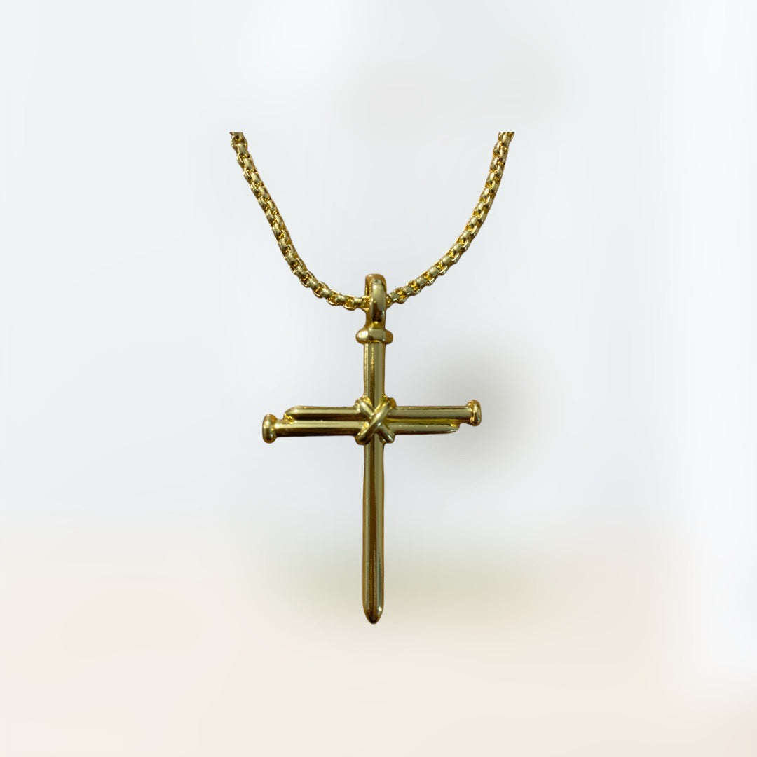 Nail cross stainless steel necklace. Choose from gold over steel, silver stainless steel or black stainless steel.