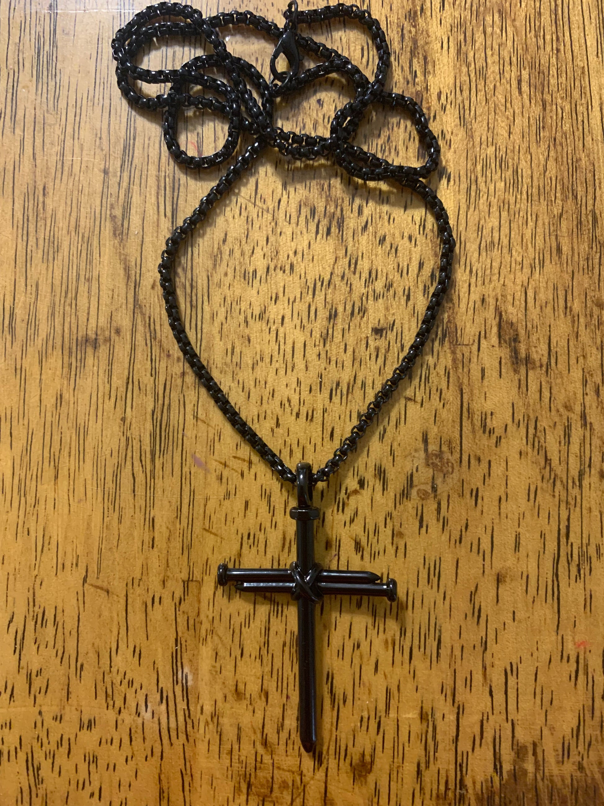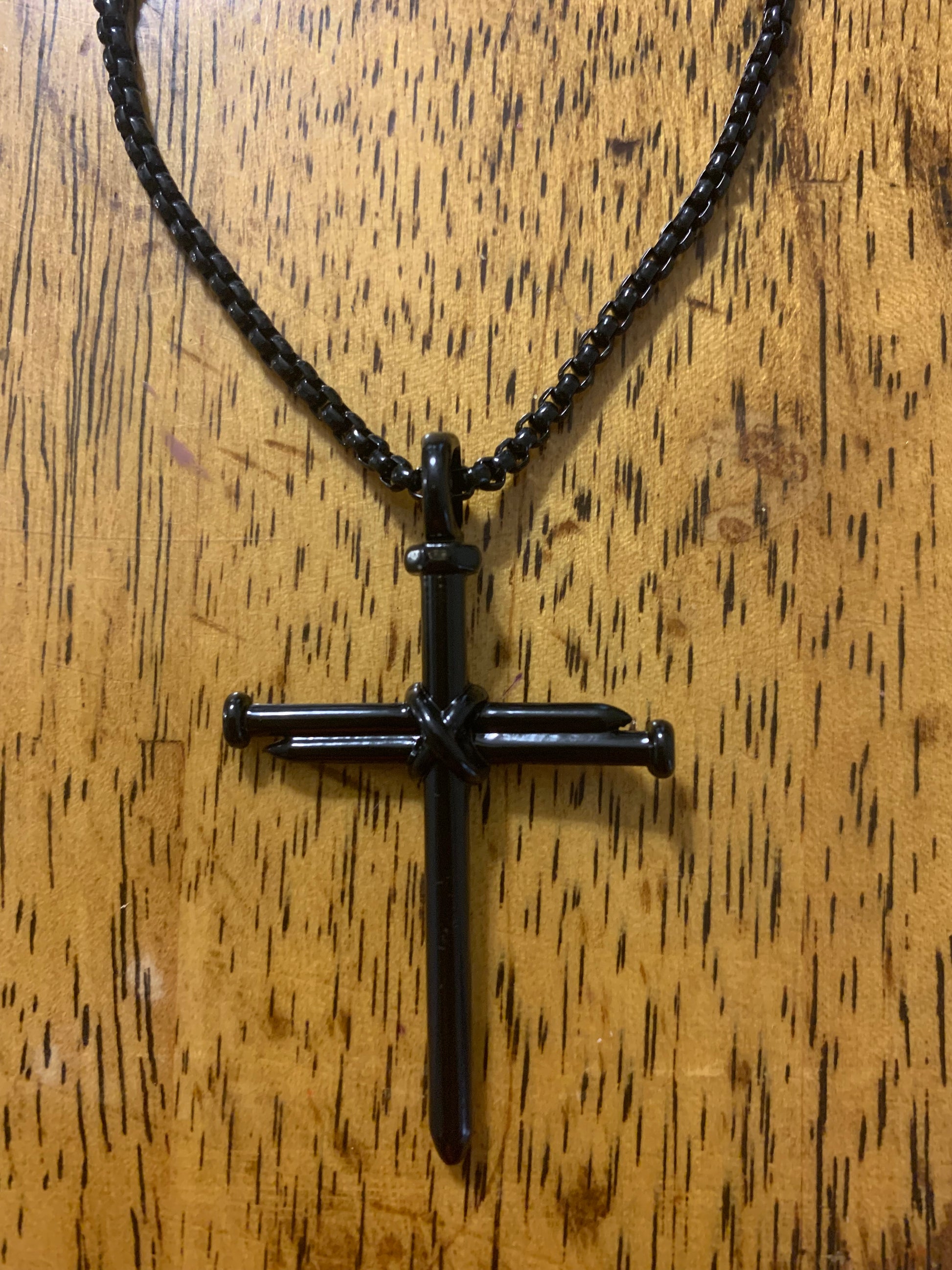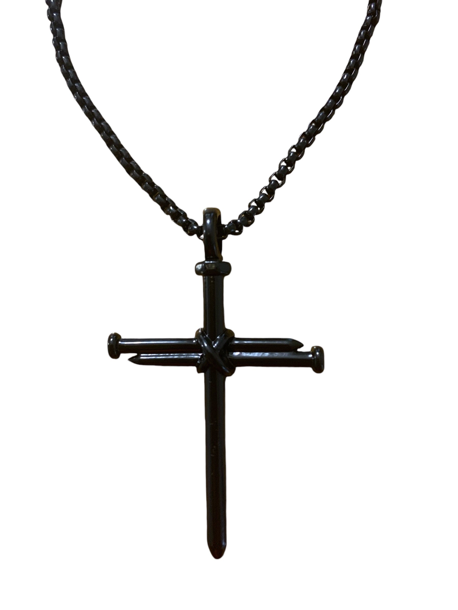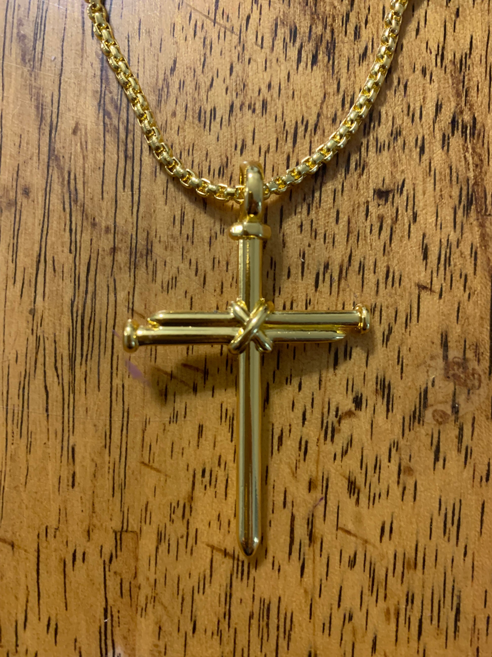 Nail cross stainless steel necklace. Choose from gold over steel, silver stainless steel or black stainless steel.