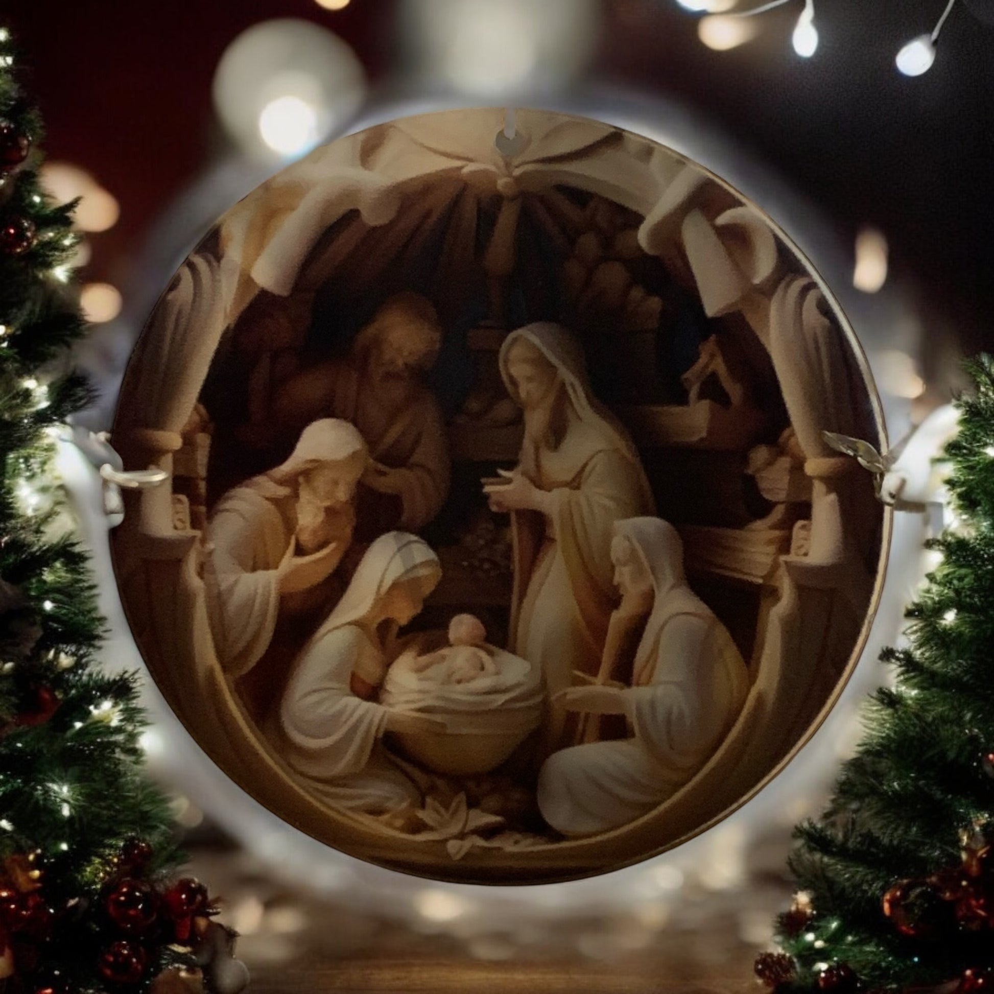 Nativity Acrylic Christmas Round Ornaments. These ornaments are 3 inches and 0.25 inches thickness. Acrylic.