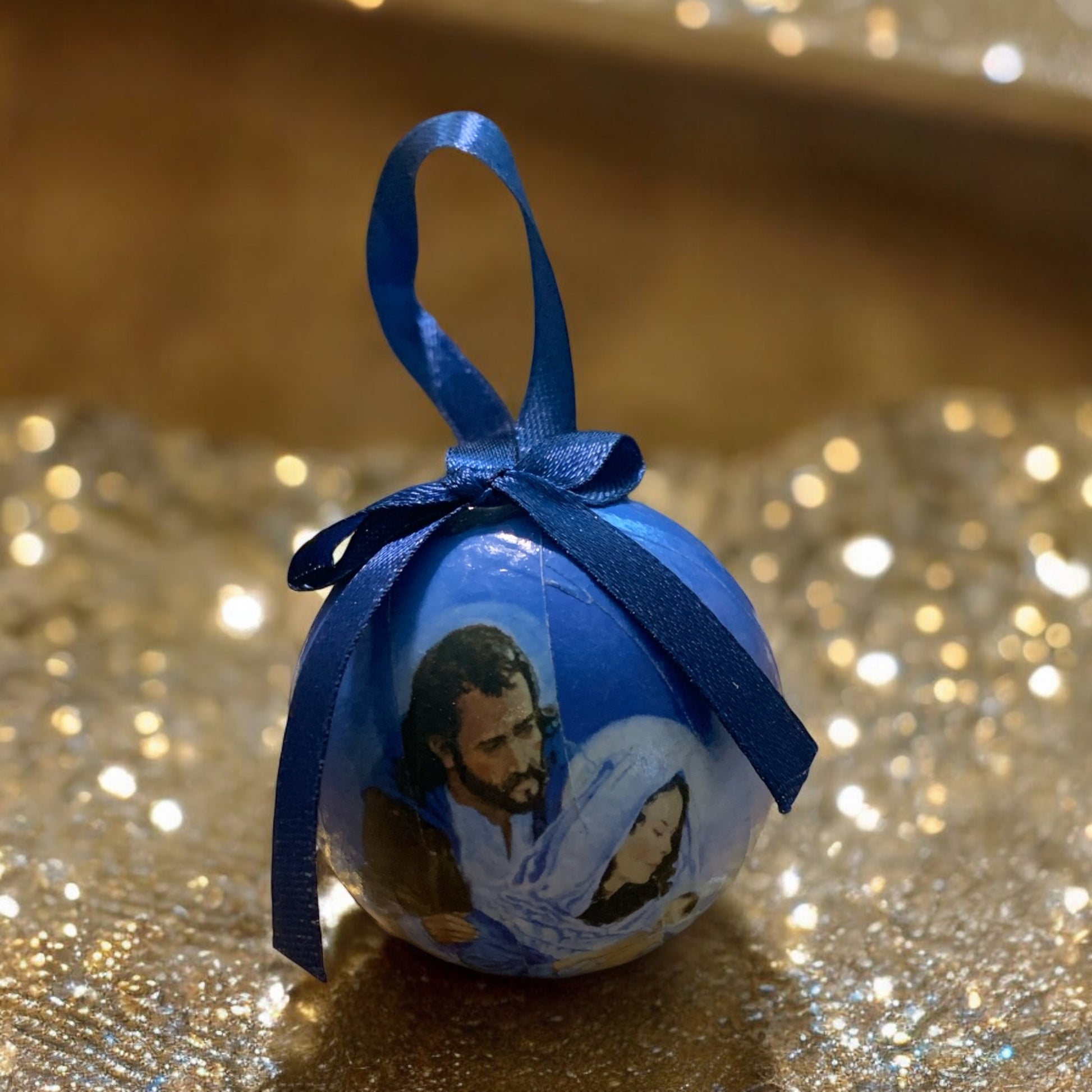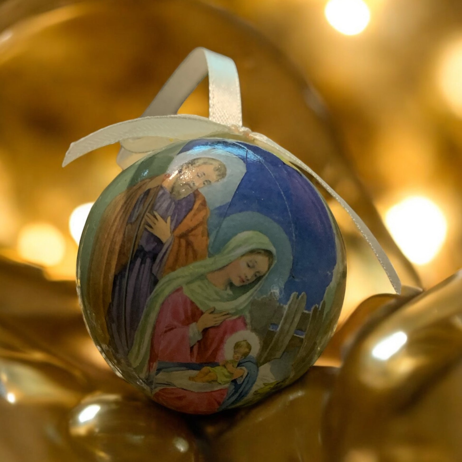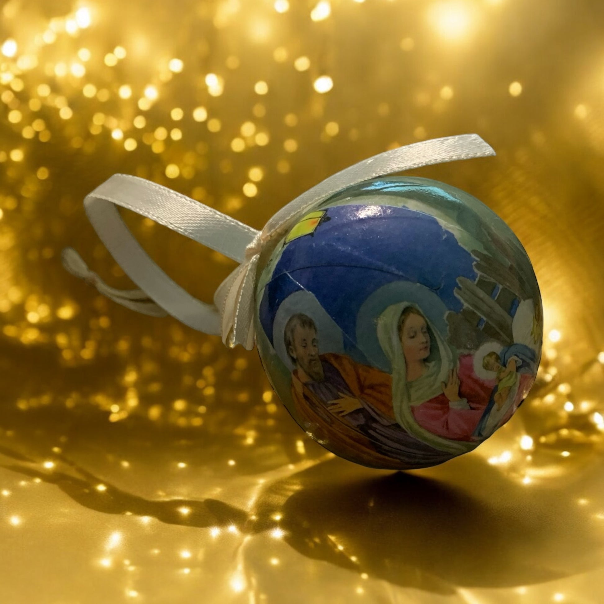 Nativity Scene Paper Globe Christmas Ornament. Scenes vary. Globe is 2 inches height x 2 inches wide.