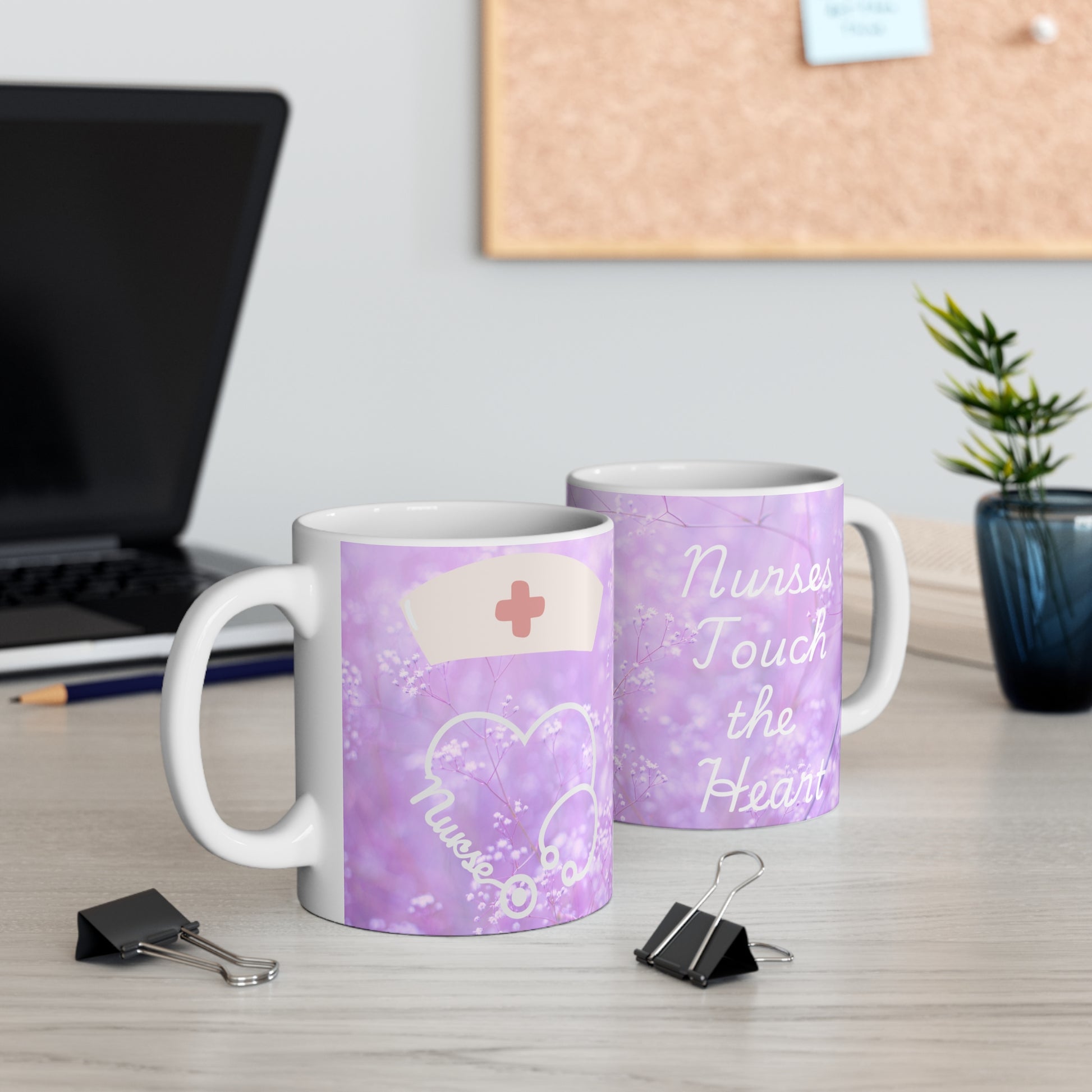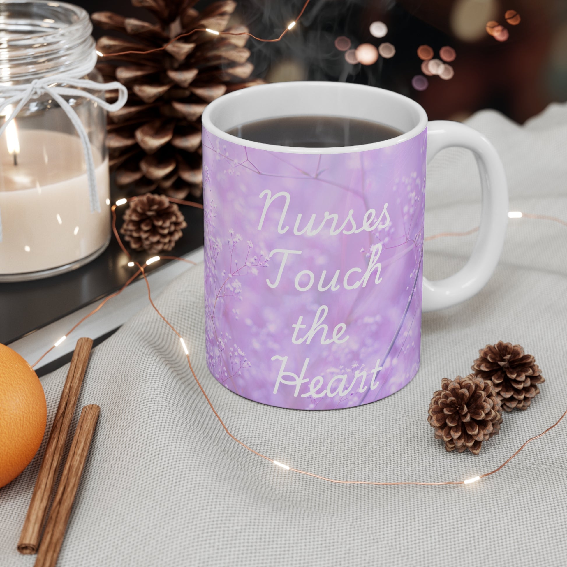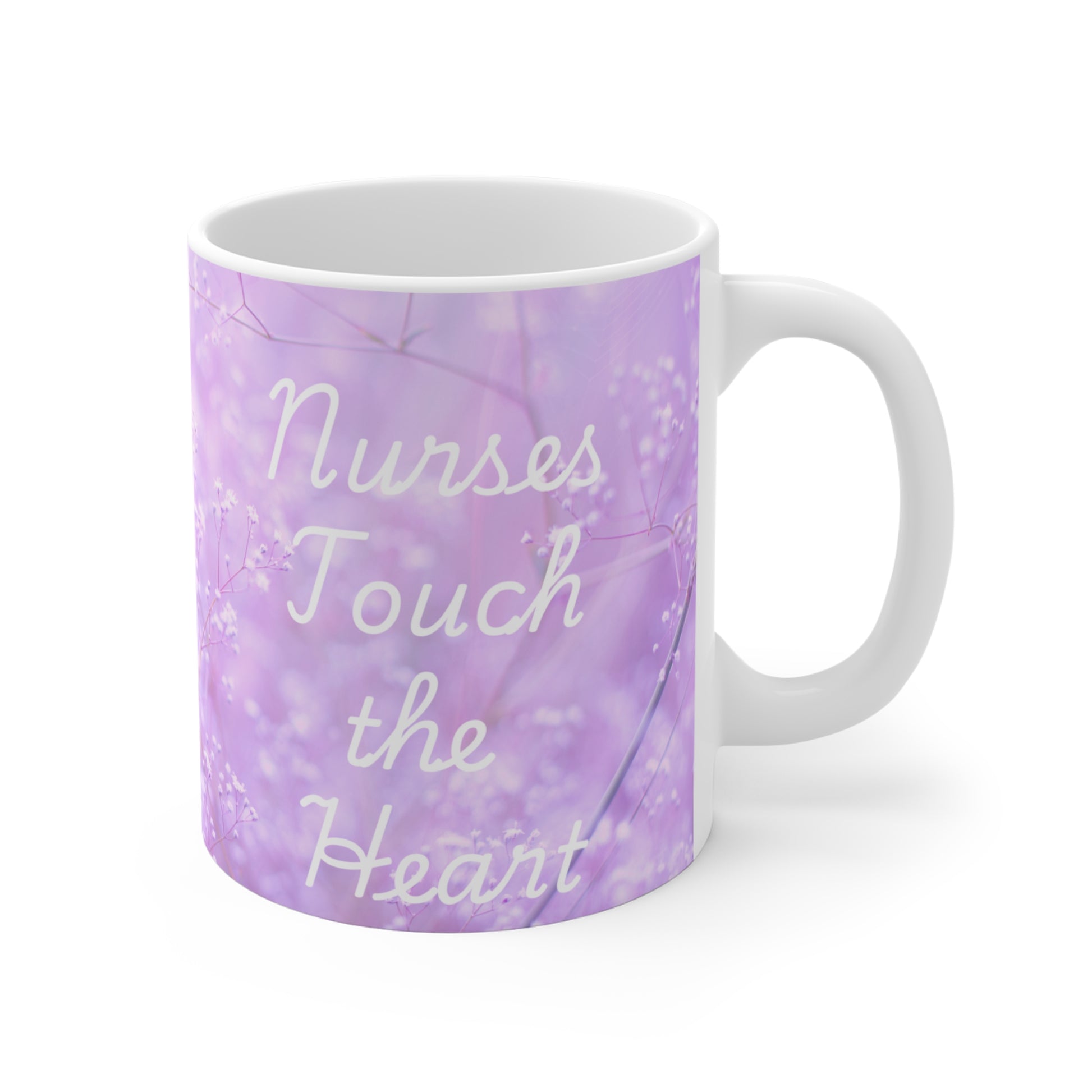 Nurses Touch the Heart Lavender Mug. This mug is great for coffee, tea and hot chocolate, this classic shape white, durable ceramic mug comes in the most popular size. High quality sublimation printing makes it an appreciated gift to every true hot beverage lover.