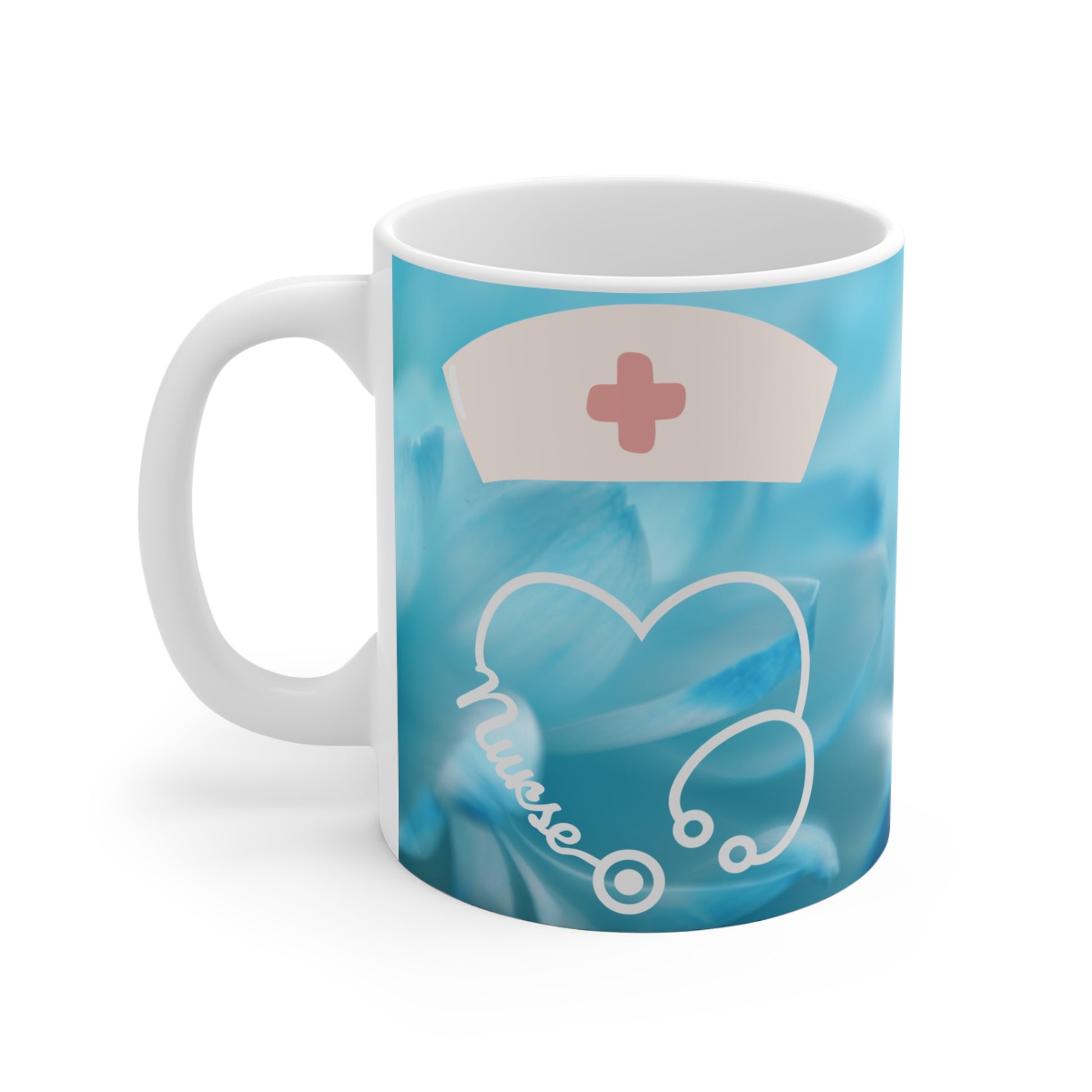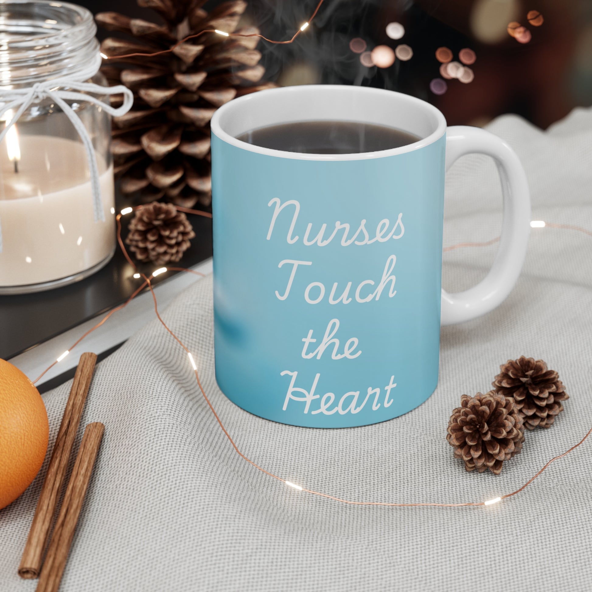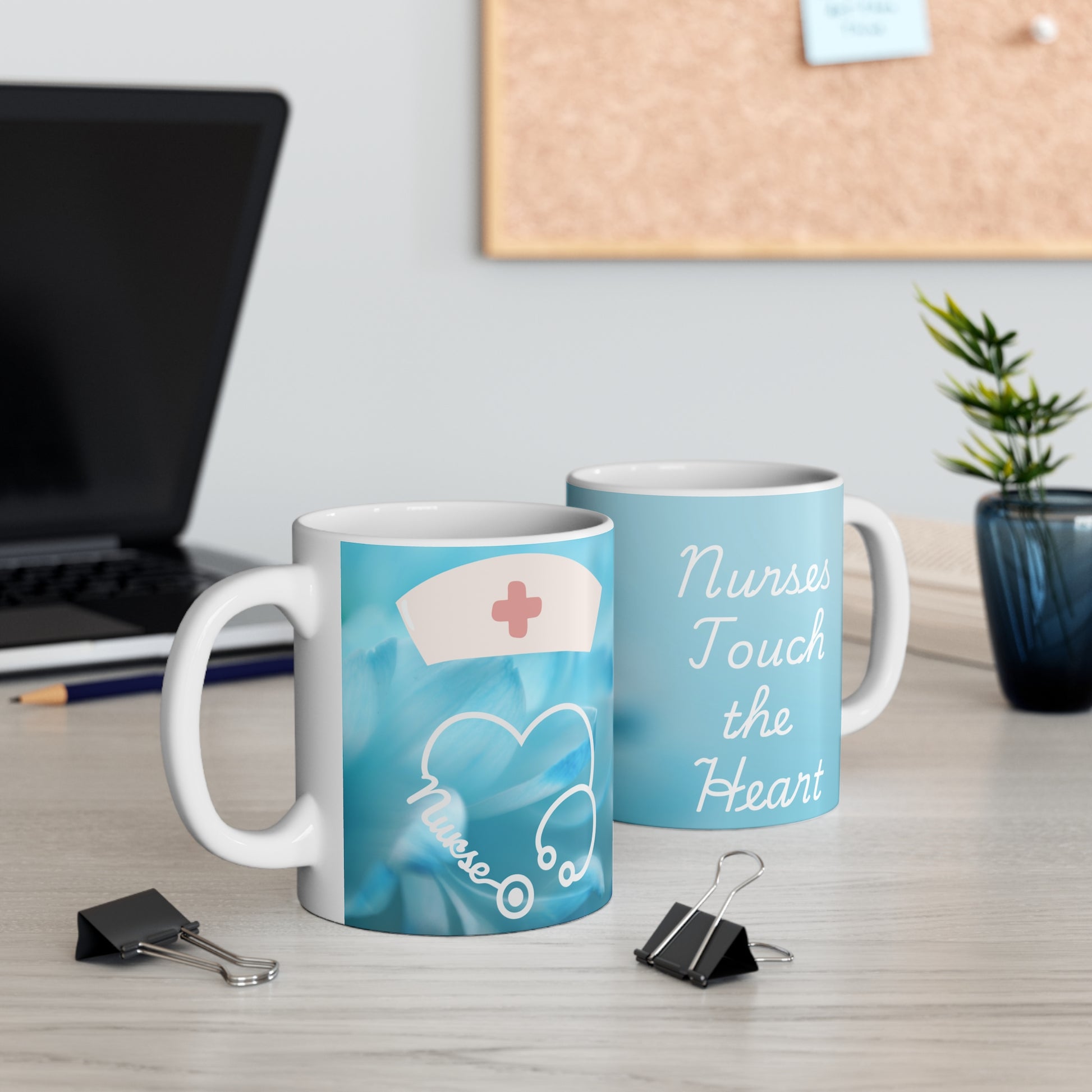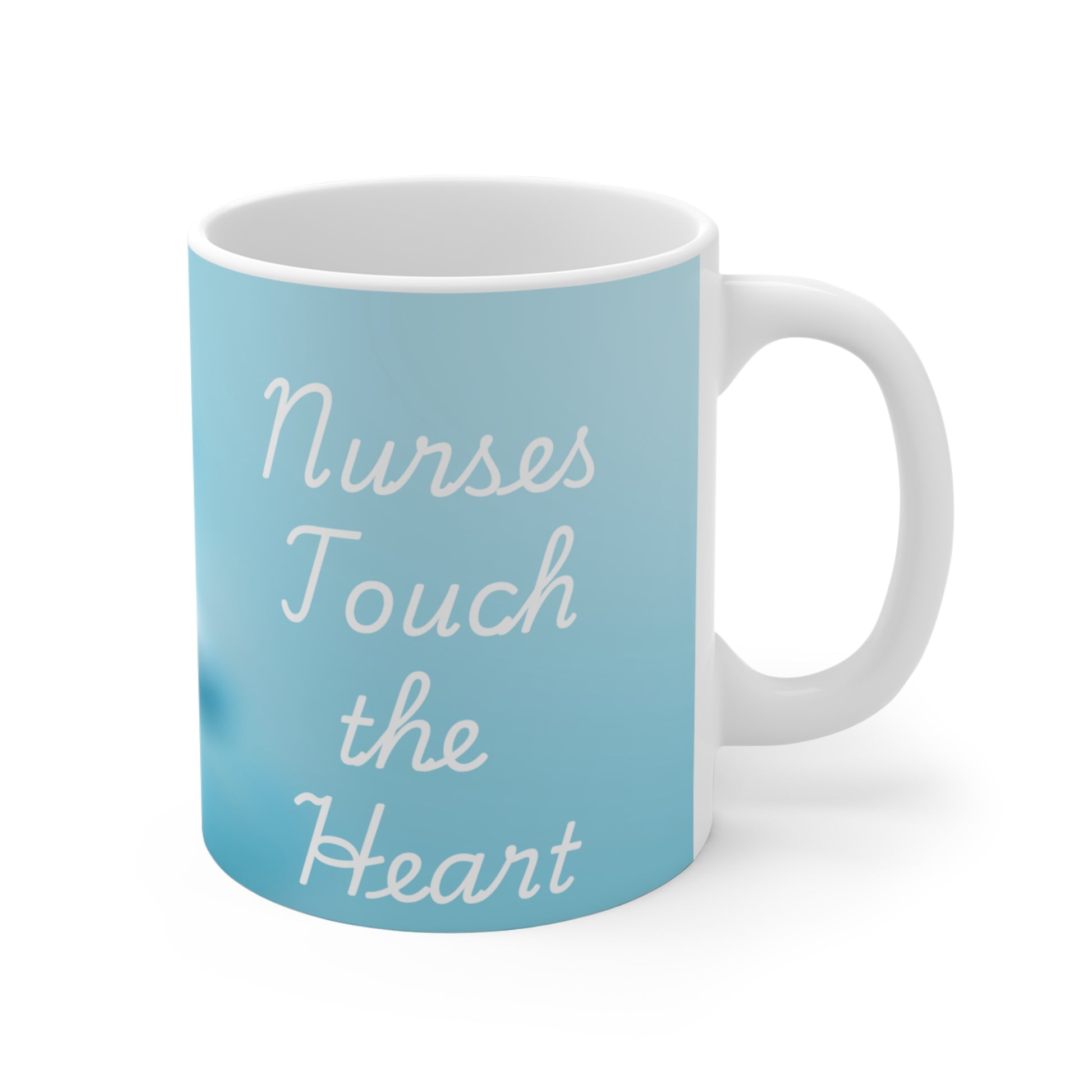 Nurses Touch the Heart Light Blue Mug. Perfect for coffee, tea and hot chocolate, this classic shape white, durable ceramic mug comes in the most popular size. High quality sublimation printing makes it an appreciated gift to every true hot beverage lover.
