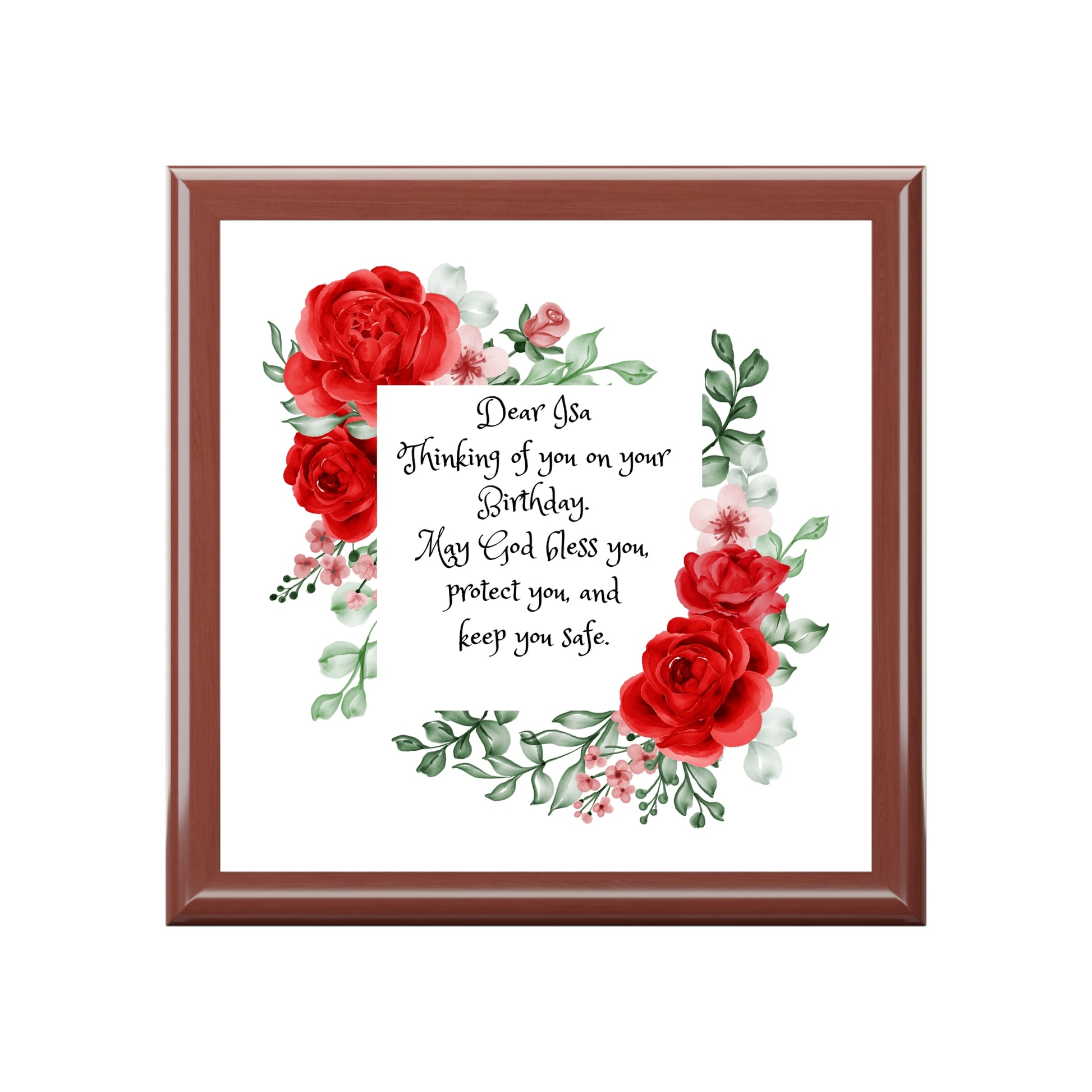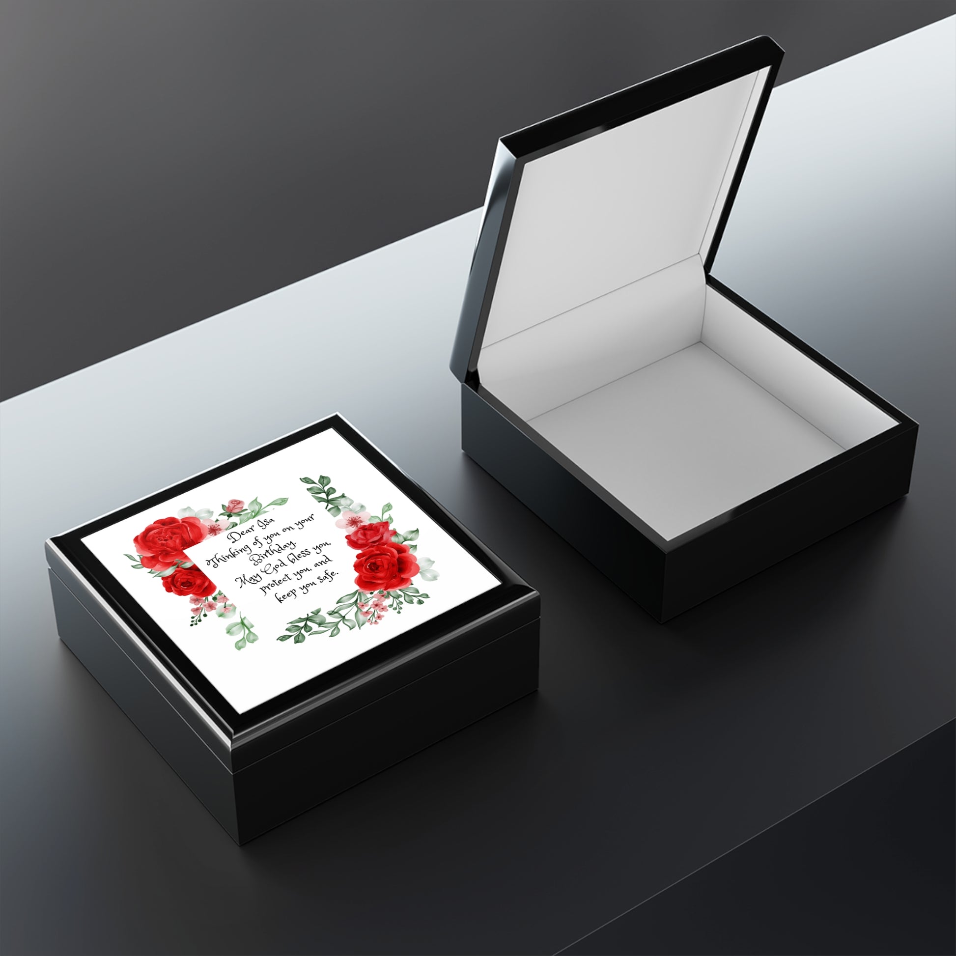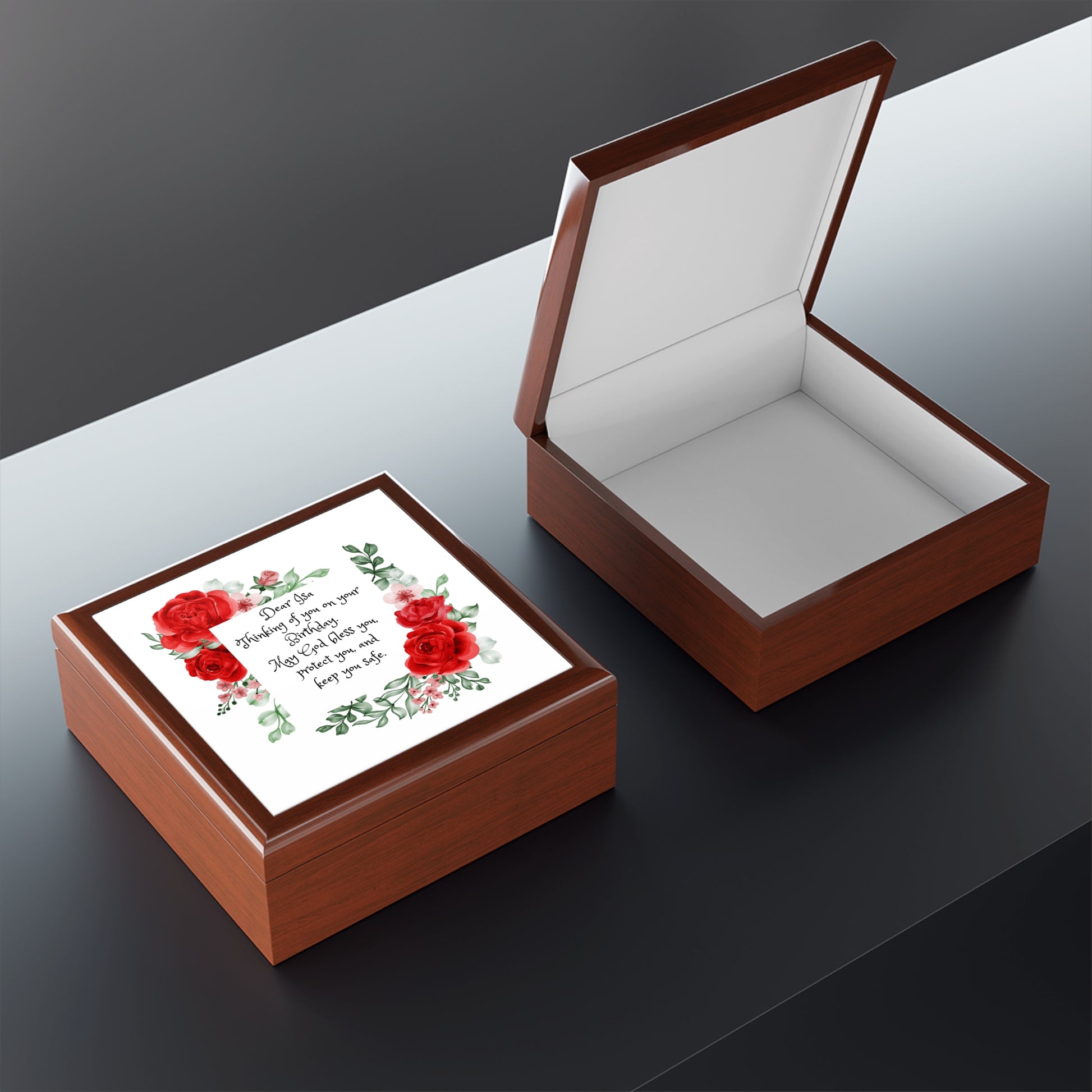 Personalized Birthday Prayer Jewelry Box. Keep all your valuables safe in custom style with this personalized jewelry box. Available in multiple colors, this jewelry box features dual hinges which lock at 90 degrees, an elegant glossy finish, and a soft interior lined with felt material. .: Glossy finish .: The box is made of high-quality rubberwood with a varnish finish .: Dual hinges which lock at 90 degree angle .: Interior lined with soft felt .: 6" x 6" (15cm x 15cm) decorated glossy sublimation ceramic tile fitted on top of the lid