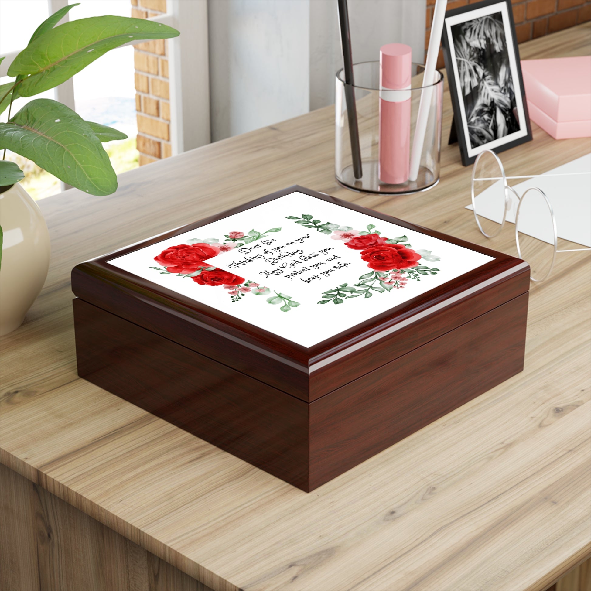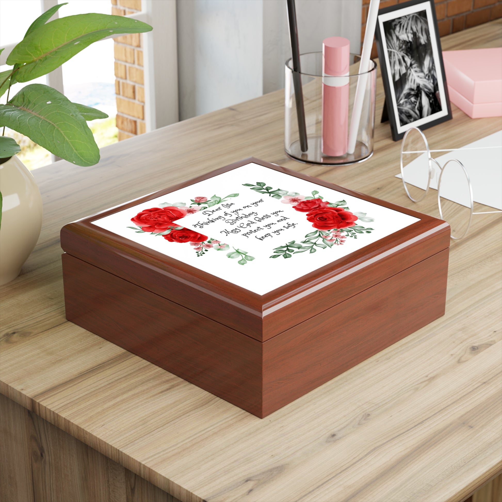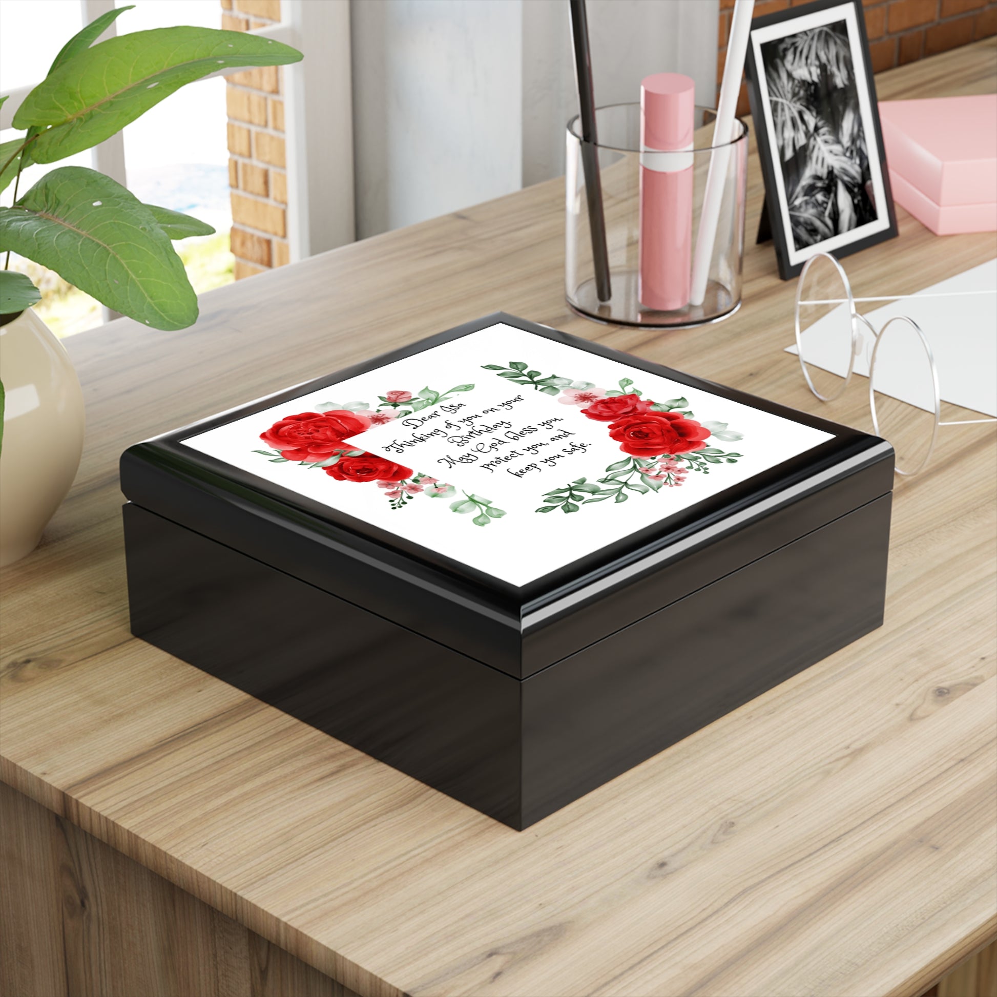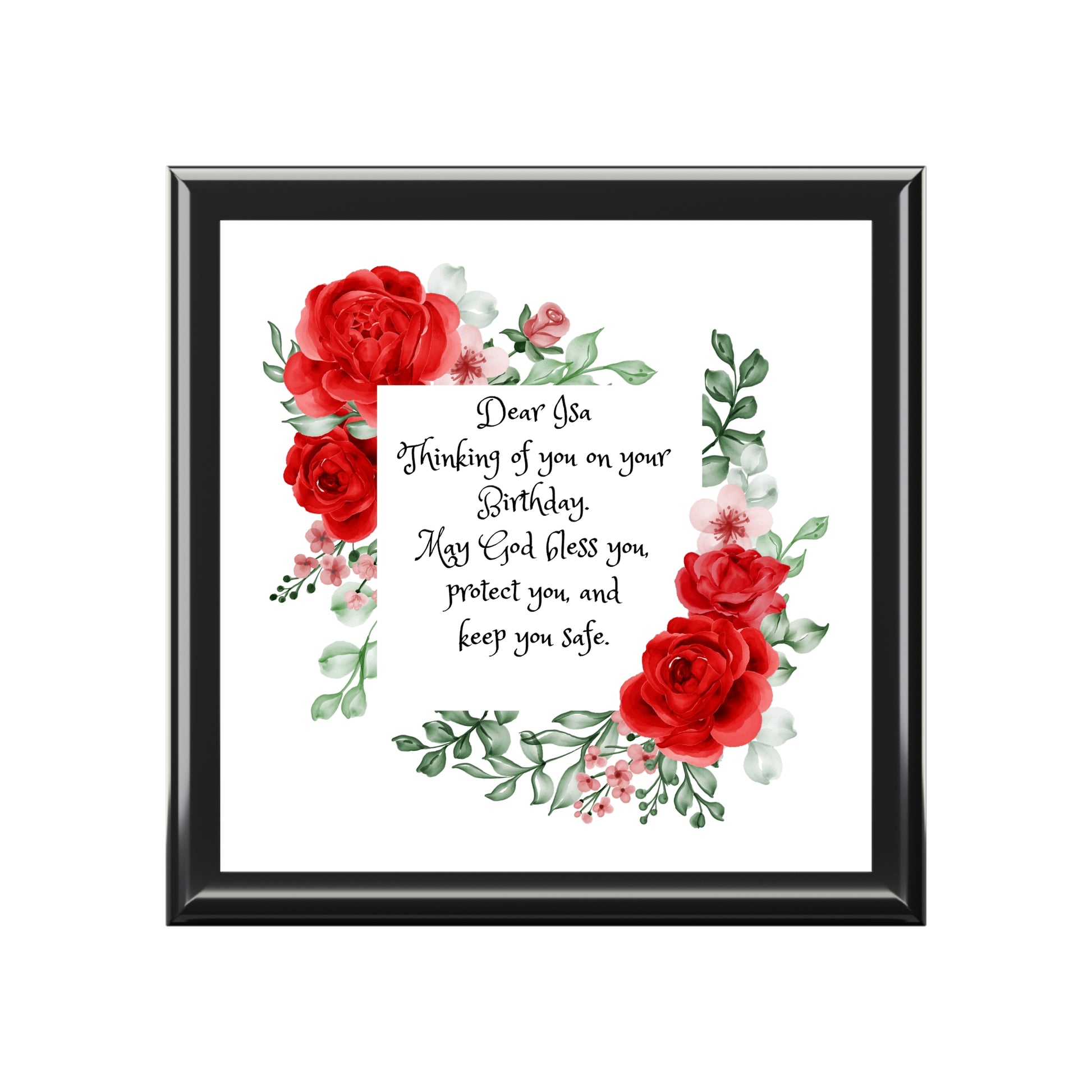 Personalized Birthday Prayer Jewelry Box. Keep all your valuables safe in custom style with this personalized jewelry box. Available in multiple colors, this jewelry box features dual hinges which lock at 90 degrees, an elegant glossy finish, and a soft interior lined with felt material. .: Glossy finish .: The box is made of high-quality rubberwood with a varnish finish .: Dual hinges which lock at 90 degree angle .: Interior lined with soft felt .: 6" x 6" (15cm x 15cm) decorated glossy sublimation ceramic tile fitted on top of the lid
