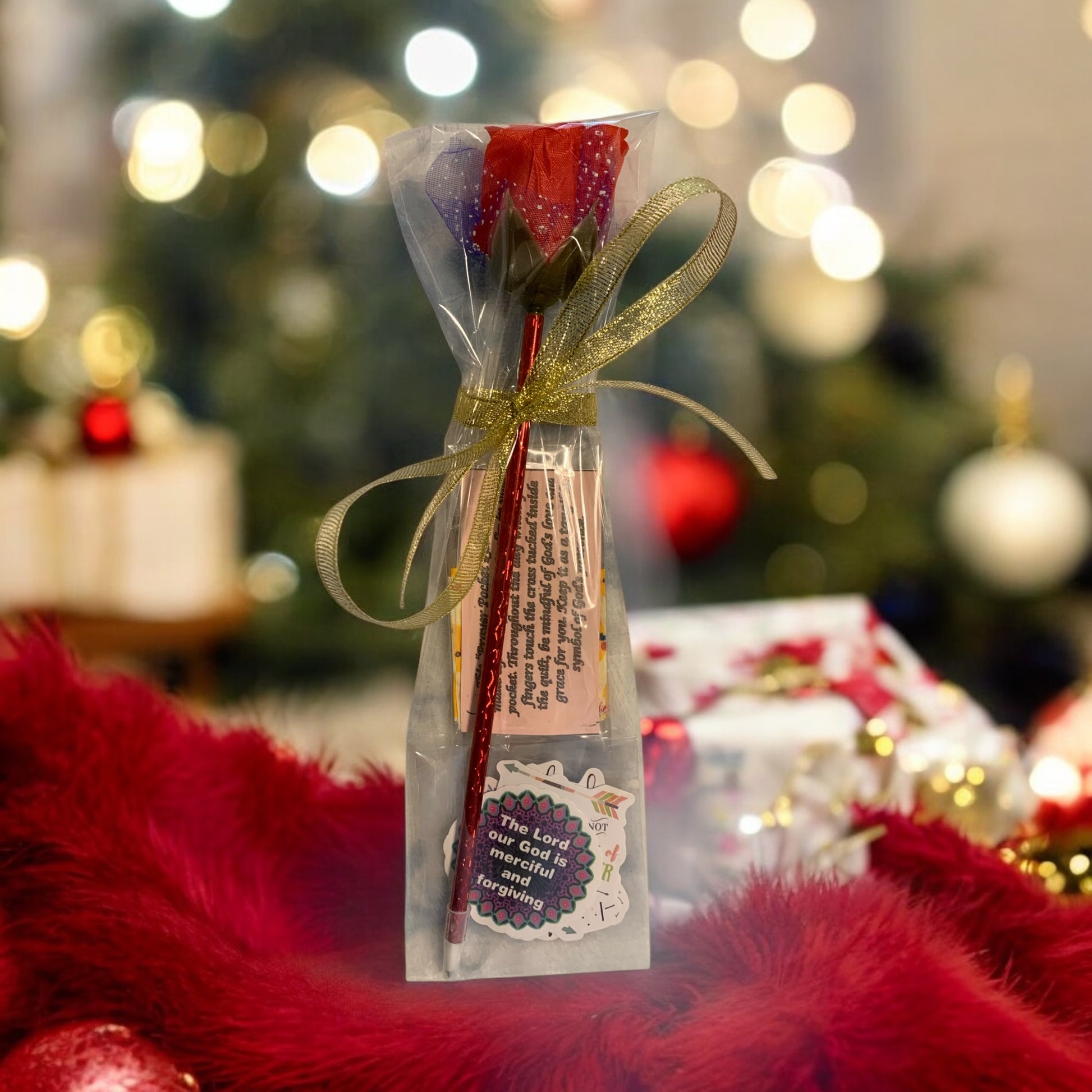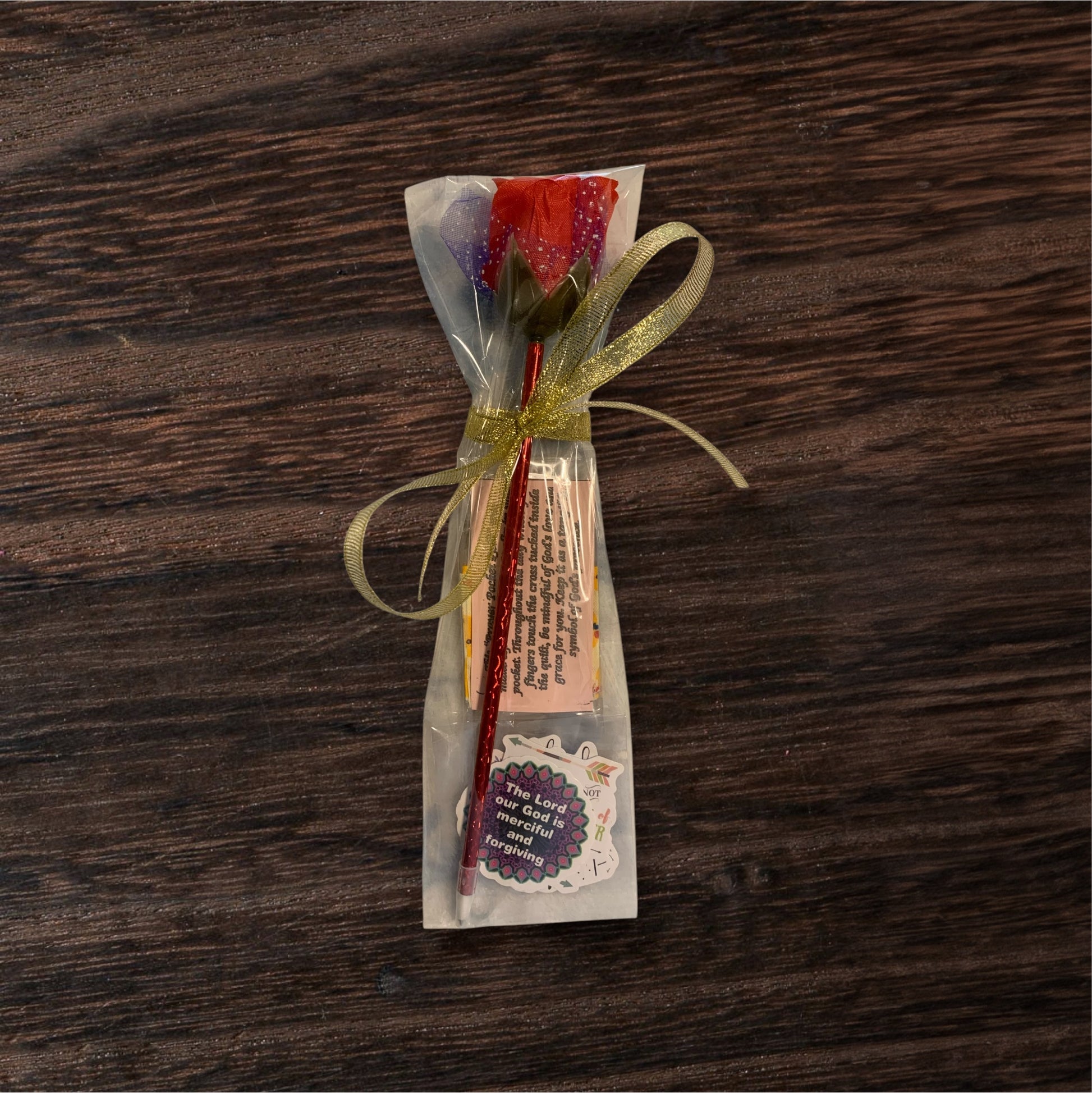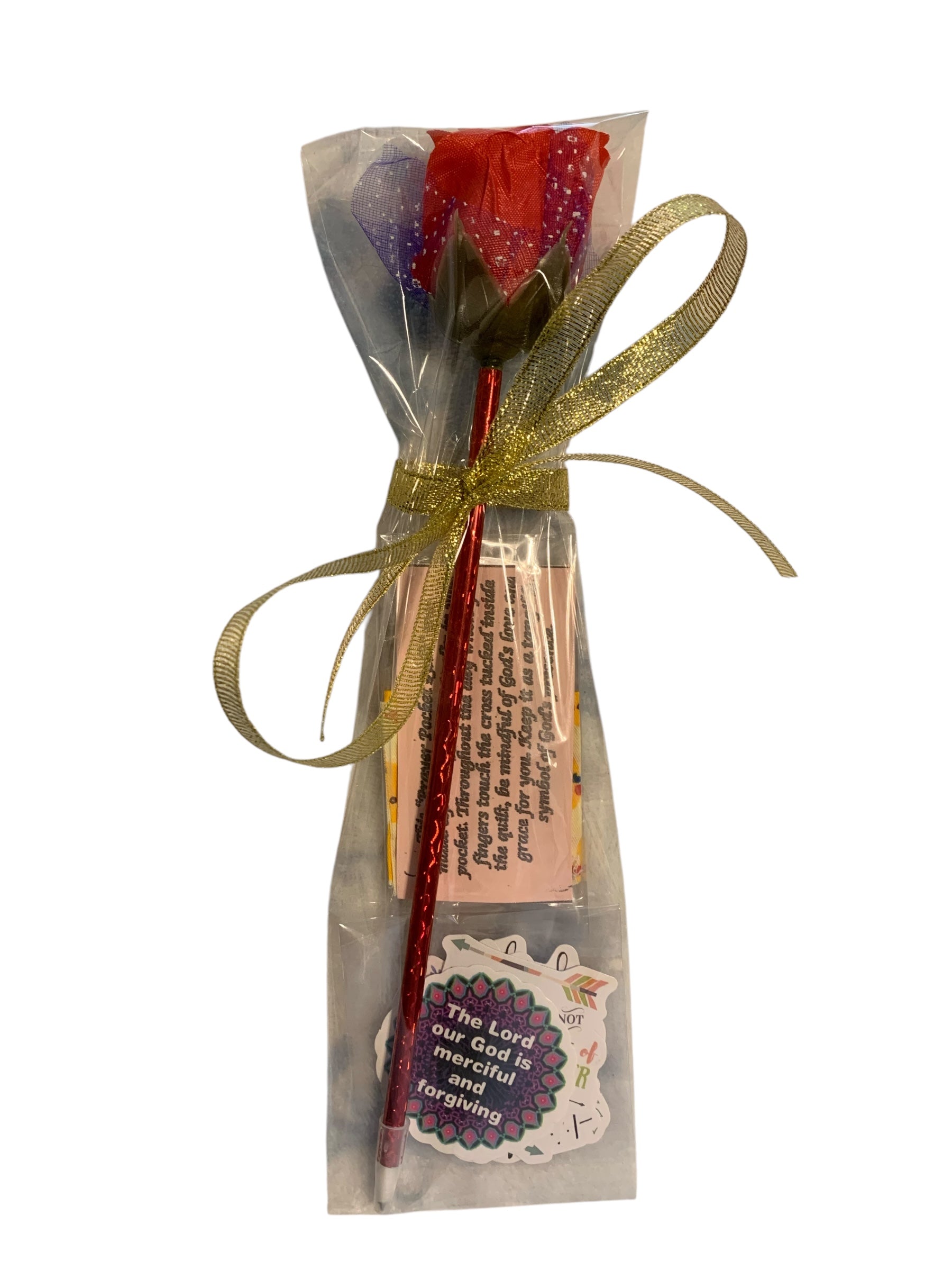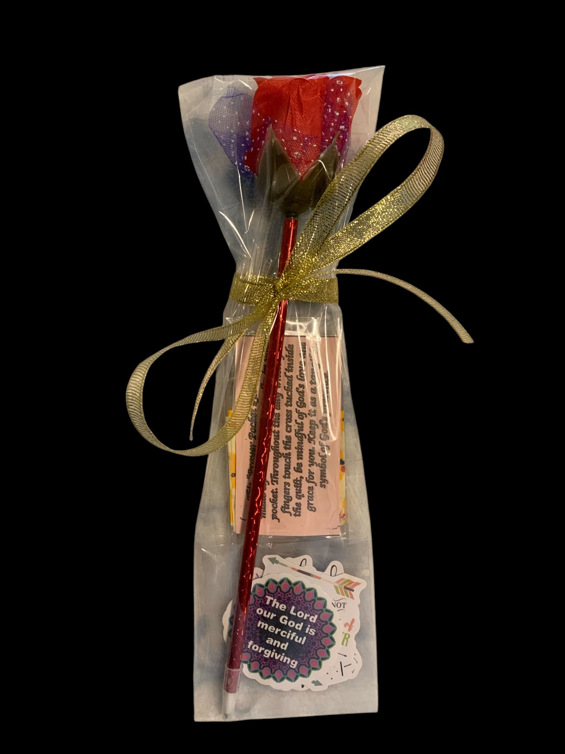 Includes: rose pen, 5 inspirational Christian based stickers, handmade 2 x 2 inch prayer quilt with wood cross on inside, prayer card.