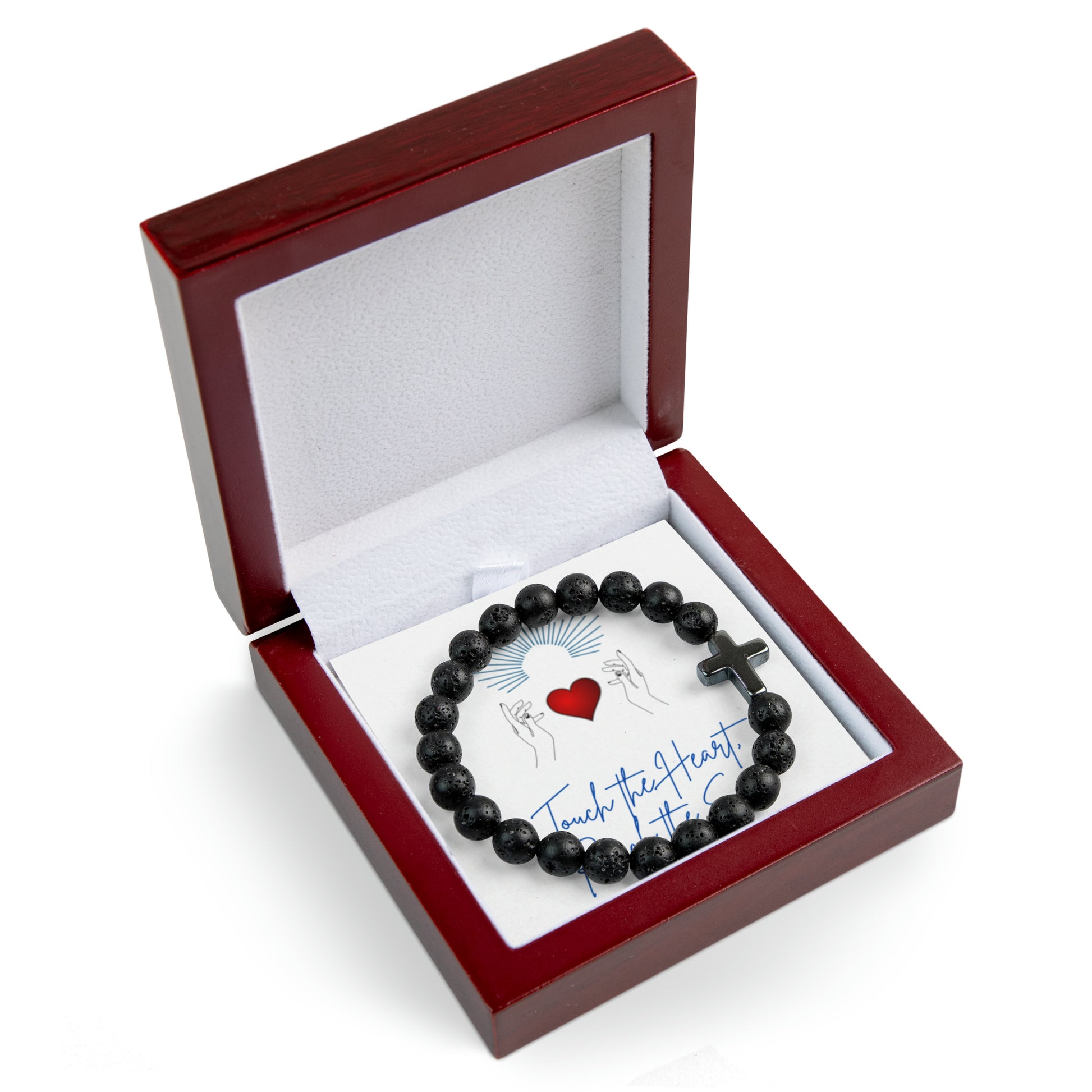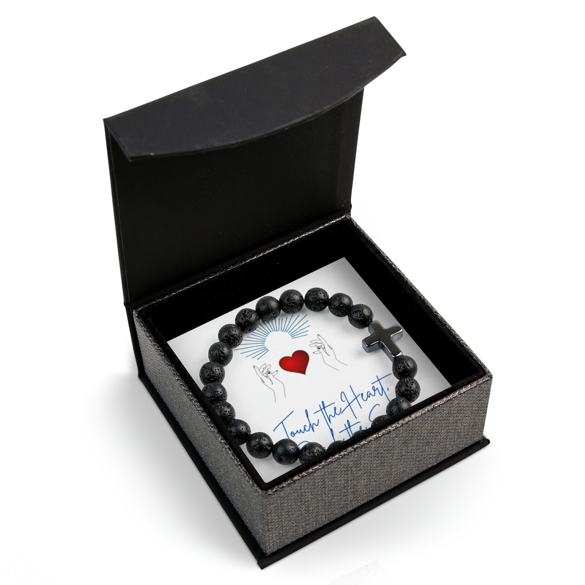 Touch the Heart Jewelry Box with Cross Bead Bracelet. Created for the perfect gifting experience, this cross bead bracelet comes in one size featuring a 14mm by 17mm magnetite stone charm surrounded by 8mm volcanic beads. Each custom bead bracelet comes with a customizable message card (front and back print available) and has 3 beautiful gift box options: LED, Textured Magnetic or Brown PU.