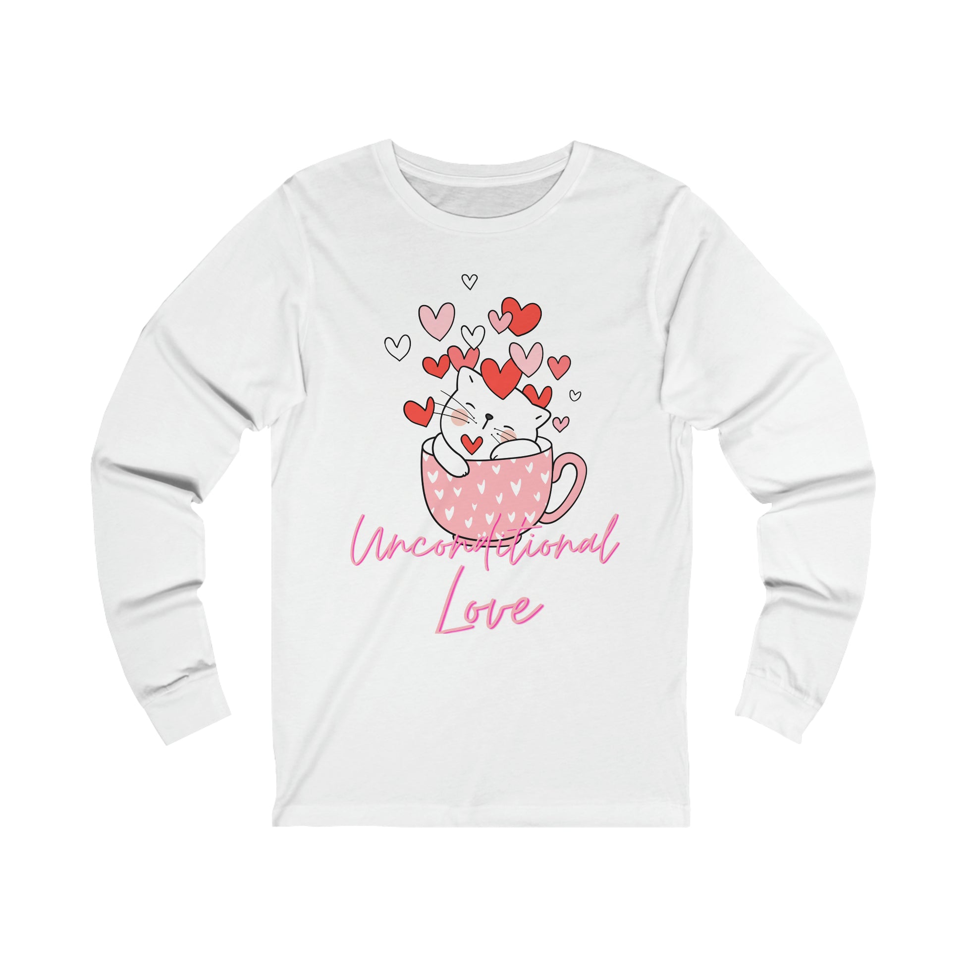 Unconditional Love Cat in a Mug Long Sleeve Tee. This classic unisex long sleeve tee fits like a well-loved favorite. Casually elegant with an excellent quality print, it is an irreplaceable everyday item for anyone.