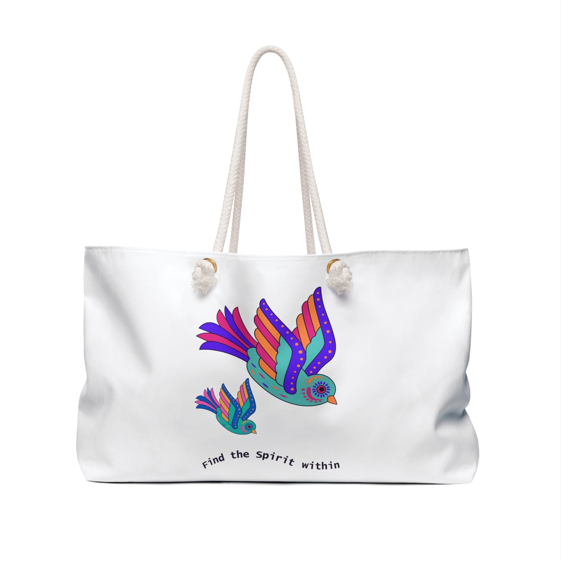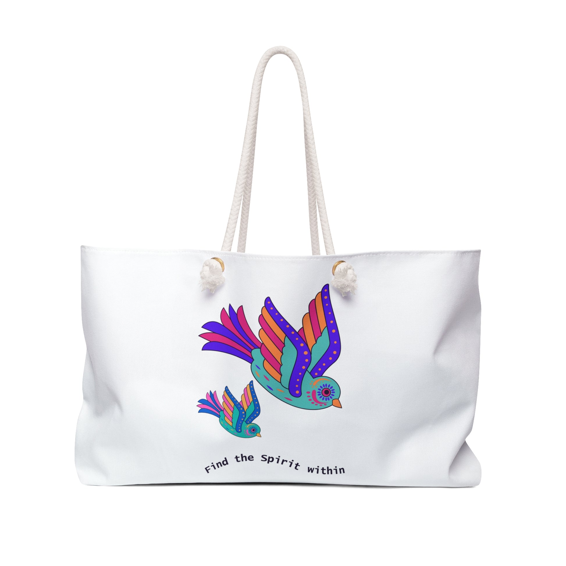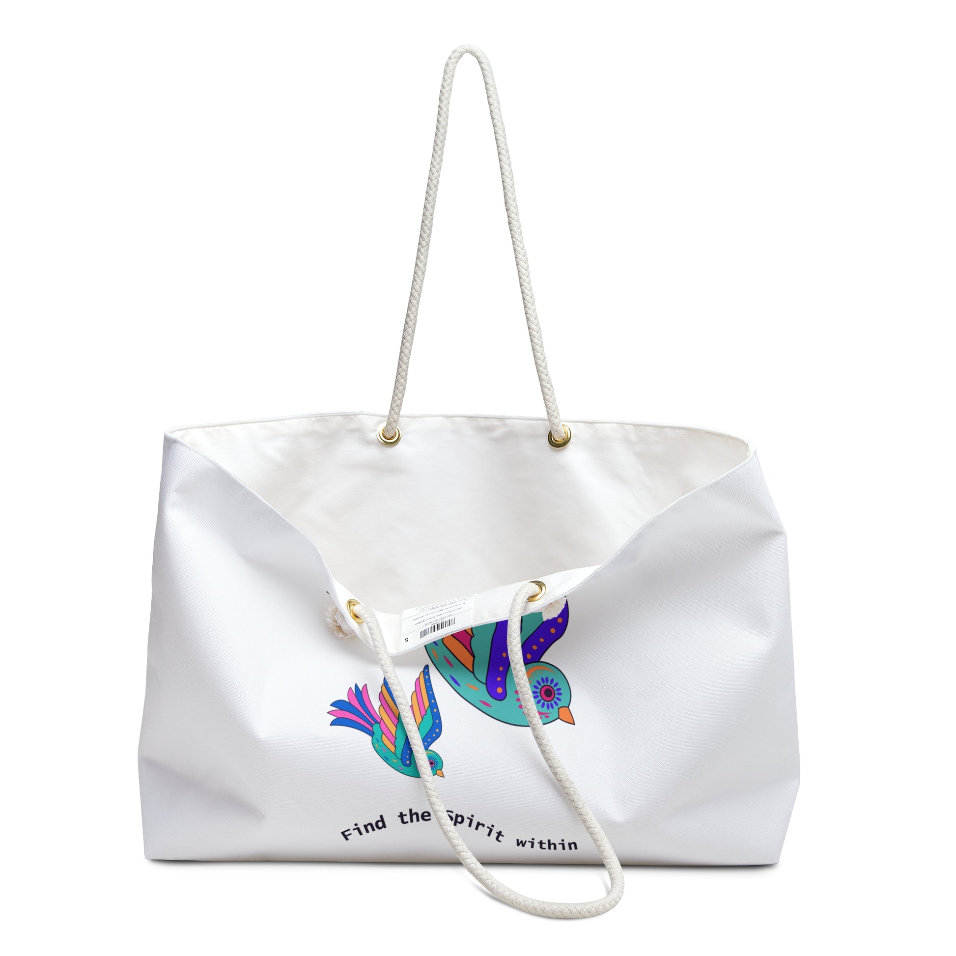 FIND THE SPIRIT WITHIN WEEKENDER BAG. Our oversized Weekender Tote is perfect for your weekend at the beach or in town. The wide-mouthed, durable bag holds a generous amount of personal items and is easily held by its thick rope handles.
